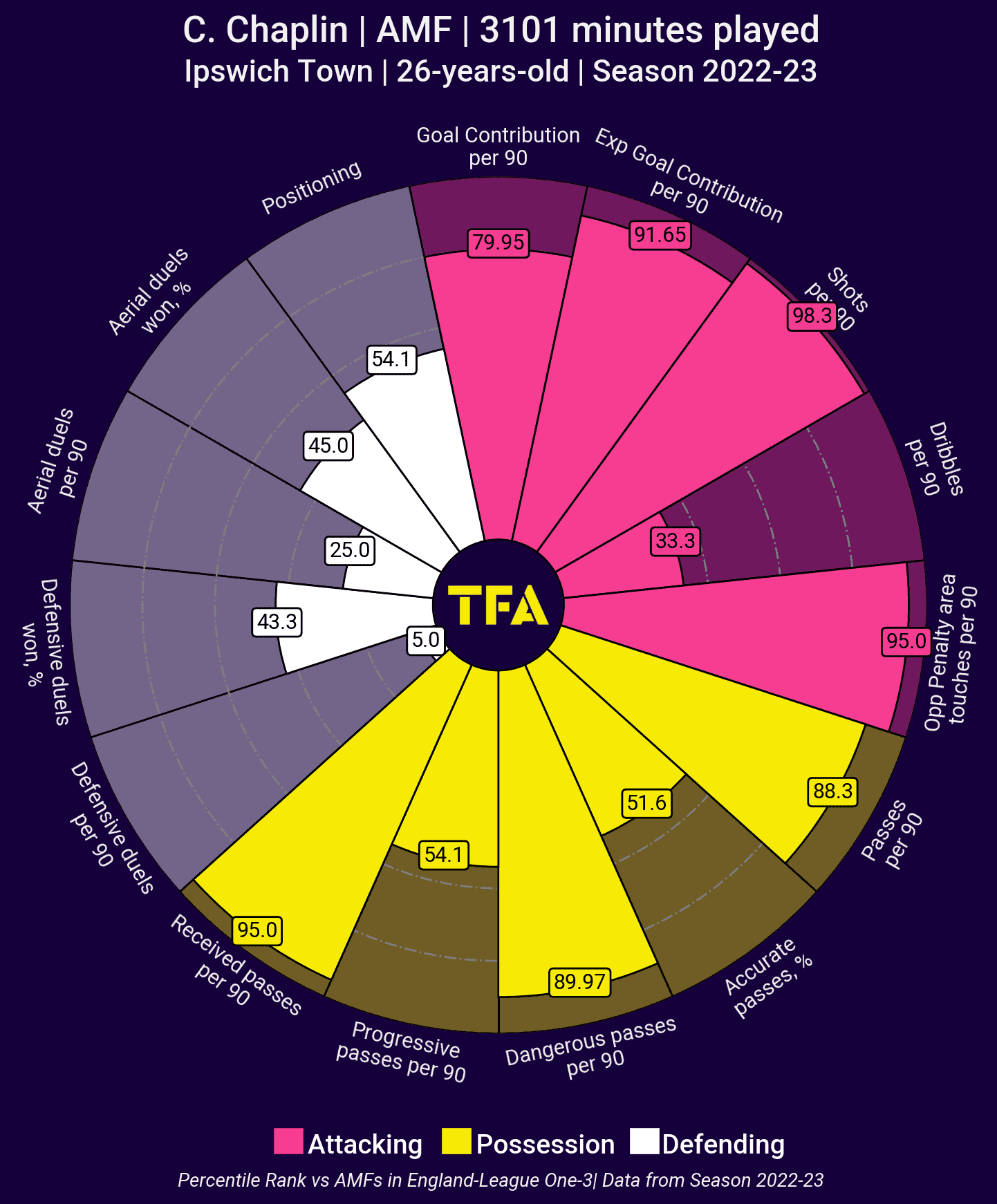 There have been a number of players who have played an equally important part for them this season, but one player who has stood out is attacking midfielder Conor Chaplin. The below visualisation shows where the 26-year-old midfielder ranks for some of the key metrics when compared with players who play in a similar position in League One.