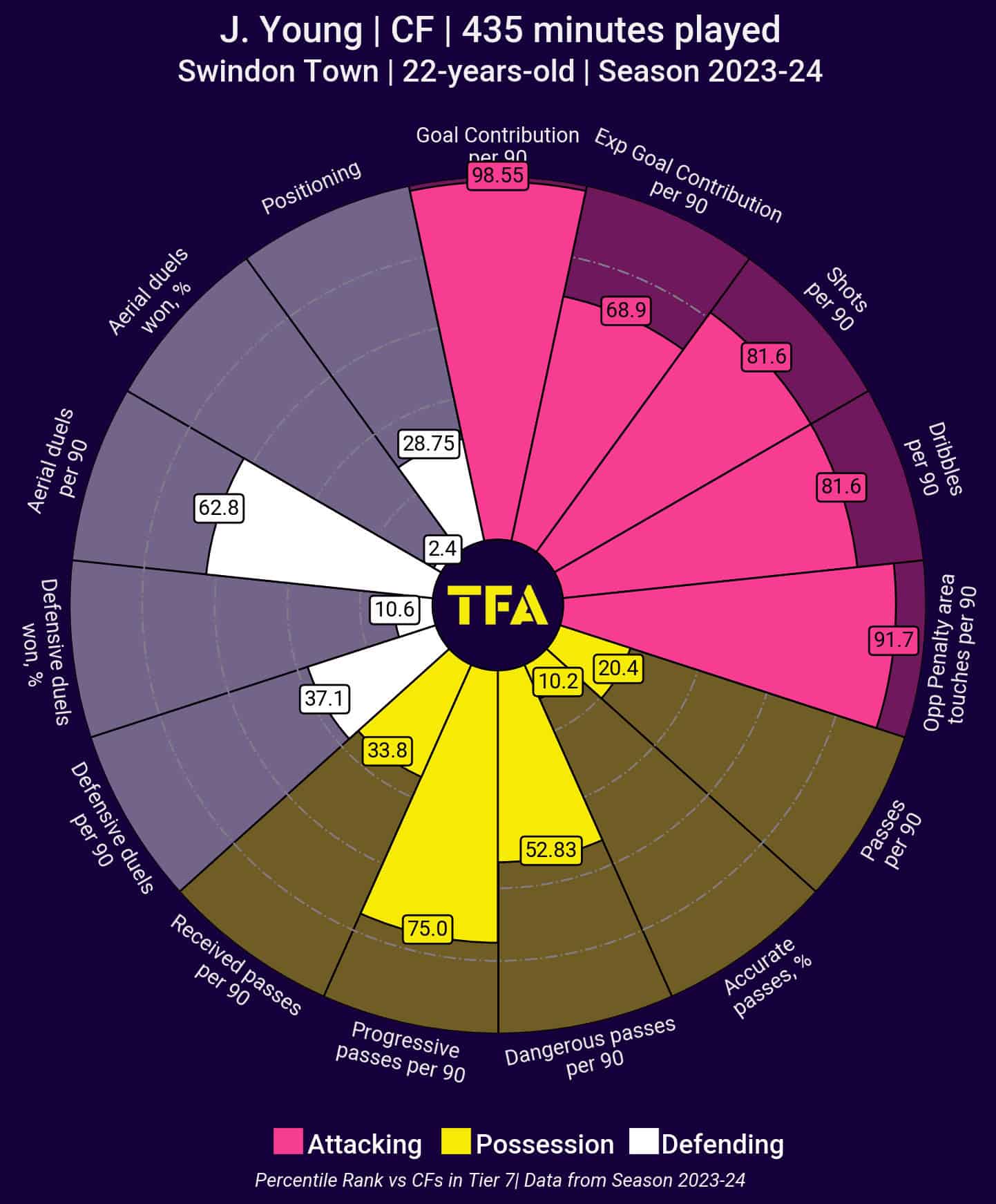 Jake Young also has two assists to his name from an xA of 0.27. His four goals and one assist in one game against Crawley Town is the season’s performance so far in all of English football.