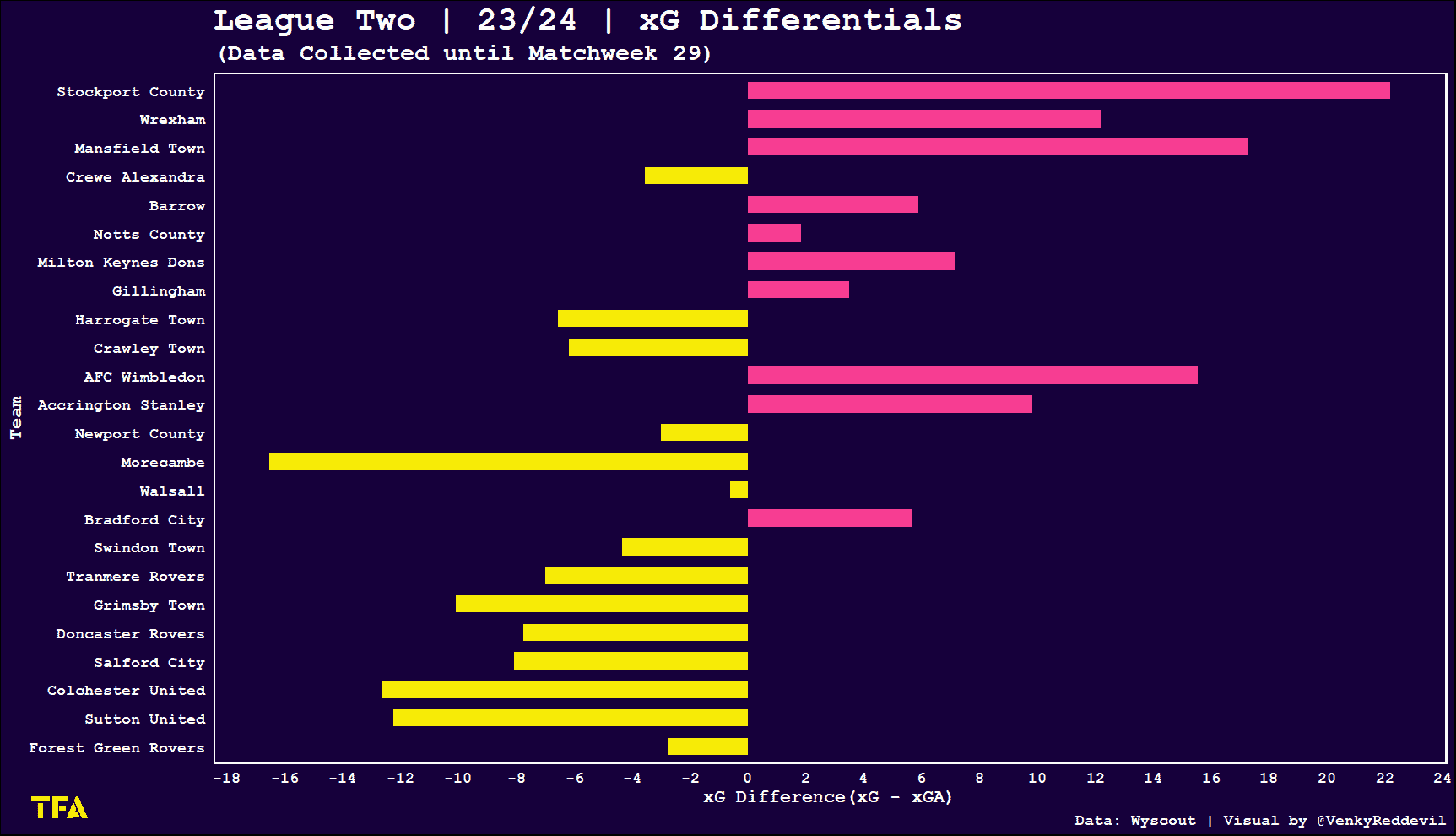 Mansfield Town (+17.29), AFC Wimbledon (+15.55) and Wrexham (+12.22) are the only other teams with a double-digit positive xG difference.