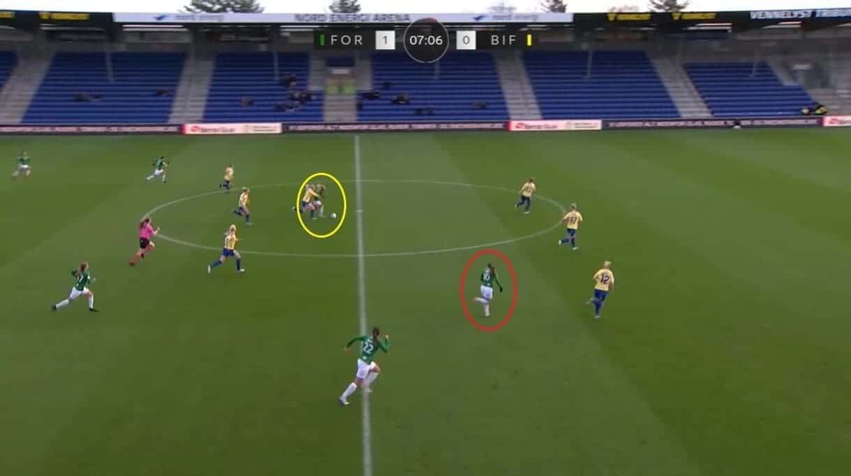 We already know that Snerle puts herself into areas where she can help to build attacks, but she also positions herself well in her team’s own third, playing a key role in their transitional play. Here, her teammate is looking to launch an attack, but Brøndby have come to close her down, so Snerle comes back to help out, as the red arrow illustrates. Her presence gives Fortuna a safer passing option, as moving the ball across a smaller distance would enable Fortuna to keep possession, whereas an aerial pass would allow Brøndby to get underneath the ball and clear their lines.