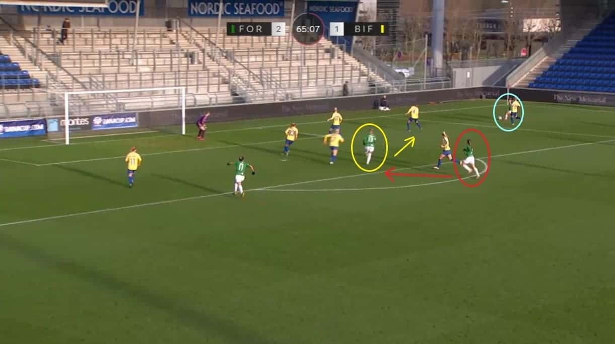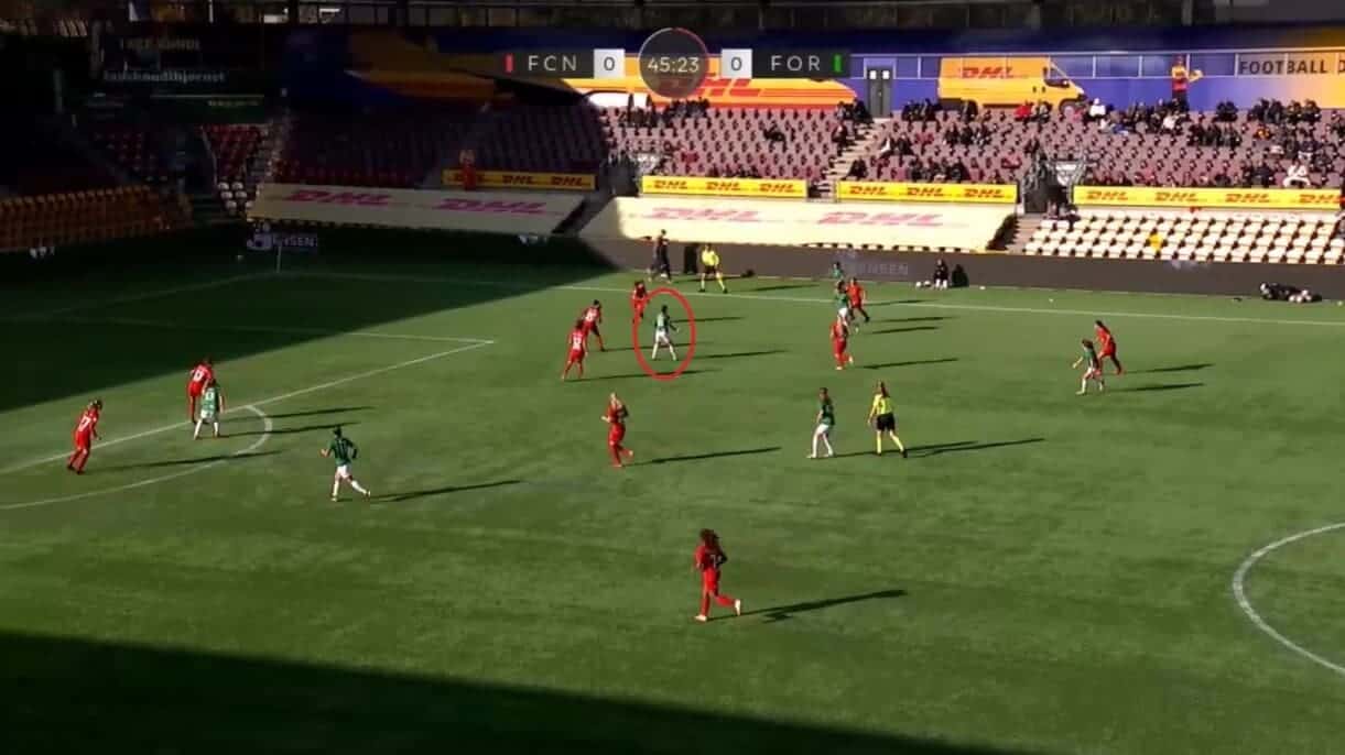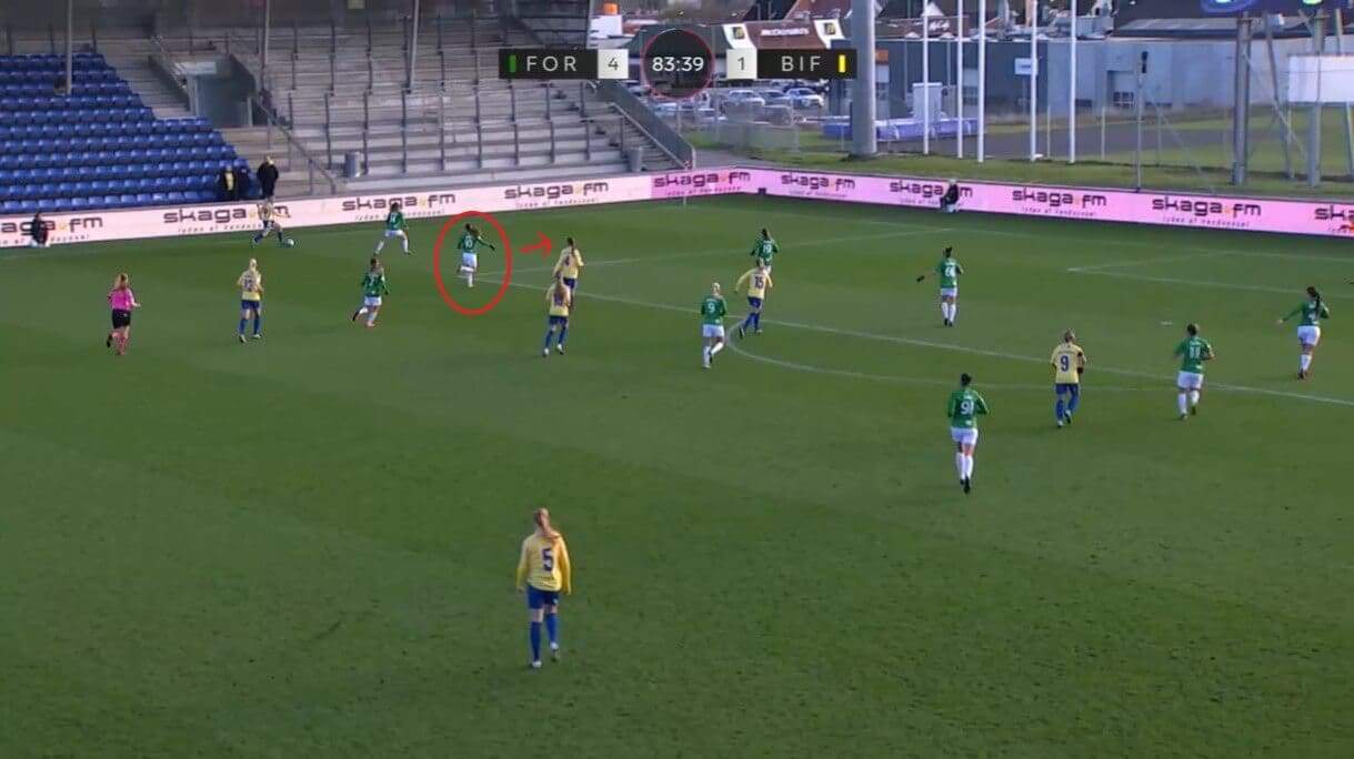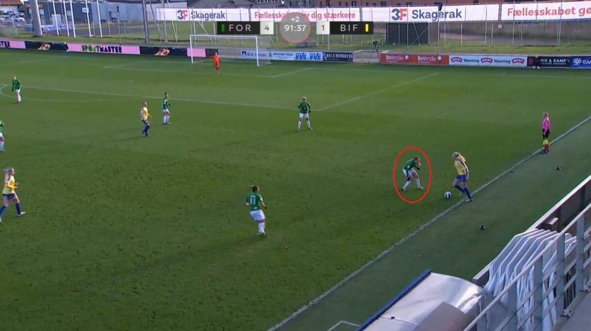 One of her most notable qualities is her spatial awareness. Fortuna like their players to move around and create options, which is helped by their tendency to use Snerle and Olivia Holdt as their forward line. With both being attacking midfielders, they don’t stay at the top of the pitch as strikers do, but drop back and try to link up the play, which helps Fortuna to keep their attack flowing. In this case, Snerle has run ahead of the ball to provide Holdt with a forward passing option, as well as keeping the three defenders ahead of her away from the ball. This not only allows Holdt to keep Fortuna’s momentum going but also gives her time to make her pass accurate; neither of these would happen without Snerle being in this area of the pitch.