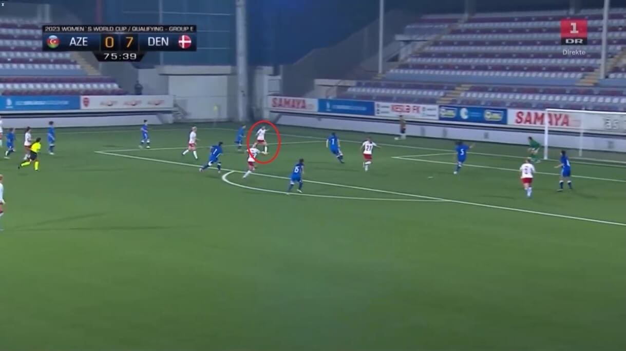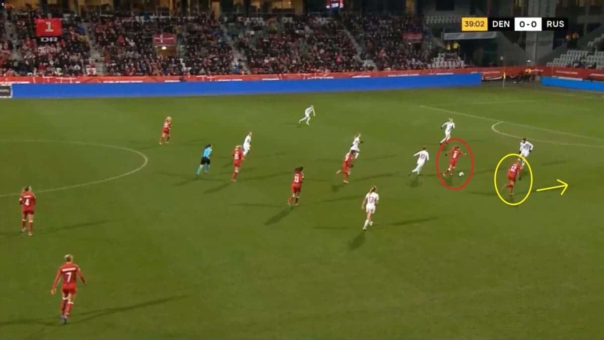 Denmark play with a very similar style to Fortuna, with a 3-4-3 being their preferred formation as well, whilst their secondary choice tends to be a 3-4-1-2 (they used these formations in 40% and 25% of their games, respectively, in 2021). Therefore, Snerle doesn’t need to adjust her focus between domestic and international games, with this image showing her taking the ball up to the Russian defensive line in exactly the same way as we have seen her do previously in this analysis. Once she sees the gap between Elina Samoylova and new Chelsea Women signing Alsu Abdullina, she plays the ball through and sets up a shot for BK Häcken striker Stine Larsen in the space behind, although the opportunity is not converted by the former Aston Villa player.
