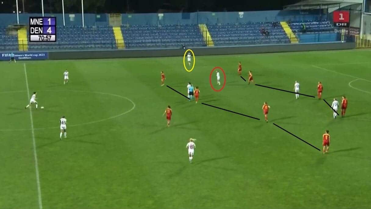 This image builds on some of those points, with Snerle again between opposing lines. This time, it is Montenegro who have left too much space open, with Snerle offering her teammates a passing option and a way of moving the ball into the space behind, whilst also keeping both sections of the Montenegrin team away from the ball.