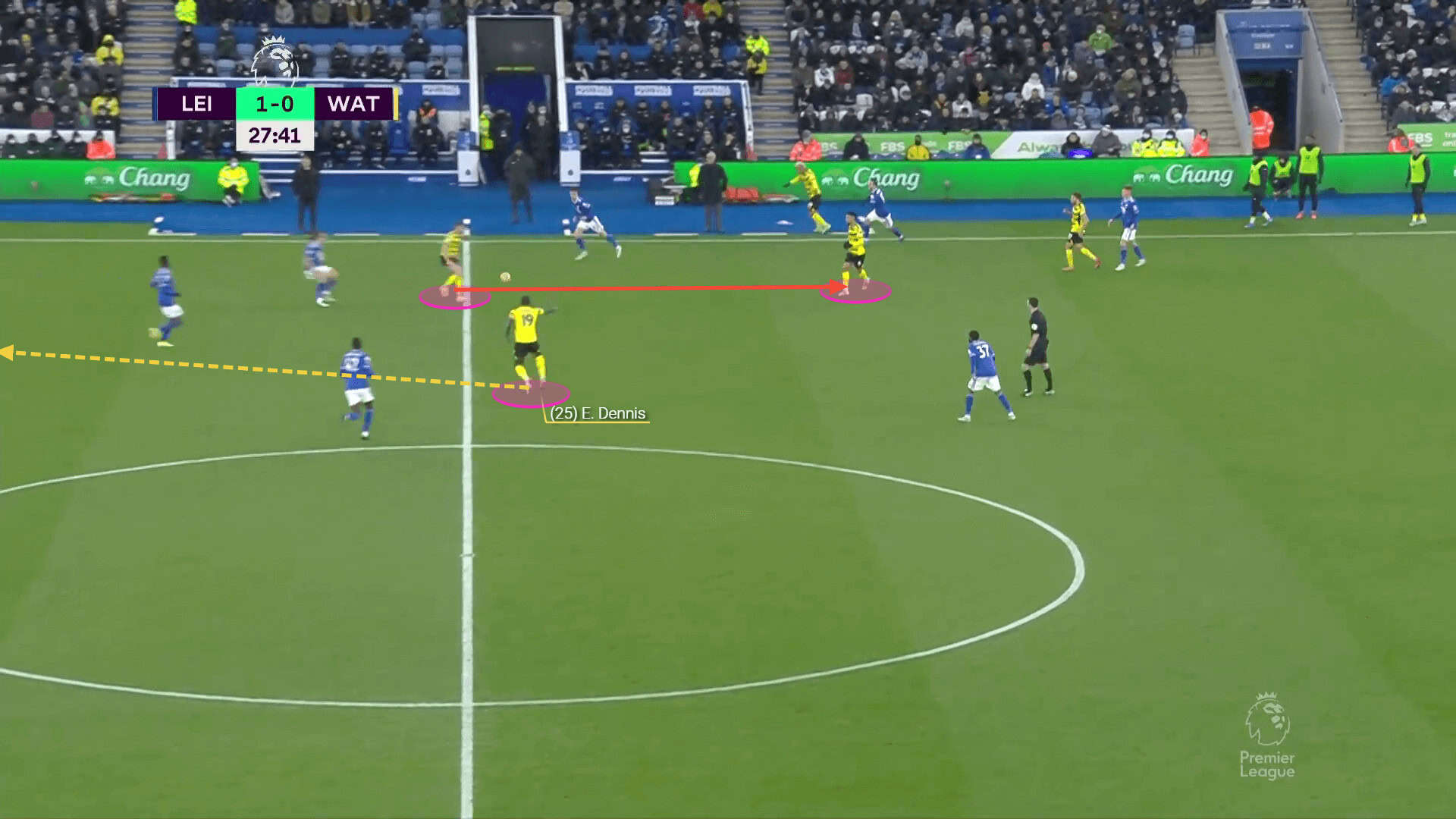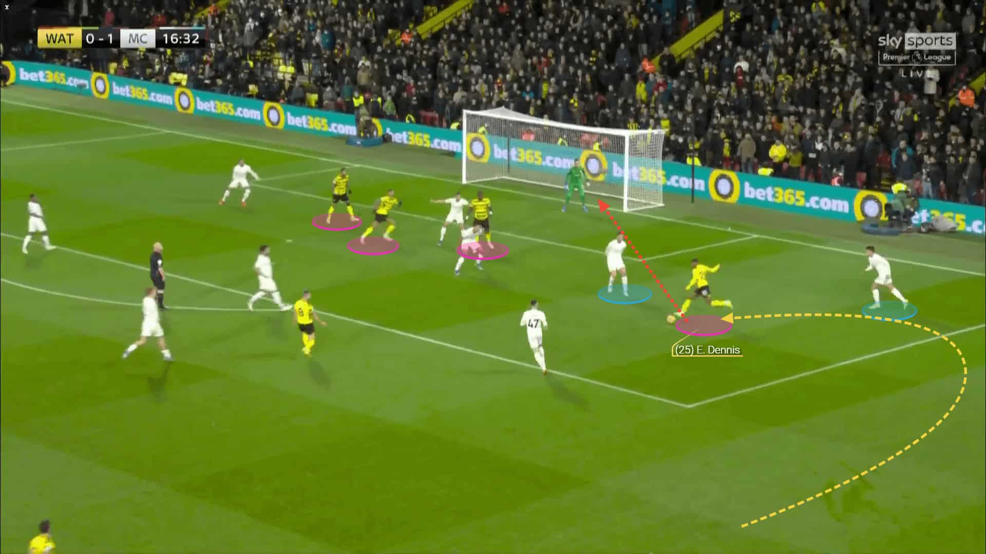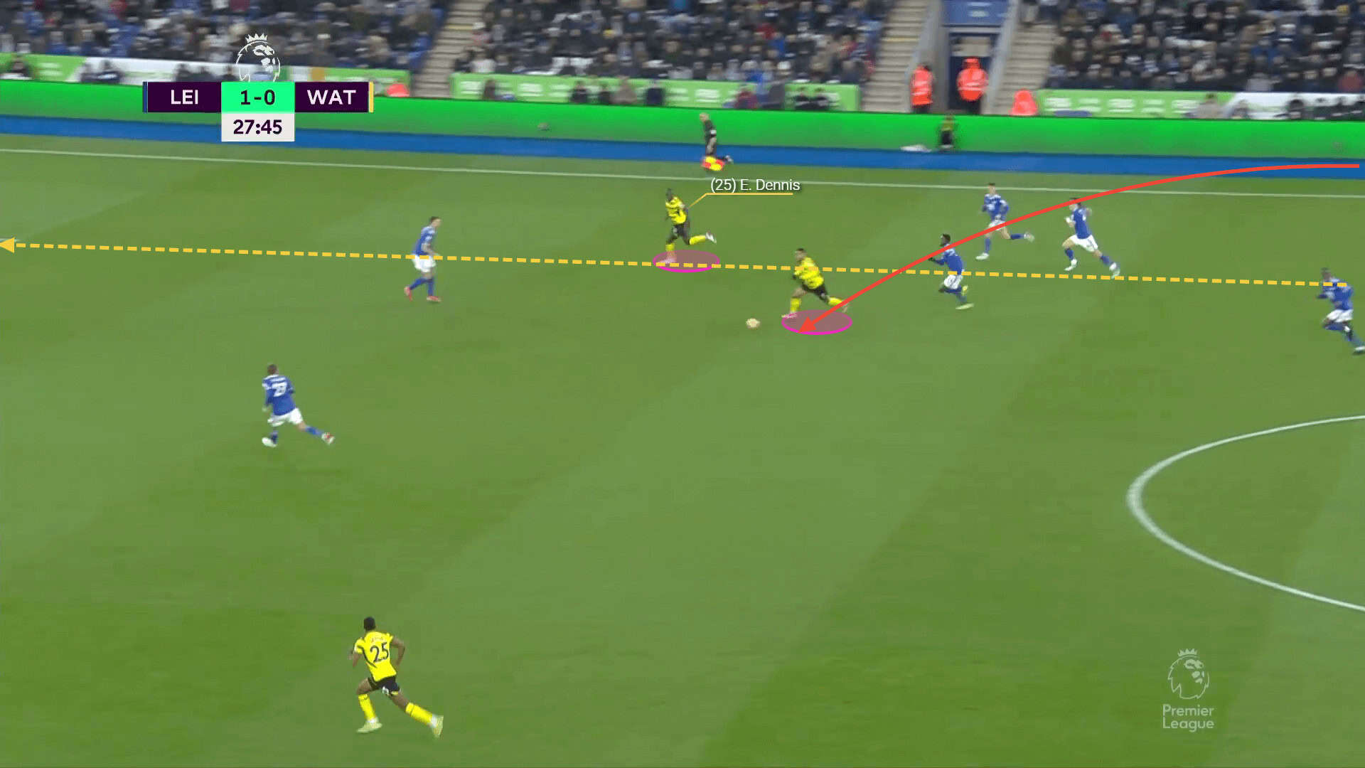 Not only does Dennis exploit these spaces with his movement, but he does so with his passes too. His attacking flair and spatial awareness make him valuable in creating chances for his teammates with through balls. He has assisted five goals so far this season as a result of crosses, through balls and smart passes.