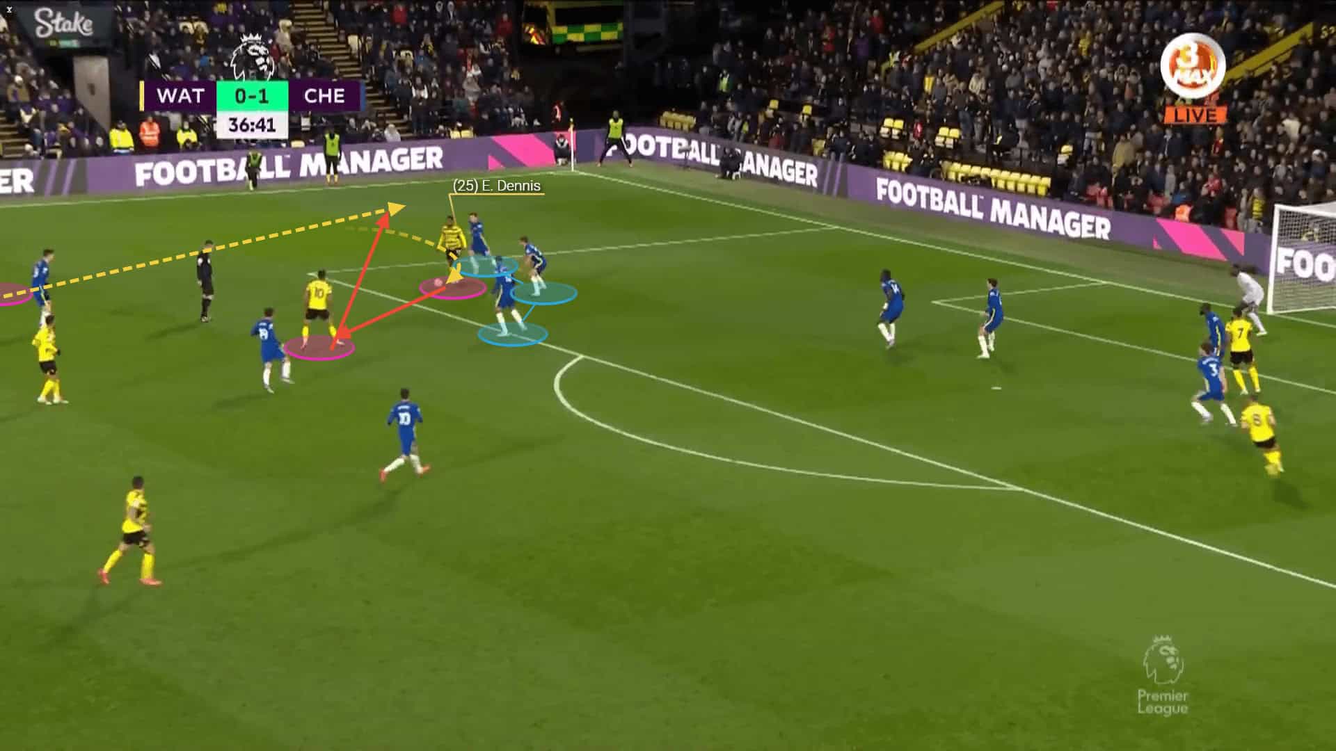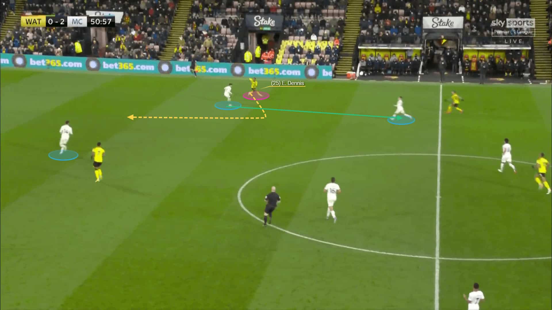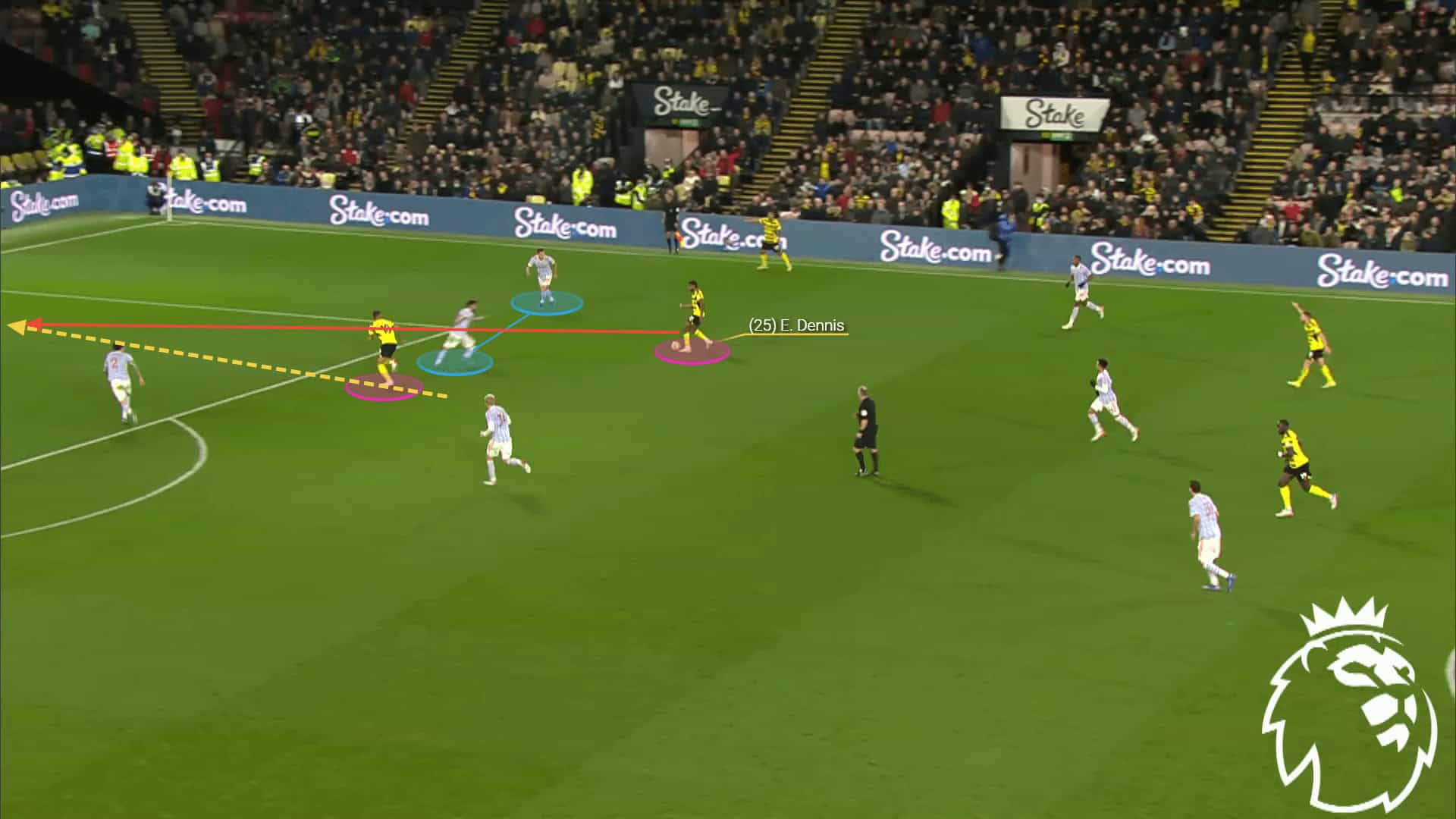 Not only does Dennis exploit these spaces with his movement, but he does so with his passes too. His attacking flair and spatial awareness make him valuable in creating chances for his teammates with through balls. He has assisted five goals so far this season as a result of crosses, through balls and smart passes.