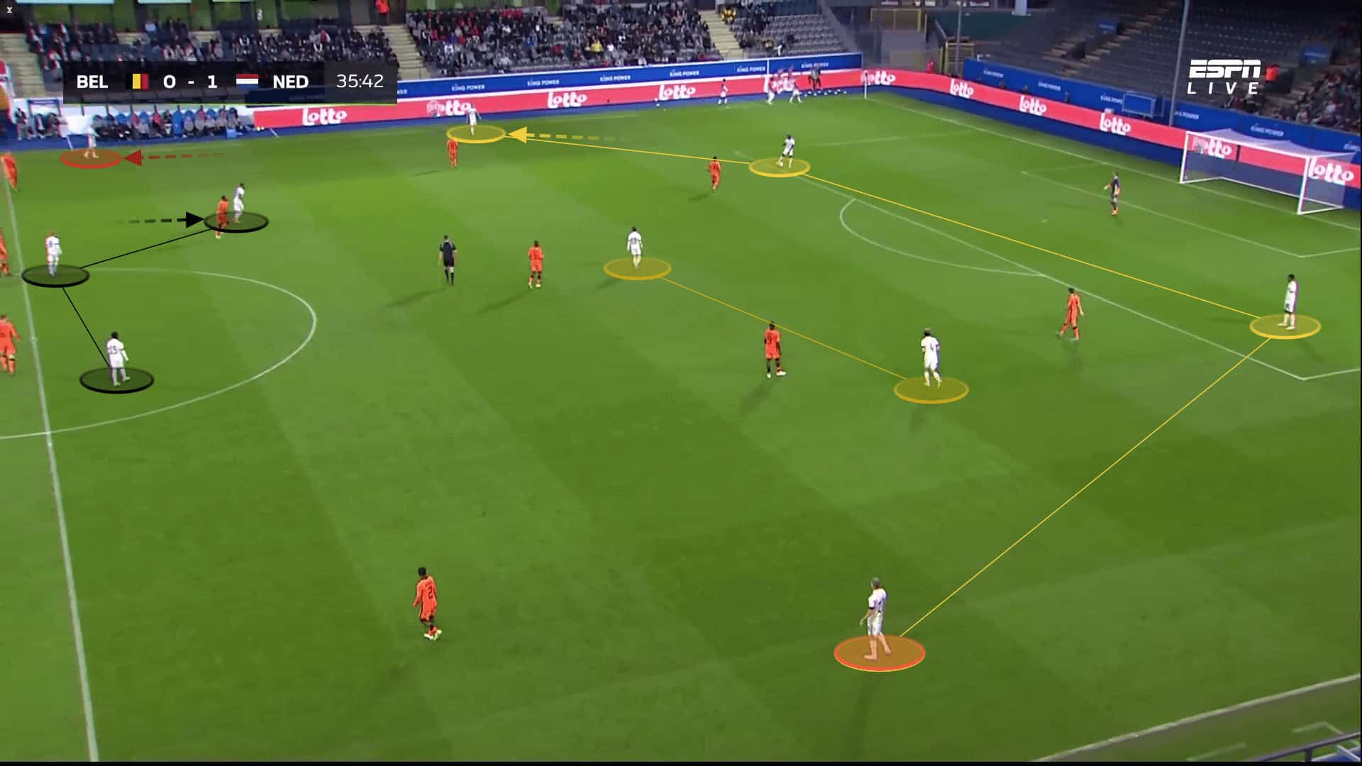 Here below, against the Netherlands, Belgium operated with a 4-2 base as the right centre-back moved wide, which created the 4-2-4 (one off the front line ready to drop off to add a +1 passing option).