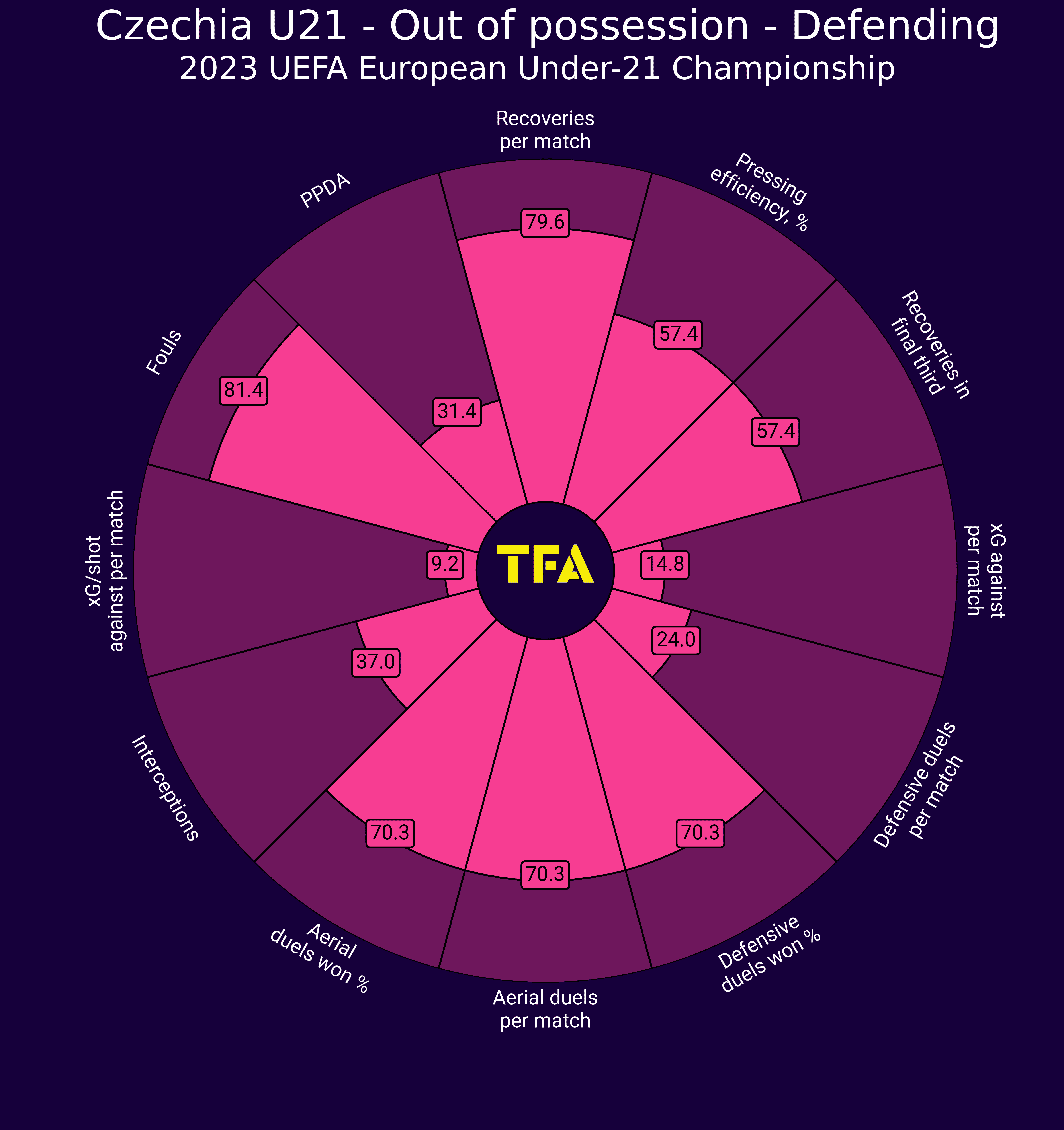 The Czech Republic U21 side are more defensive-minded, which can also be corroborated by the attacking pie chart metric that was shown in the previous section.