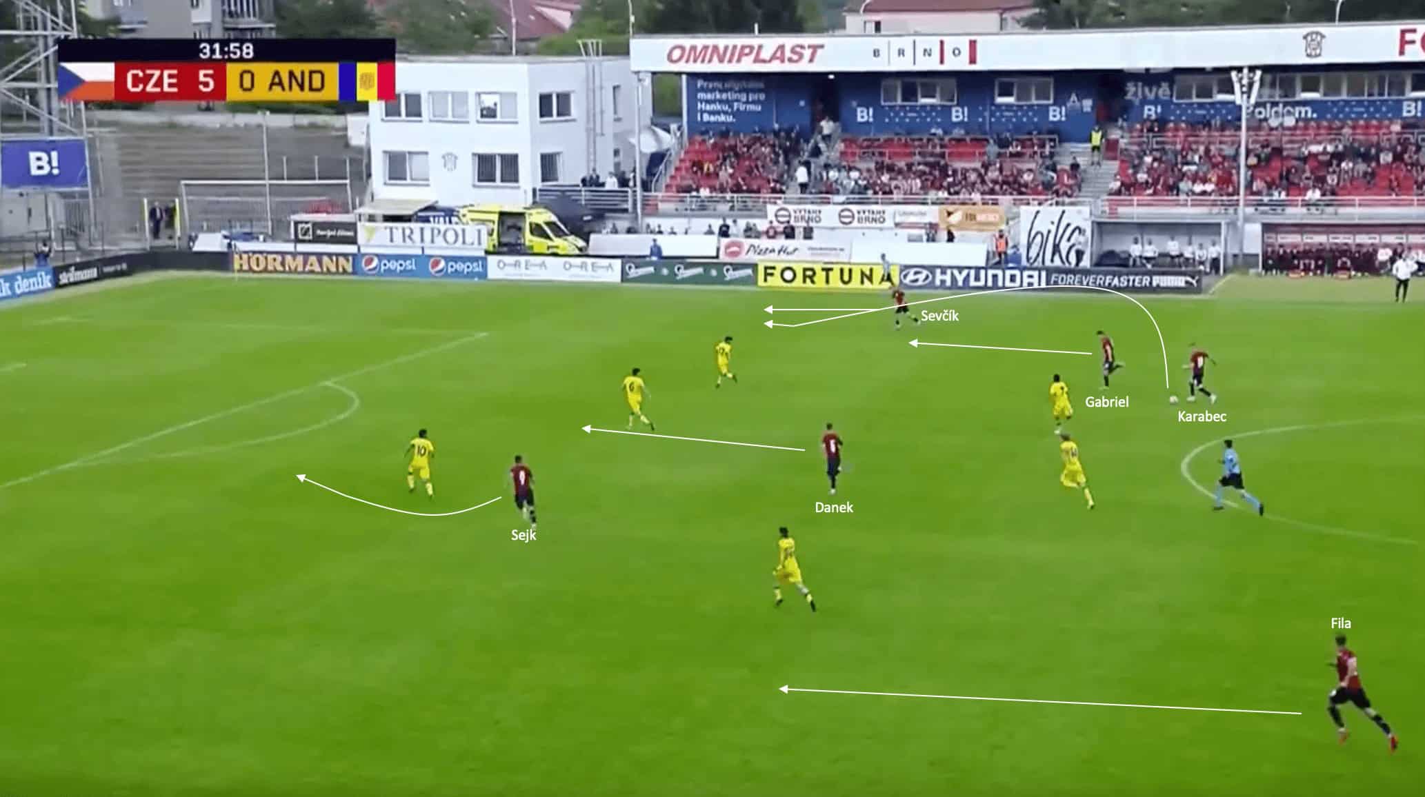 The 19-year old Adam Karabec is in possession, with players making runs all around him before he picks out Sevčík on the flank making a run in behind the Andorran defence.