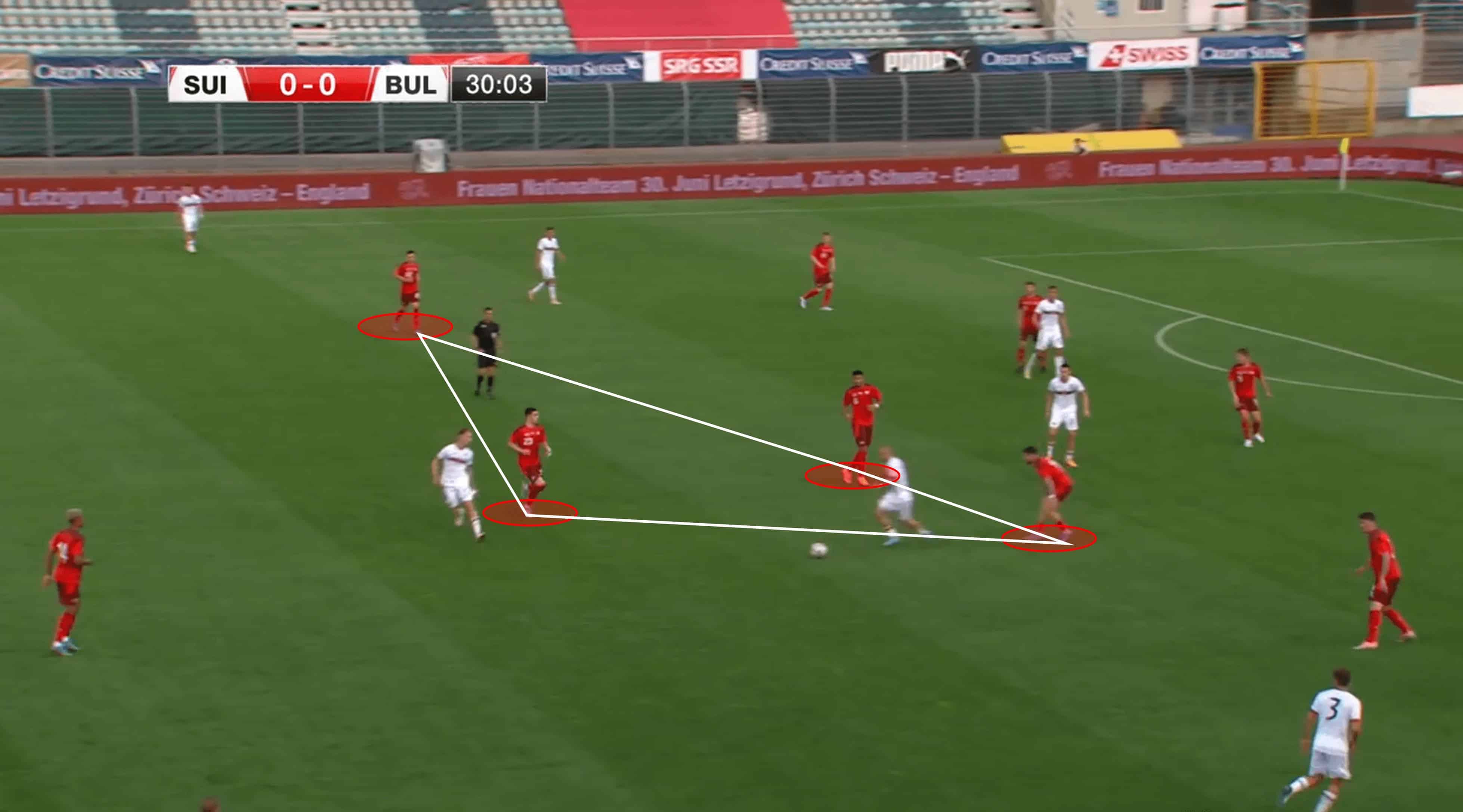 Defensive structure in midfield is something that was valued by Lustrinelli and is something that has carried through in Rahman’s reign; while the formations differ, the principles match. The example above is taken from a qualifying game last year with the Swiss playing their 4-3-1-2 formation, something we could still see from Rahman’s side, so the defensive positioning is relevant here.