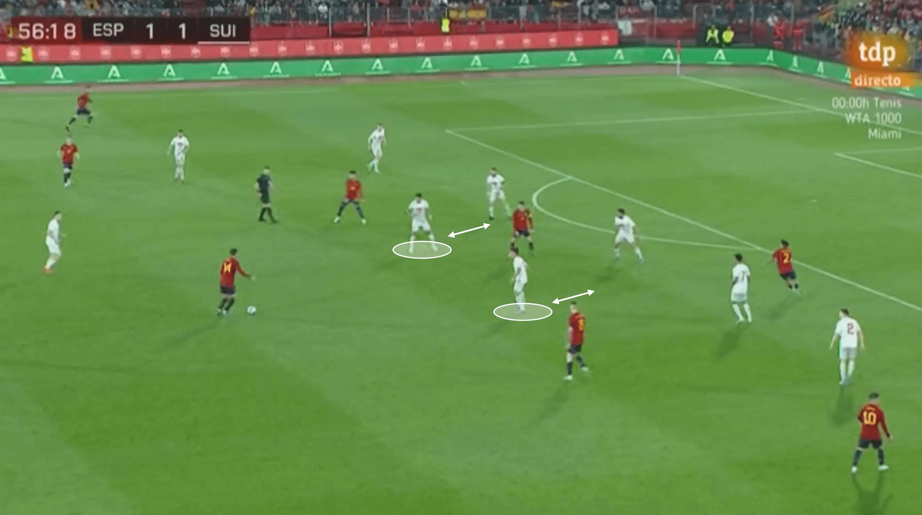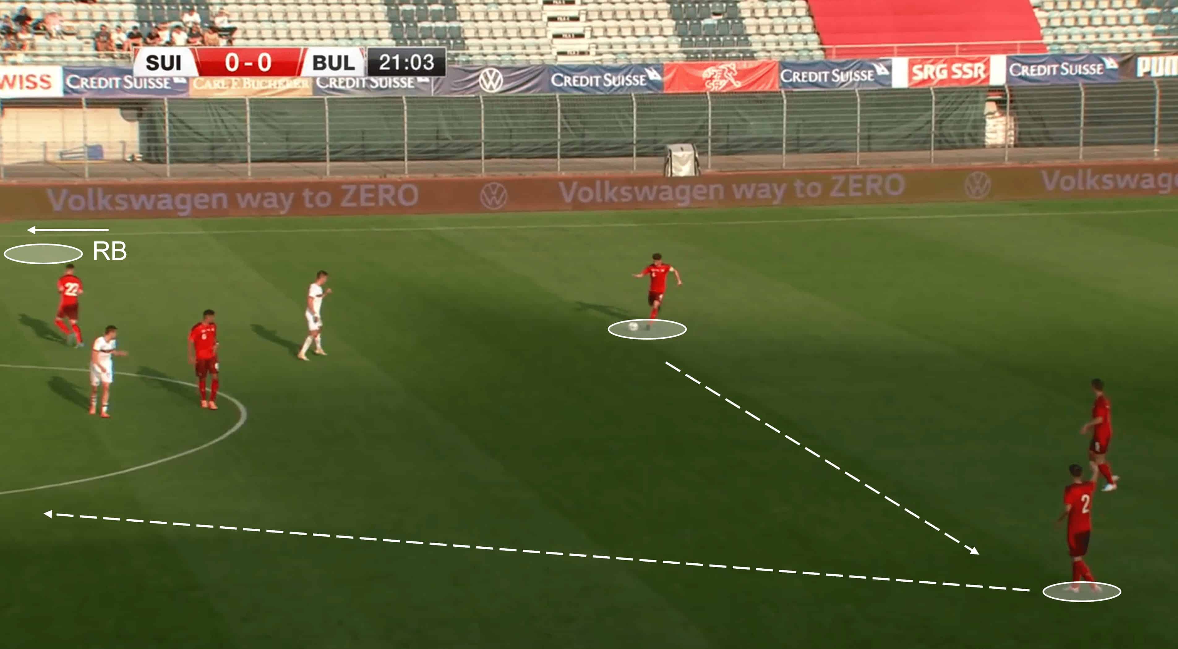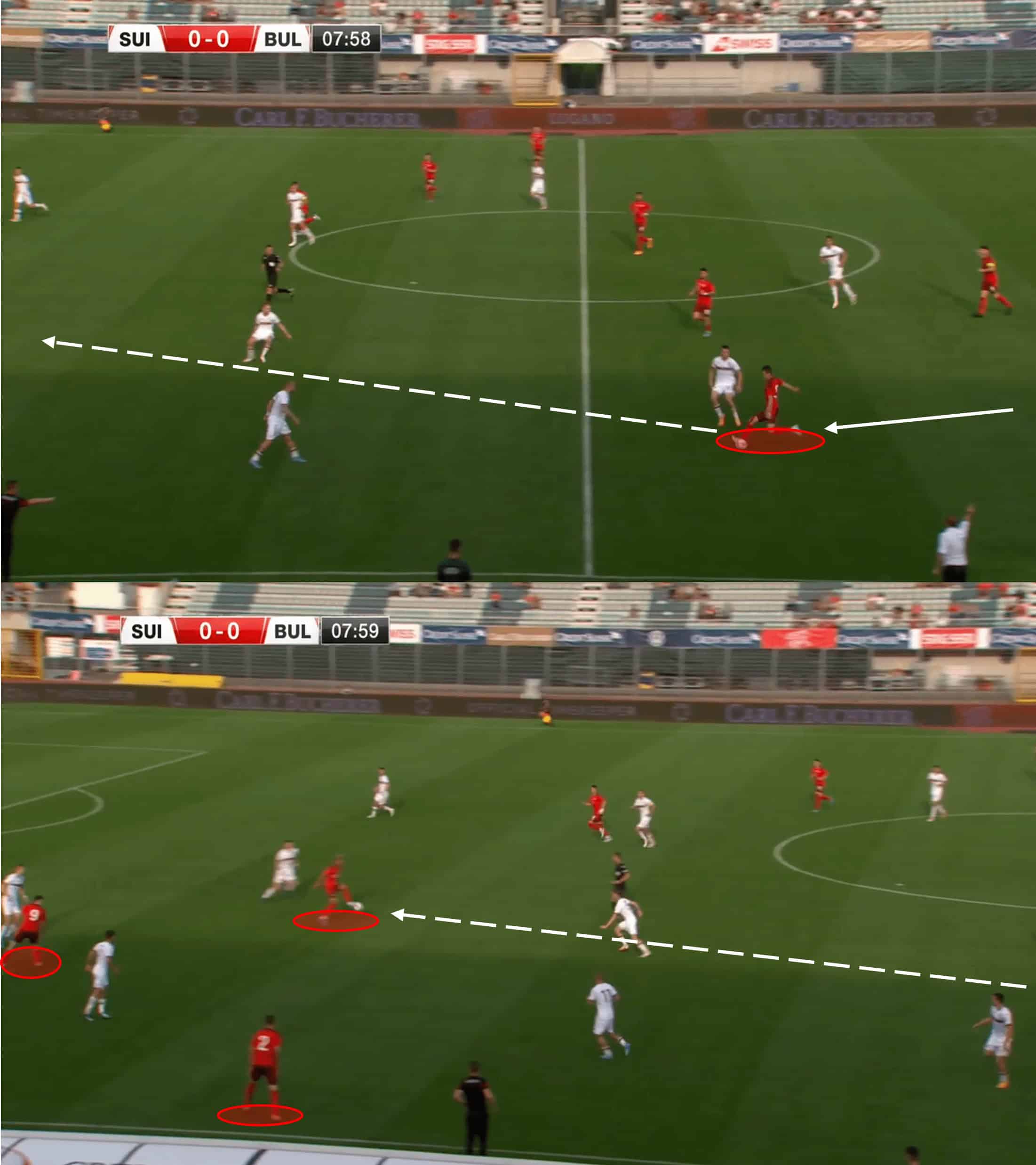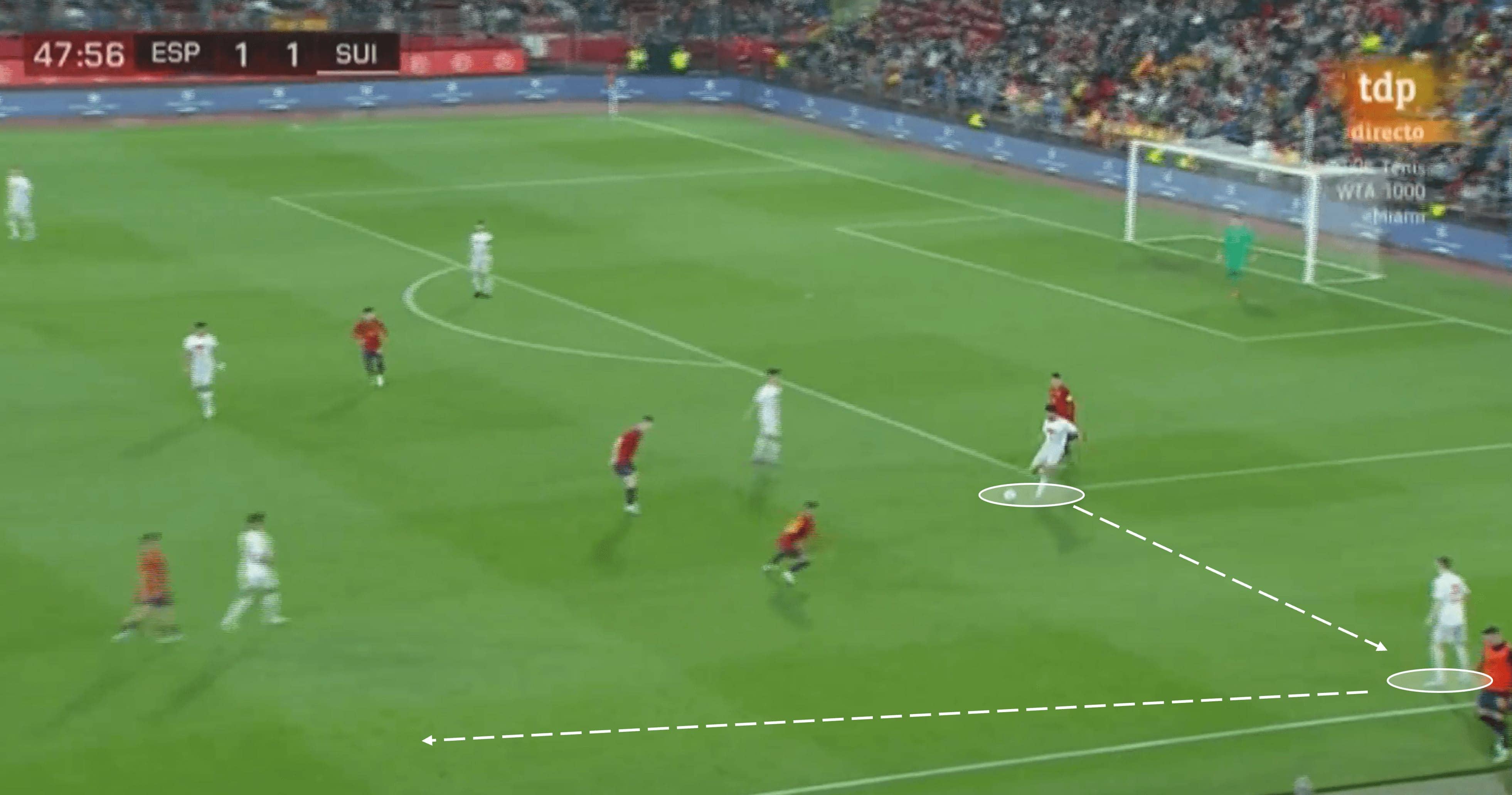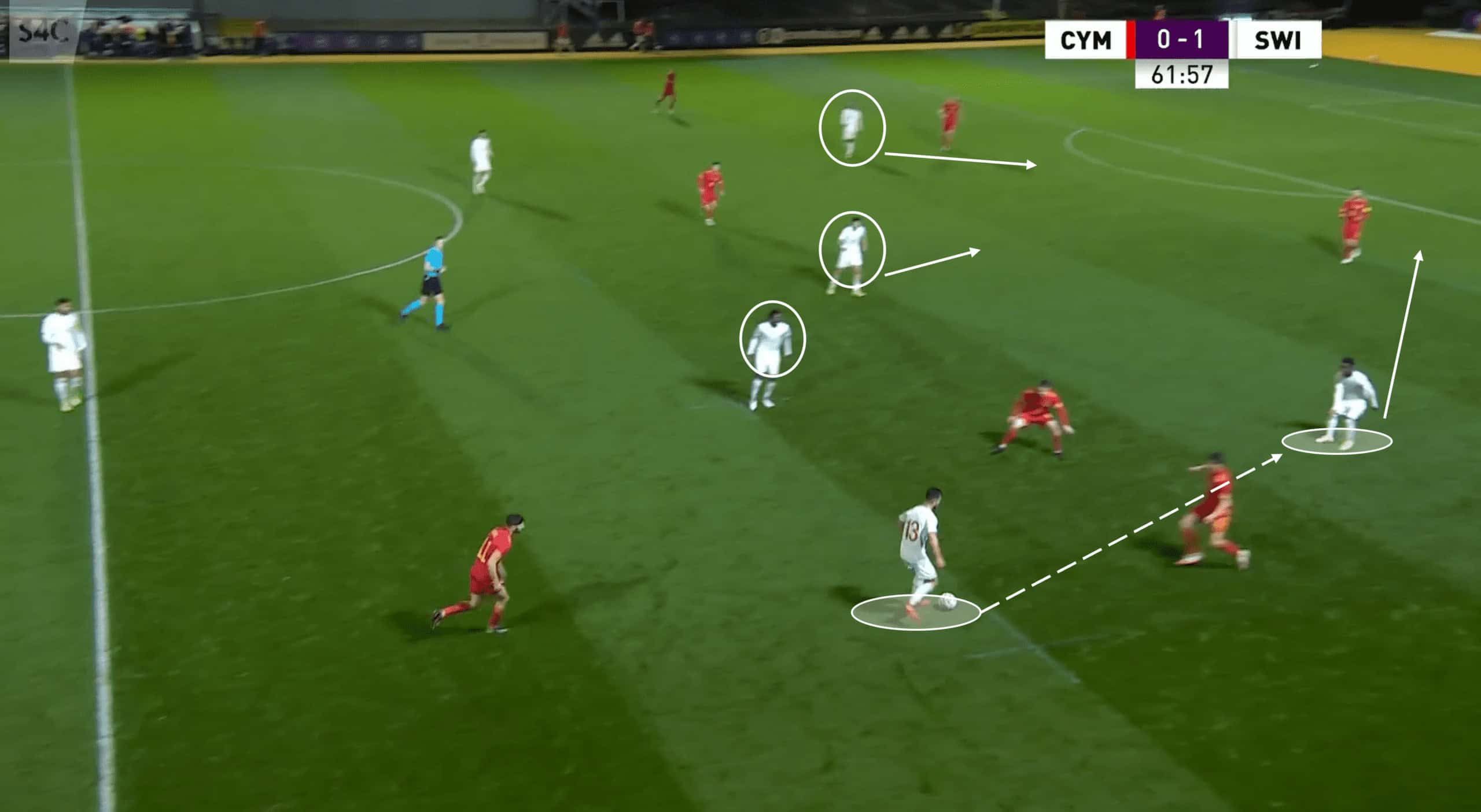 While they aren’t afraid to play in a direct way from deeper areas, once they get into the midfield/final third, we see more of a fluid approach that centres on off-the-ball movement and short passes. These bursting runs can be difficult to track, mark, and stop, just as Spain found out in this particular scenario. The player who went on to score made a defence-splitting run through the middle of Spain’s defence, with his run starting from the left flank and coming inside. Several goals the Swiss U21s have scored, both before and during Rahman’s reign, had this aspect of play, so expect to see them attacking with the same gusto in the tournament.