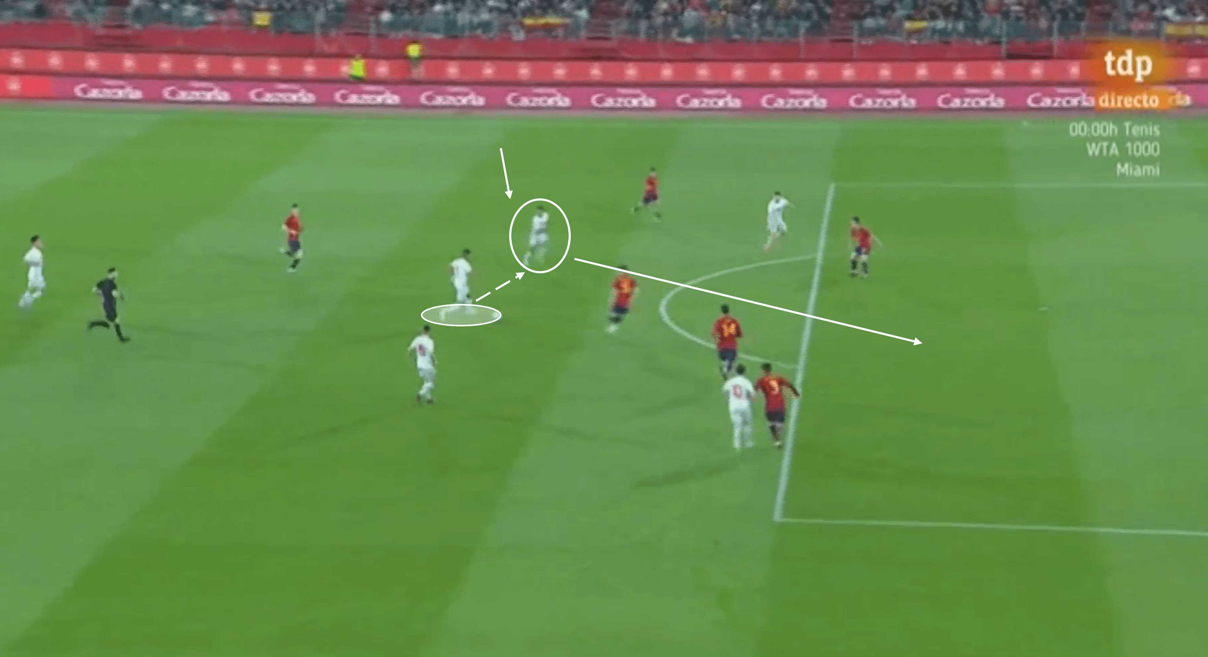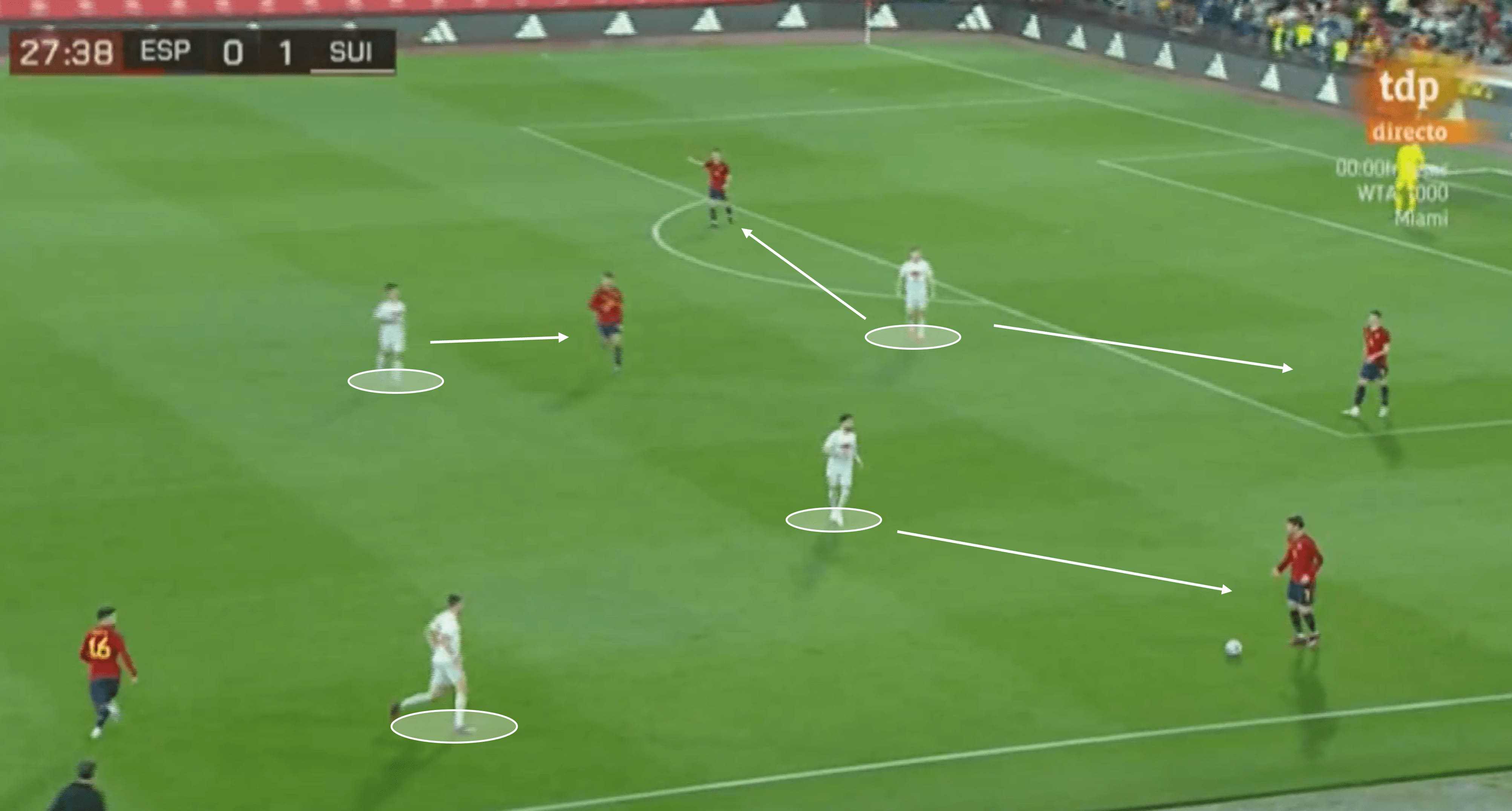 Take the example above, Spain have a high presence in Switzerland’s half, but rarely will you see direct balls from central areas of defence. Instead, there will usually be a supporting full-back close by who can receive the ball in a wider position, where they will send a direct ball forward when the chance presents itself — the passes either going to a centre-forward or down the flank in behind the opposition full-back.