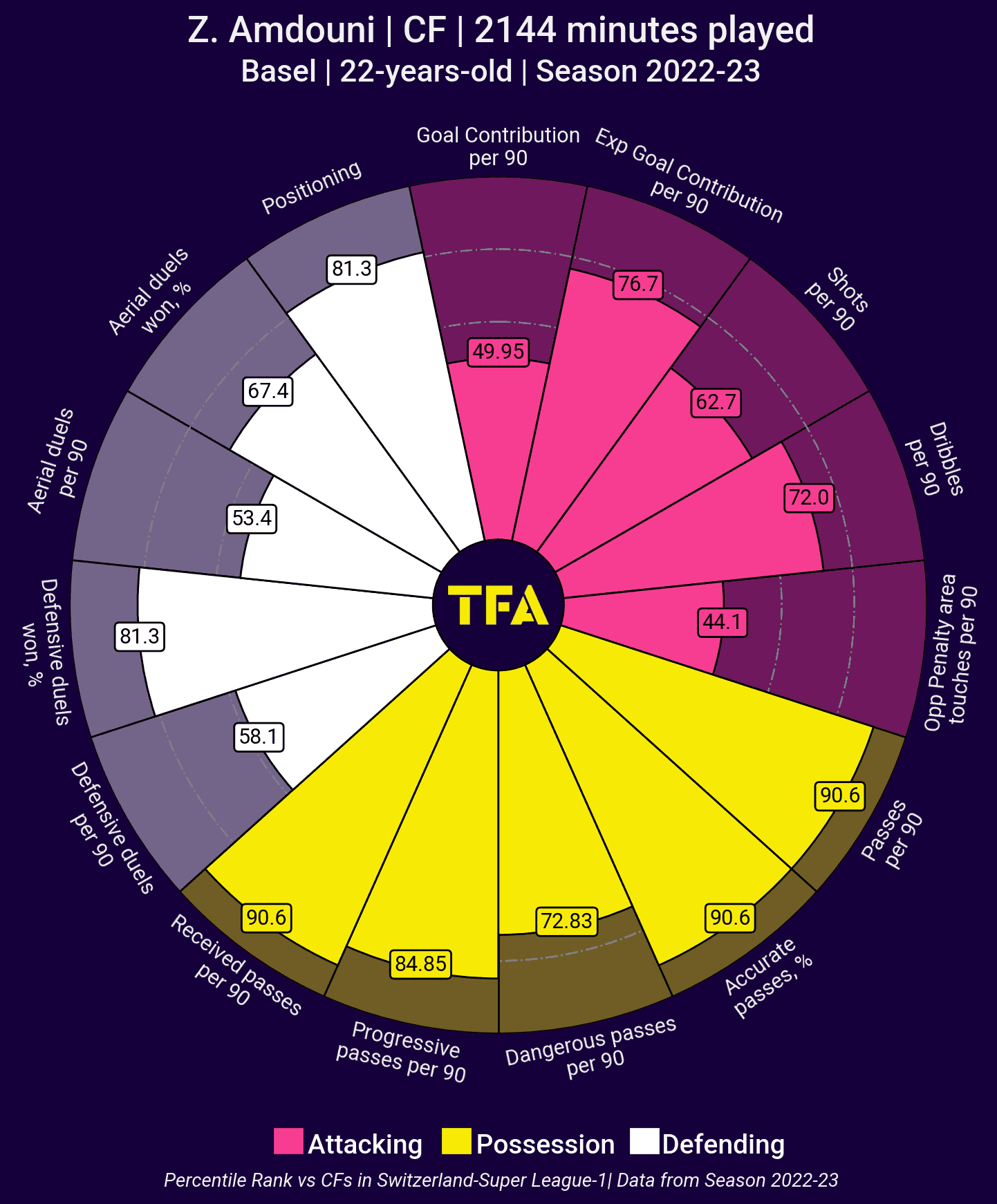 Looking at his data, in comparison to other forwards in the Swiss Super League, he shines in several areas. He gets heavily involved in the build-up, as evidenced by his high percentile ranks for metrics like passes per 90, progressive passes per 90 and dangerous passes per 90, and he also adds a threat in the final third. Good percentiles in expected goal contributions per 90 and dribbles per 90 also highlight the different areas in which he can be effective.