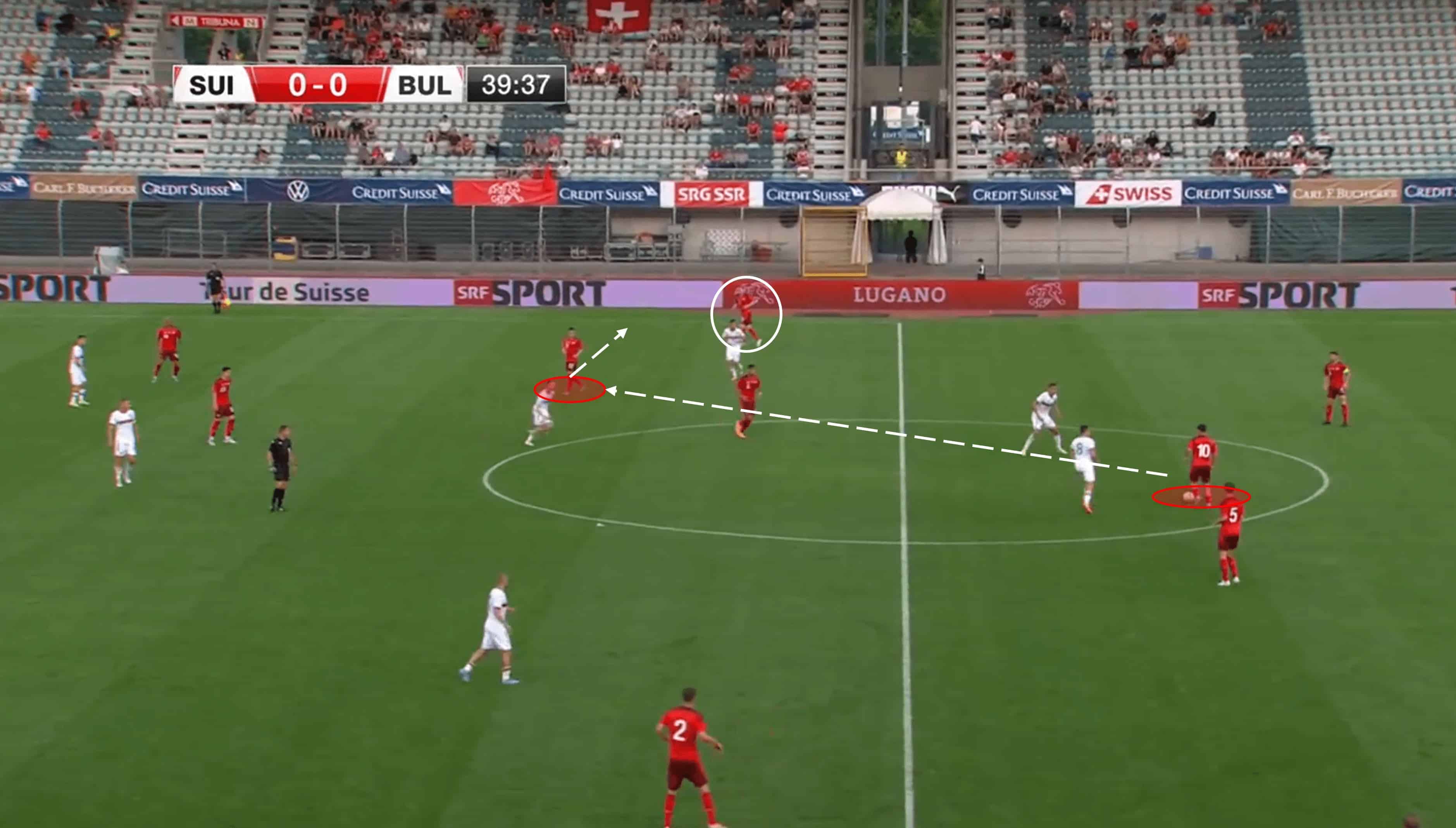 Switzerland will take the initiative to try and unsettle the opposition if they have possession deep in their own half, committing a slightly higher line and sending players forward to form a high press. While it may not reach the intensity levels that we’d see from a Jürgen Klopp-esque press, the presence and positioning is the key point that allow the Swiss to disturb the opponent’s possession. The furthest player forward looks to occupy the deepest opposition player(s), forcing them to try and play forward — other nearby options will be marked, and there will be some pressure applied to the man on the ball.