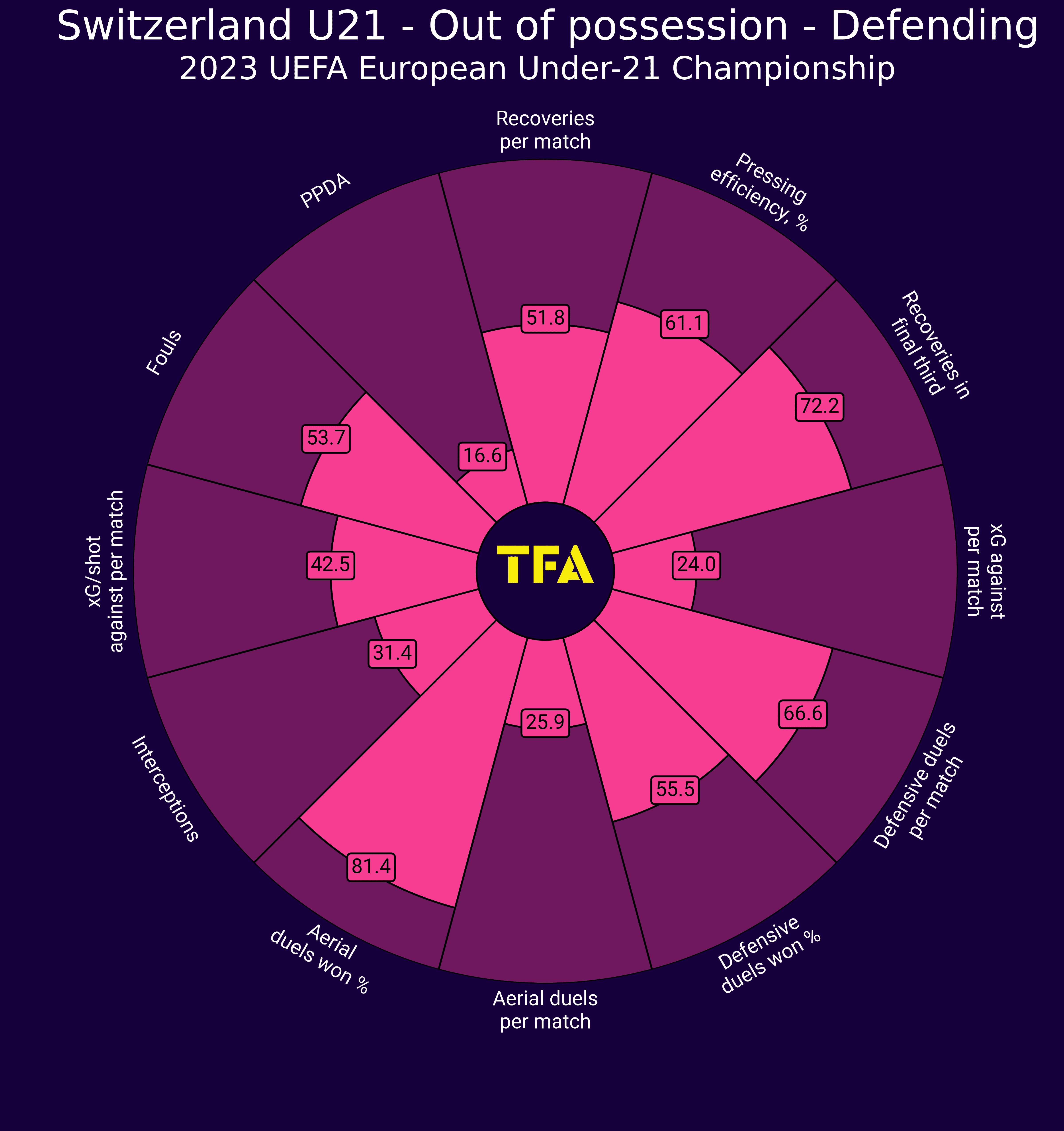 Switzerland’s physical and aerial prowess shines through in their defensive data too, as evidenced by their high percentile of aerial duels won. They do, however, show inconsistencies in success when it comes to defensive duels and recoveries, although they perform well when it comes to recoveries in the final third. The low rank in PPDA makes for good reading, as does their low percentile rank for xG against per match, showing that they had a generally good time in keeping chances out during qualifying.