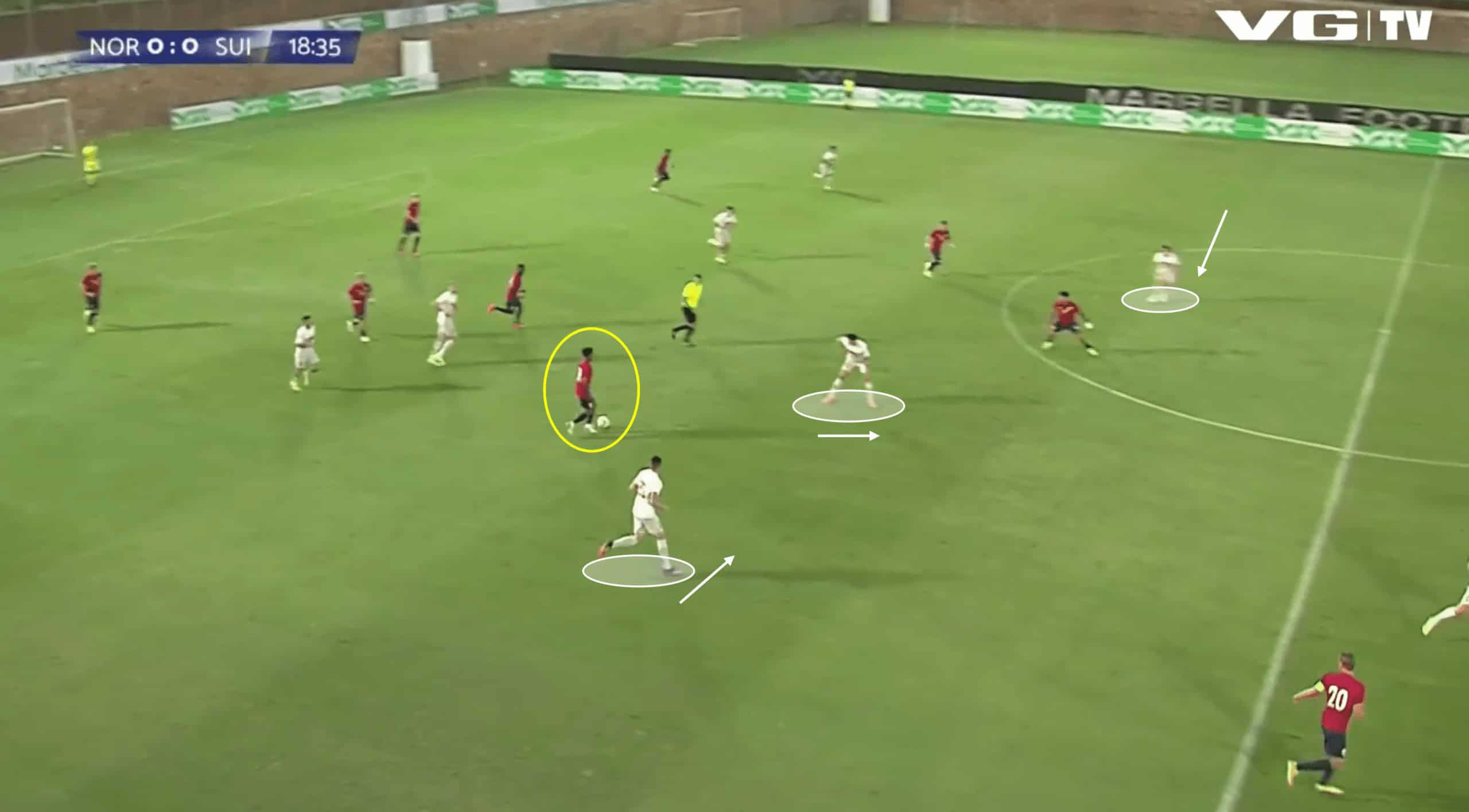 We see these elements in the image above. Norway won possession slightly deeper than where they have it in the image, with the midfielder looking to push forward. Initially, the centre figure of the three highlighted Swiss players motioned as if he was going to swarm the man on the ball, but thought better of it and began retreating to a deeper position that encouraged defensive reinforcement. The two wider highlighted players tucked inside from wider areas to provide some compact stability — while the execution on this occasion was flawed, the principles remain the same in terms of what Switzerland look to achieve in a defensive transition.