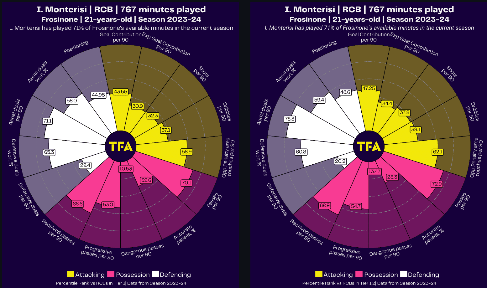 Out of possession, Monterisi has proven himself quite reliable in defensive duels and aerial duels, as the above pizza chart shows, with some quite respectable percentile rankings on display when compared with players in his possession from leagues of similar quality to Serie A, such as the EPL, Bundesliga, LaLiga and Ligue 1.
