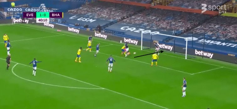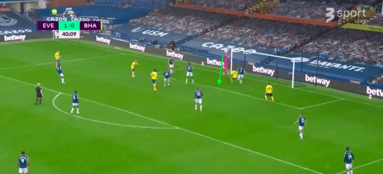 Against Brighton this season, Pickford made a bad error that luckily was not costly for his team. As a high ball goes up within his box, he’s in a great position to deal with it; he’s also under no pressure at all. However, Pickford drops the ball straight to Neal Maupay, who easily taps the ball home. Pickford’s incompetence under the high ball is proving to be a reoccurring problem. This is an example of an error that isn’t a technical fault. Much like the below example too.