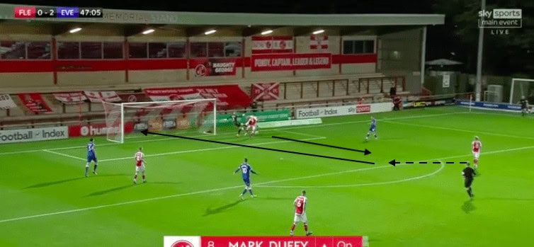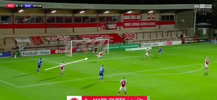 Here, in the cup against Fleetwood Town, Pickford receives the ball under pressure. Whilst this isn’t the easiest situation for the Englishman, there are much better ways he could deal with it. Pickford should either clear the ball first time without taking a touch or pass the ball out for a throw-in. Instead, he tries dribbling around two Fleetwood players and is subsequently tackled.