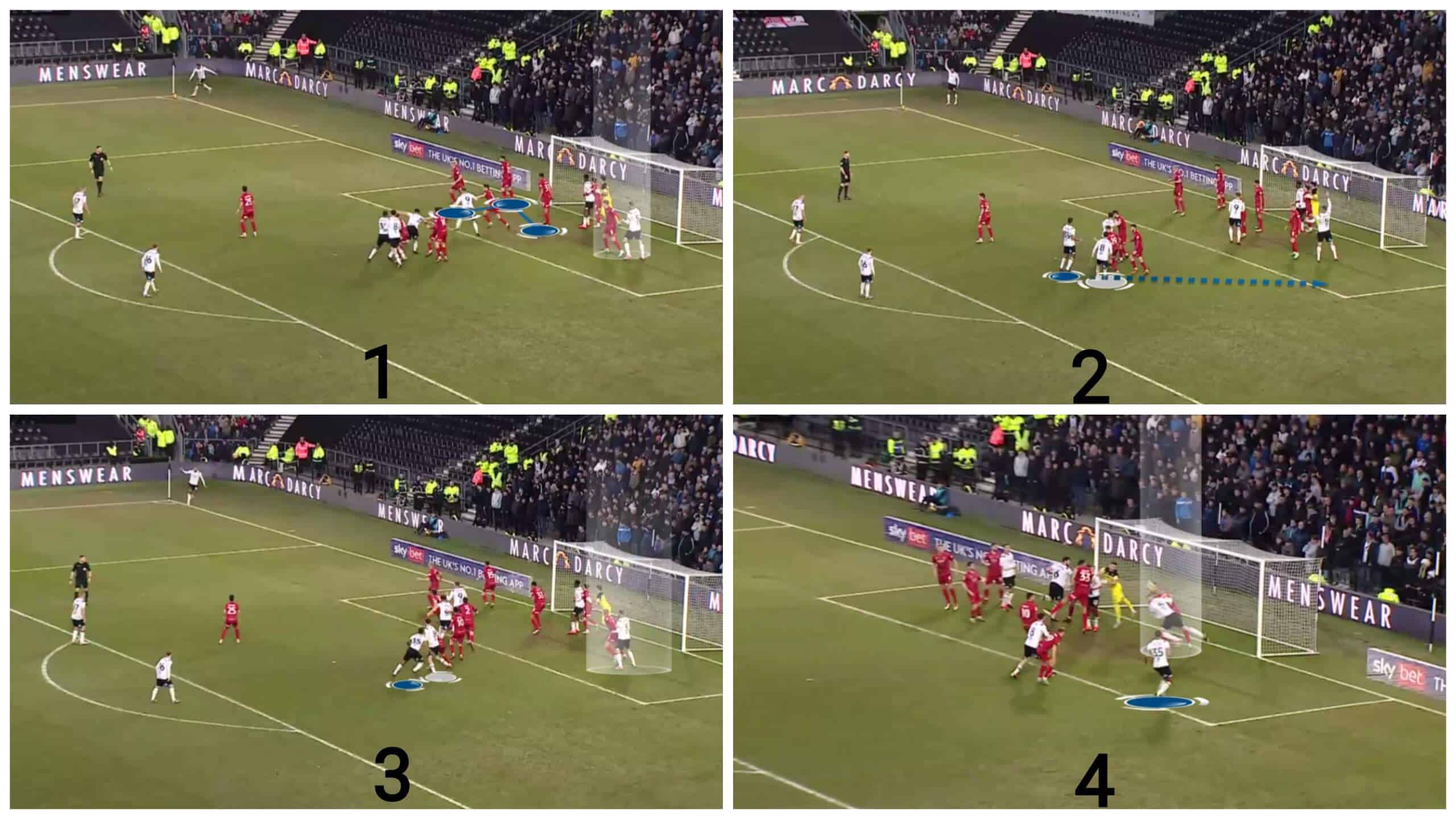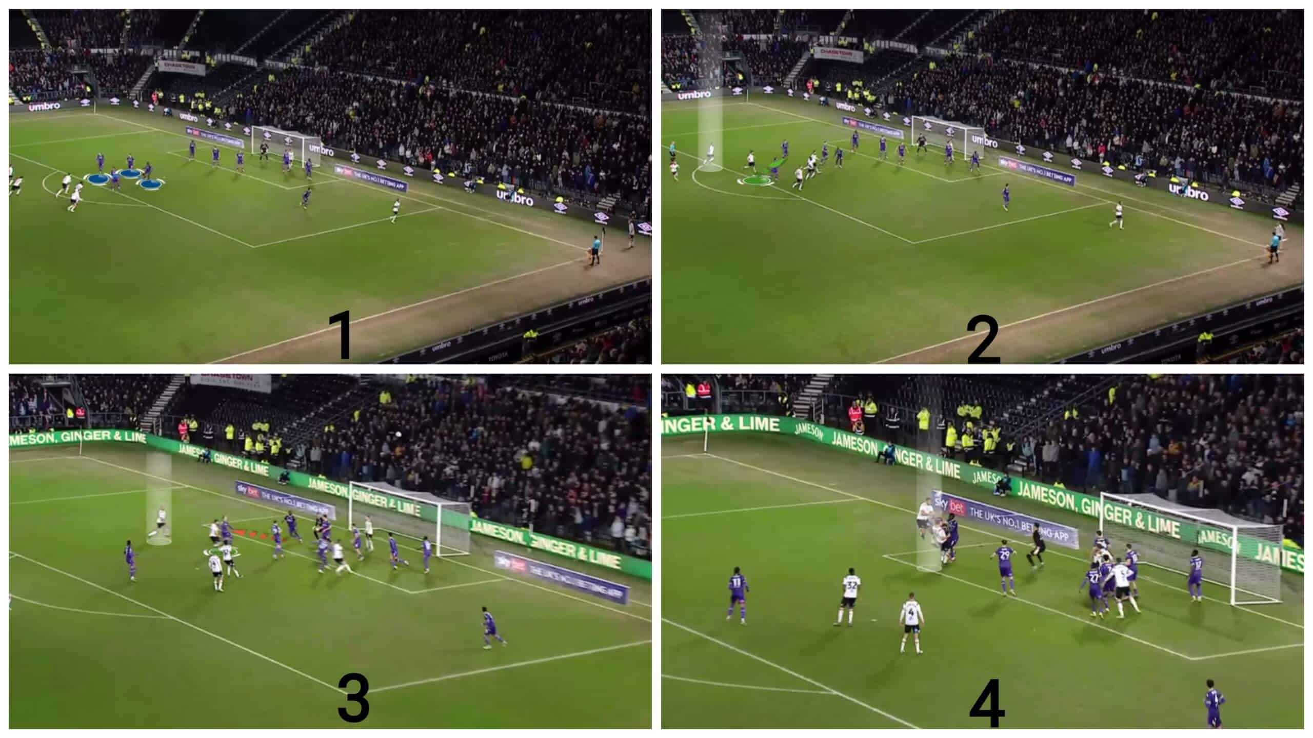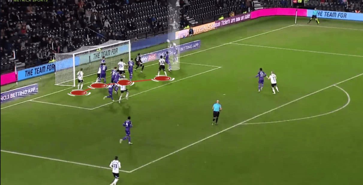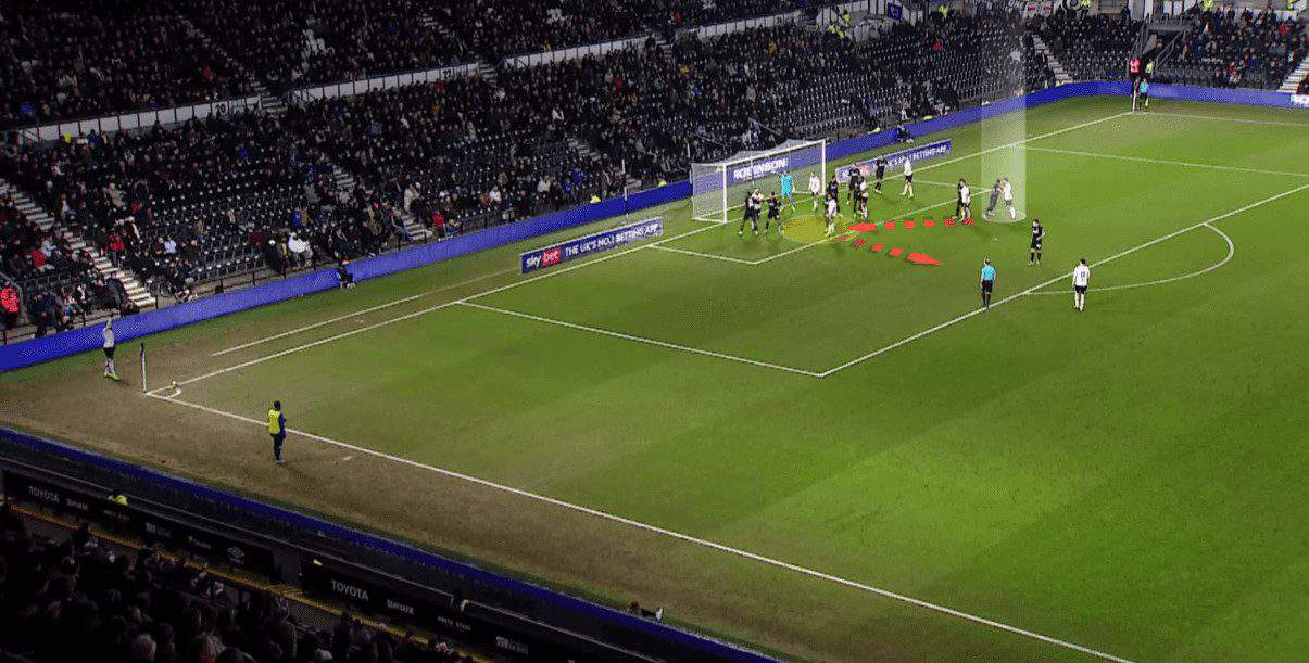 Regarding free-kicks, we should mention that Derby often use simple yet effective ideas by targeting initial offside players trying to get onside via fake deceptive runs. Let’s go into detail!