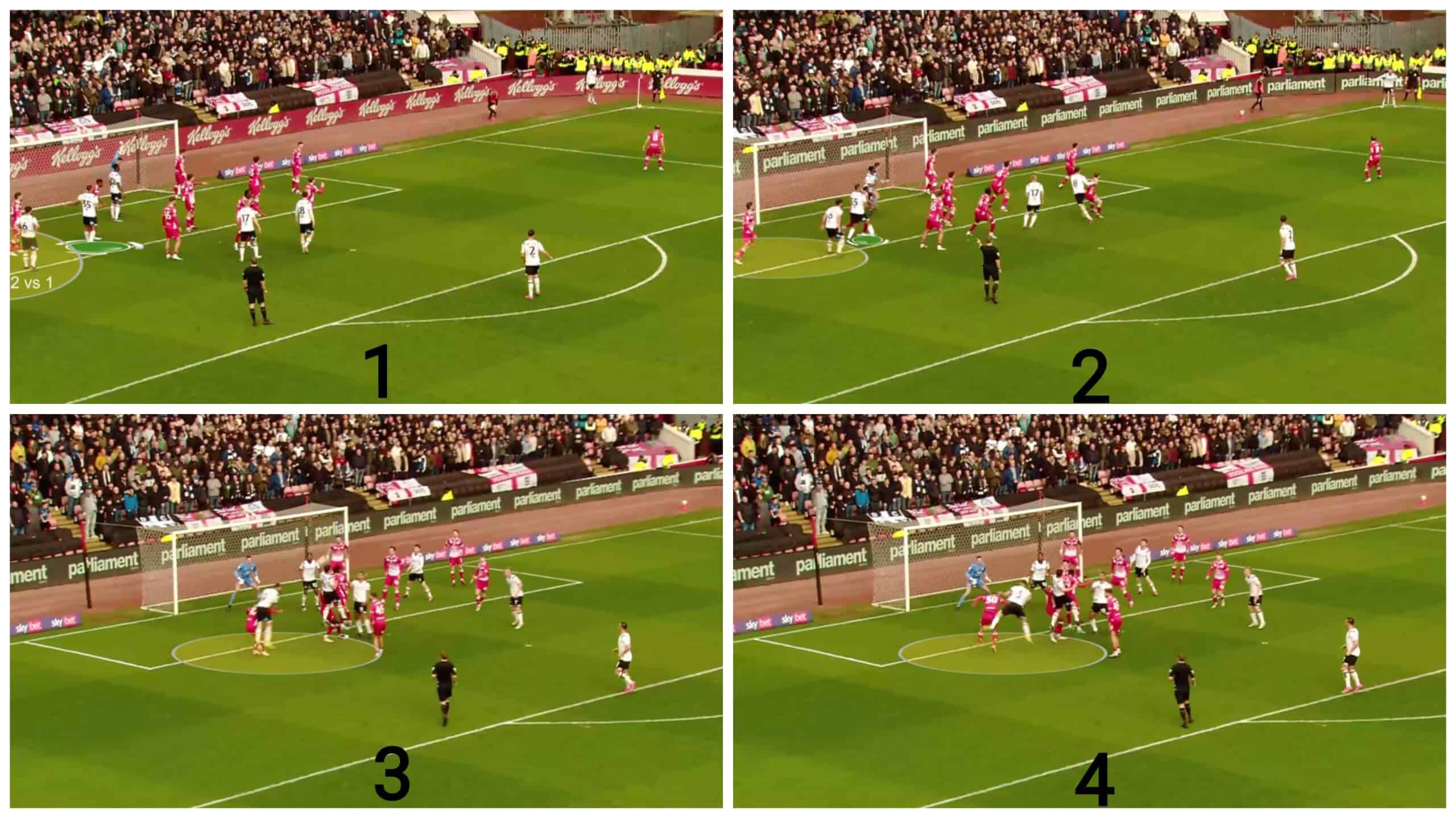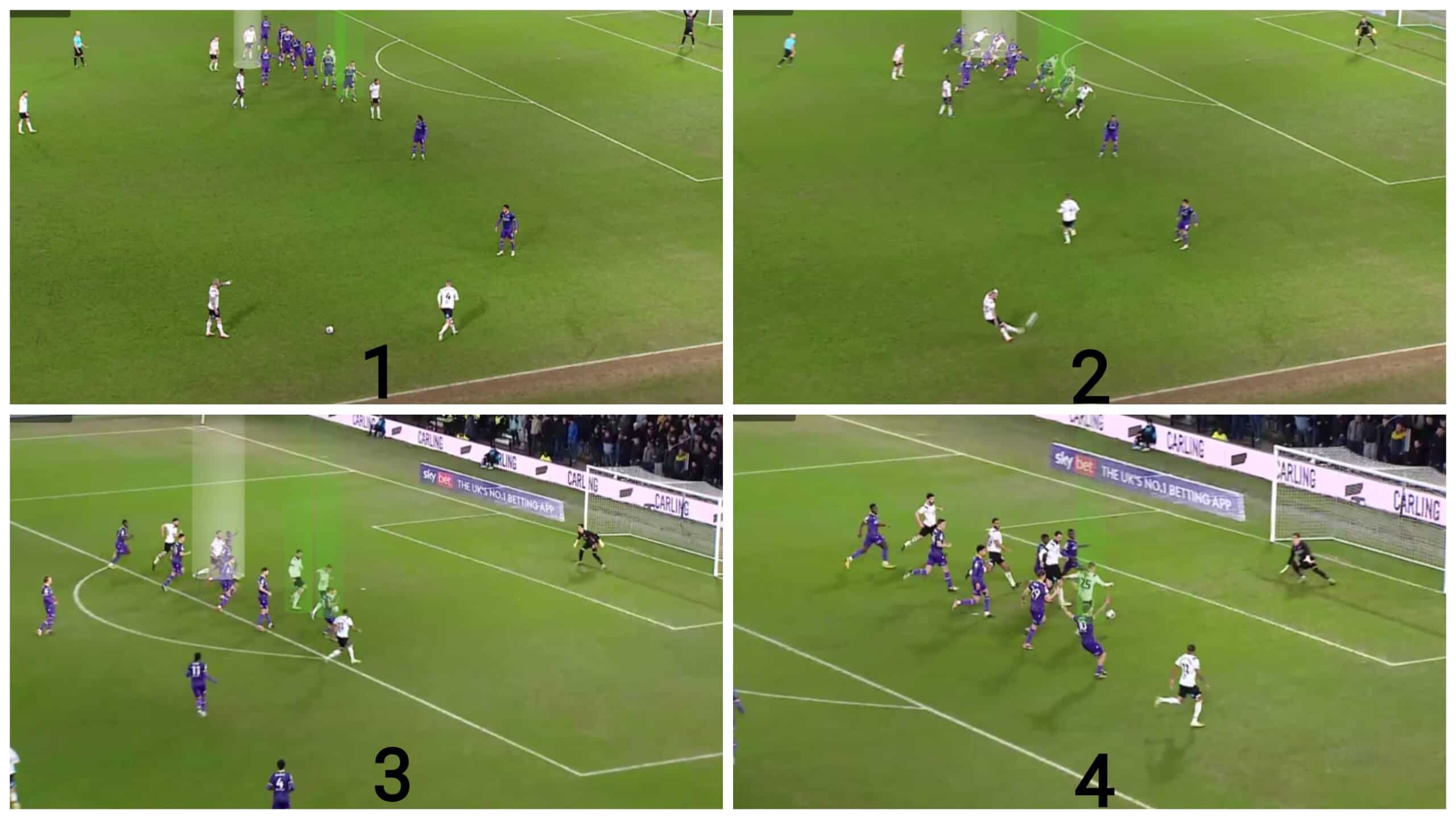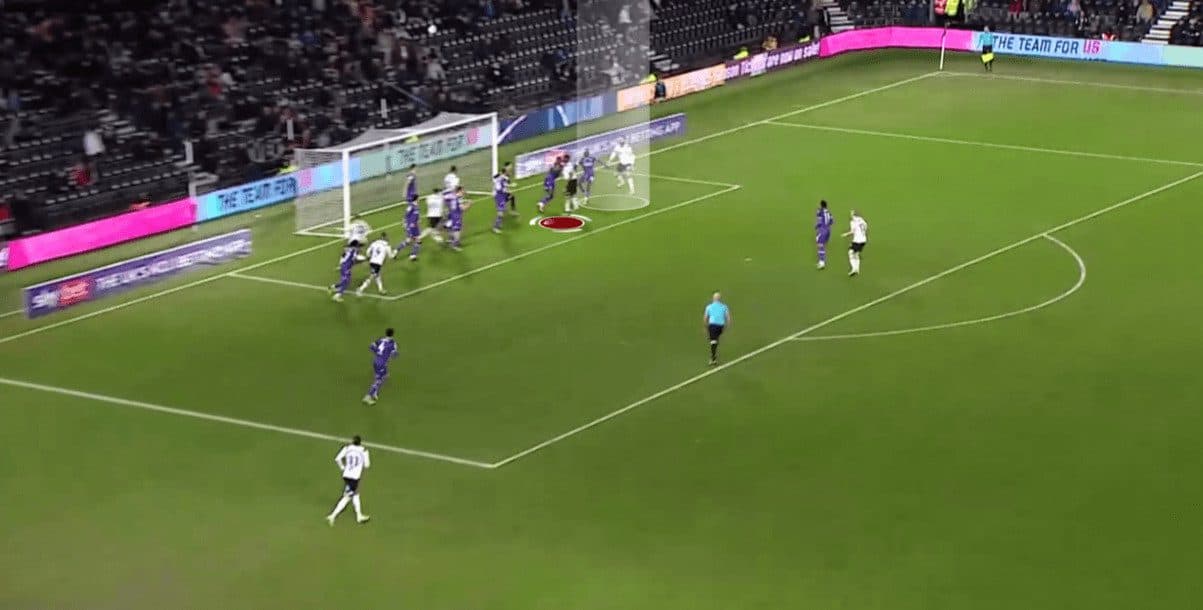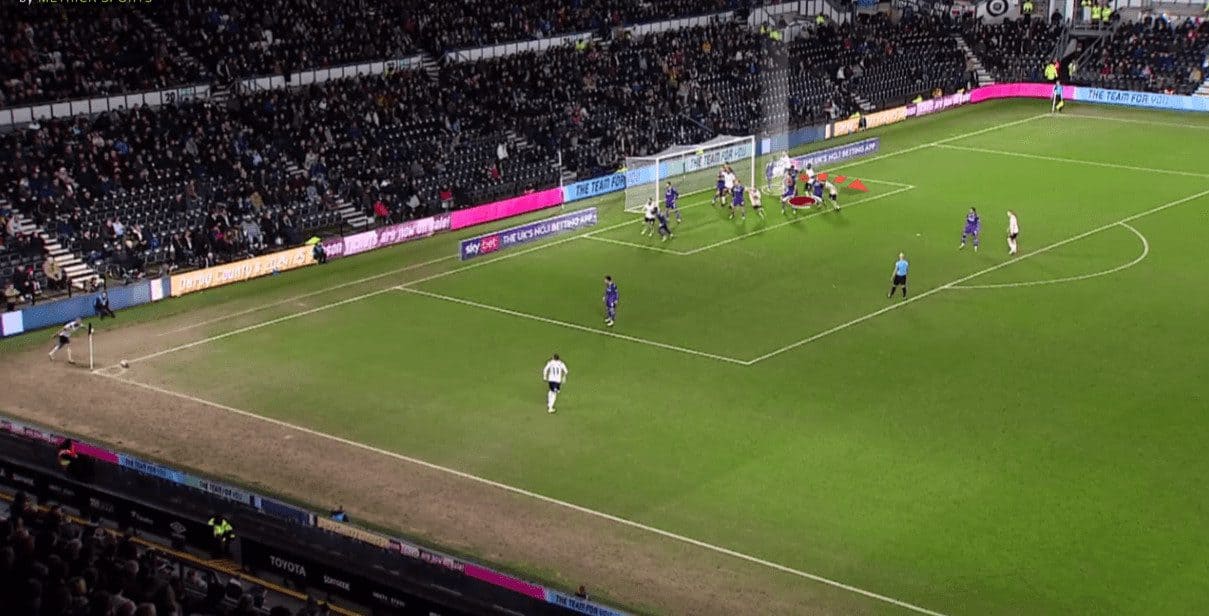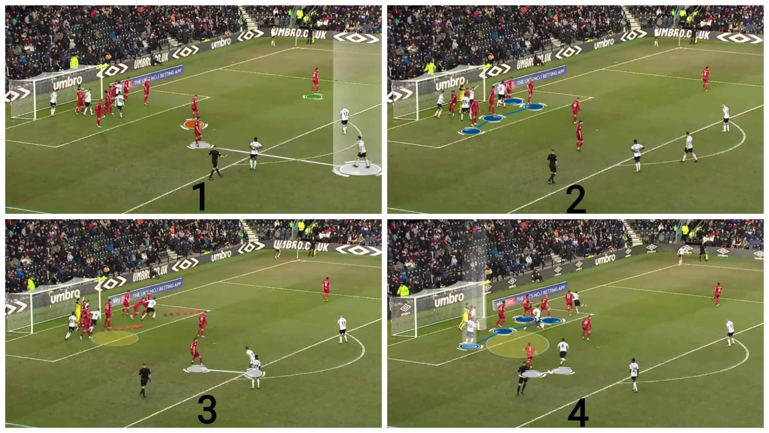 Regarding free-kicks, we should mention that Derby often use simple yet effective ideas by targeting initial offside players trying to get onside via fake deceptive runs. Let’s go into detail!
