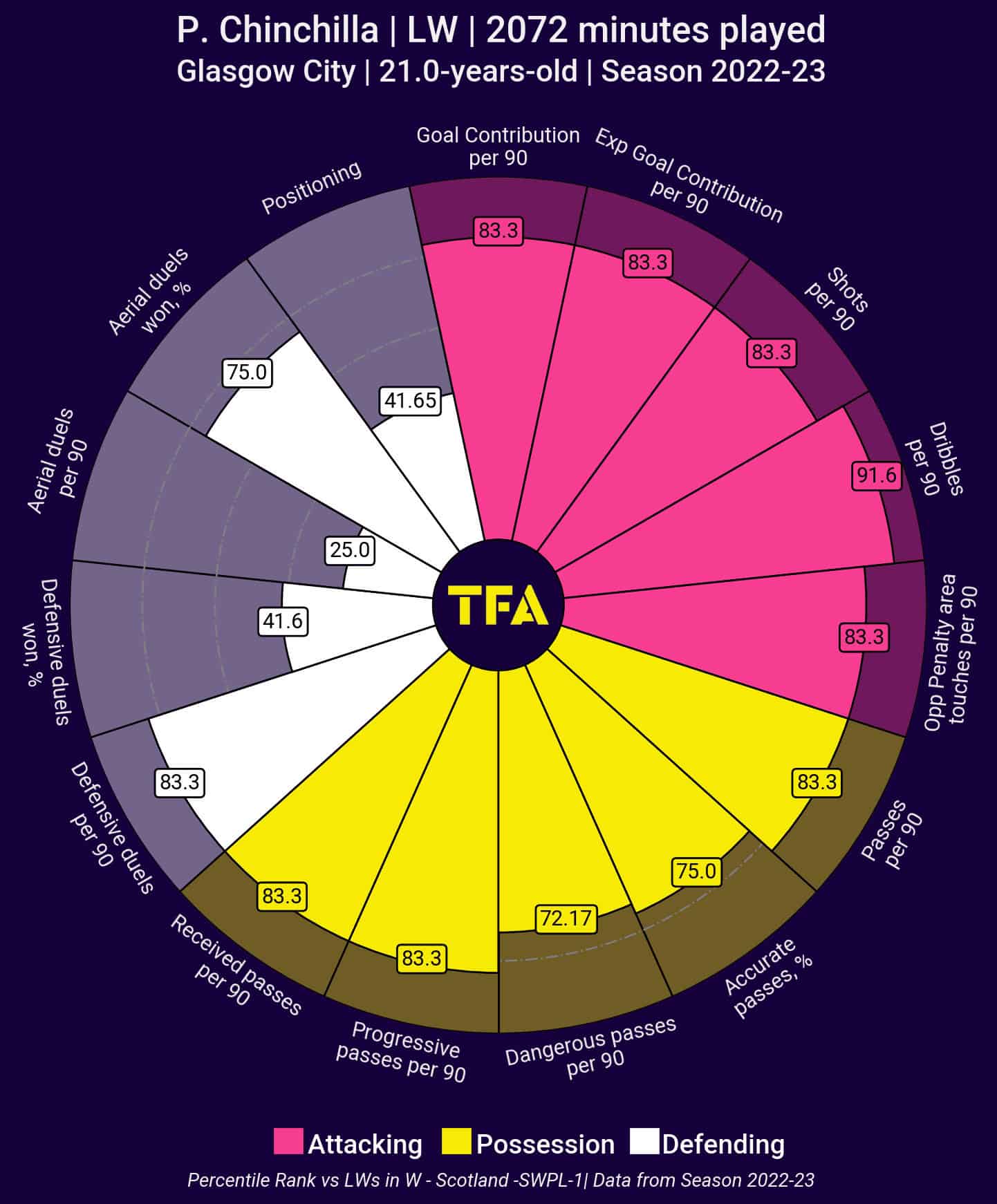 At just 21 years old, Priscila Chinchilla is becoming one of the main figures of her club, Glasgow City, and this season scored 14 goals. She isn’t tall and has some difficulties in aerial duels. In fact, according to the above radar she ranks in the 25th percentile in these types of scenarios. Yet, physically, she is very agile, explosive and capable of handling the opposition’s charge.