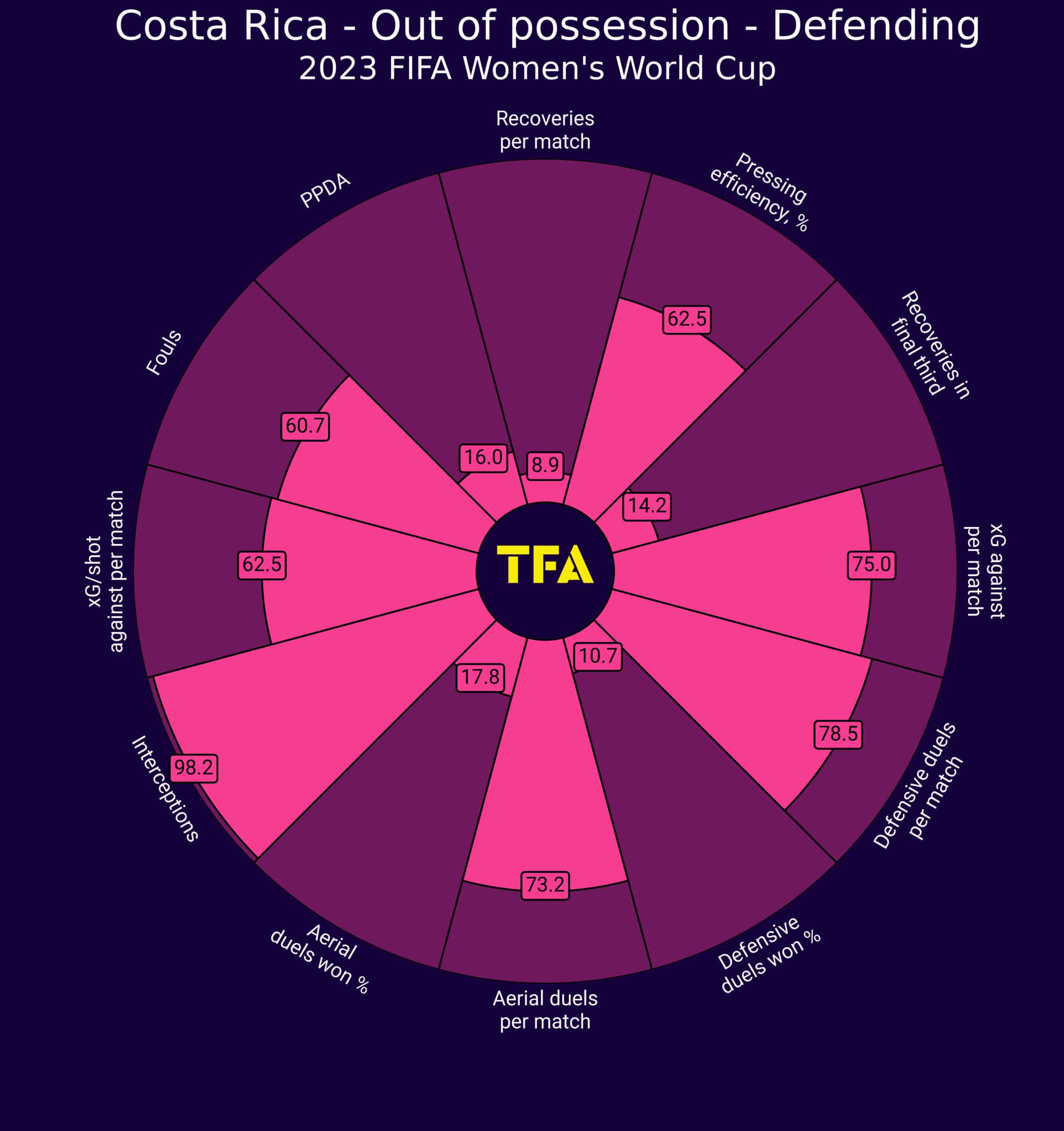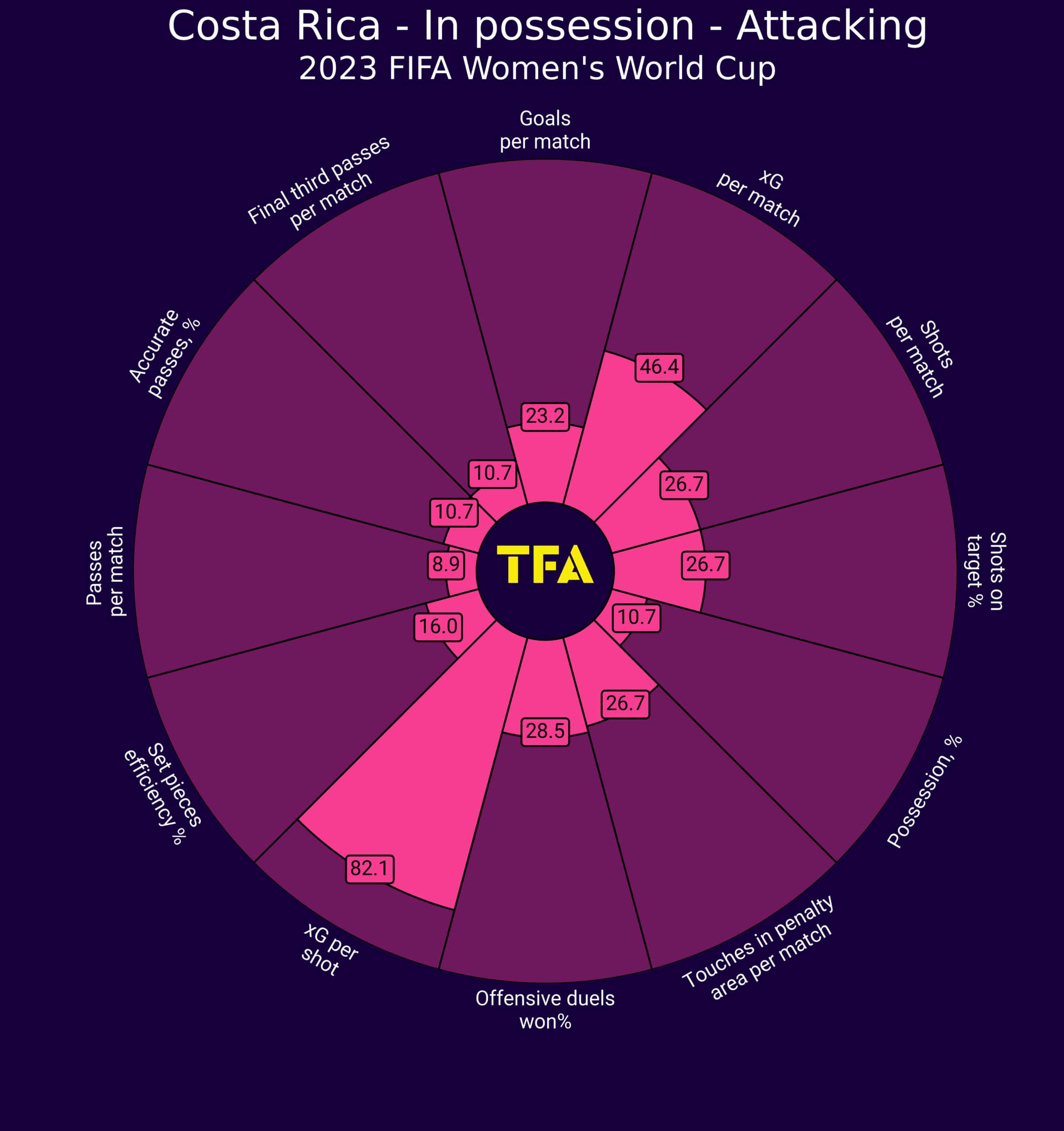 Looking at the radar above, it is noticeable that Costa Rica have difficulties in creating goalscoring opportunities while they are in possession, where they rank in the 10.7 percentile for final third passes per match. Yet, they present pretty good stats concerning the xG and xG efficiency, where they rank in the 46.4 and in the 82.1 percentile respectively.