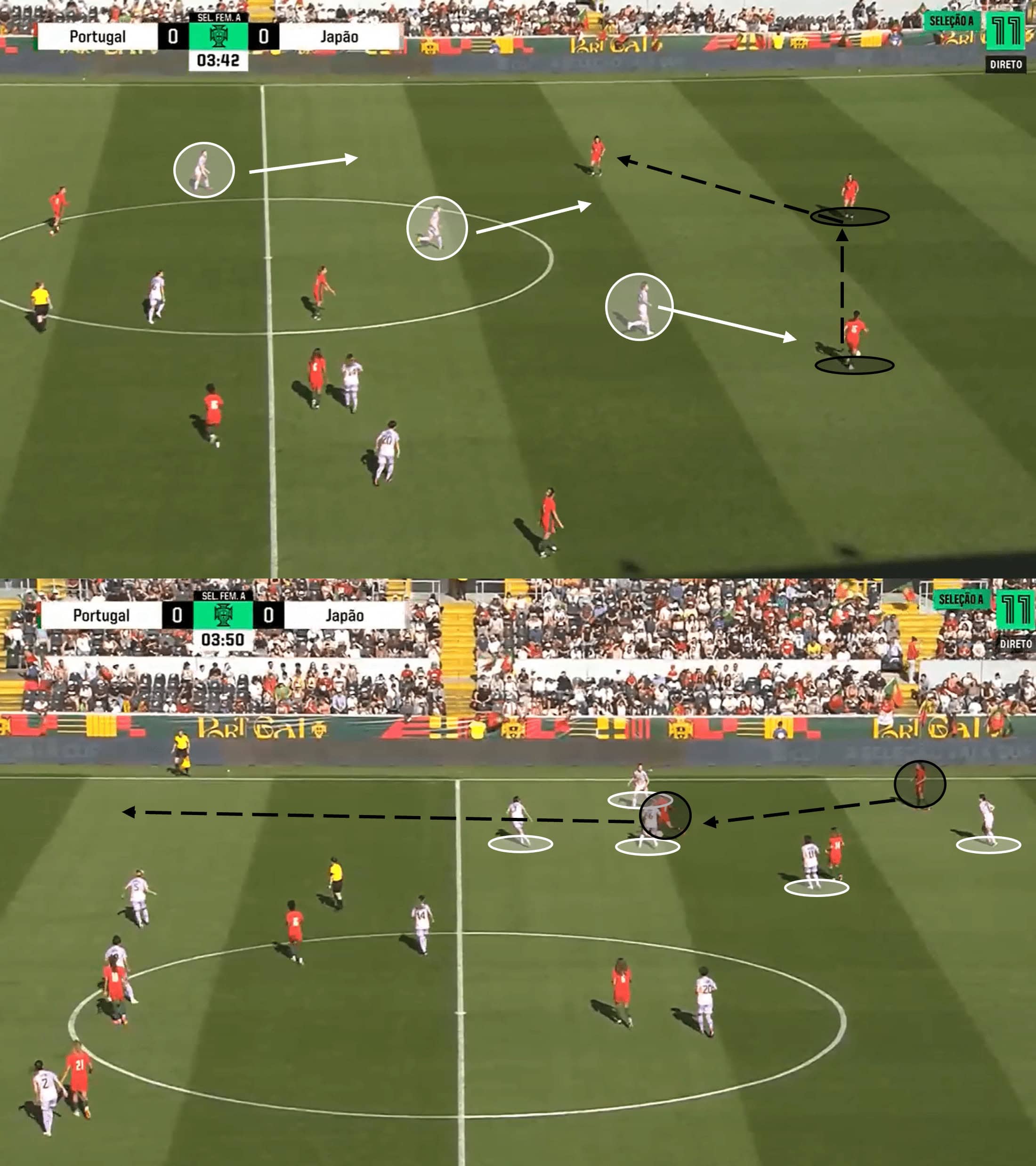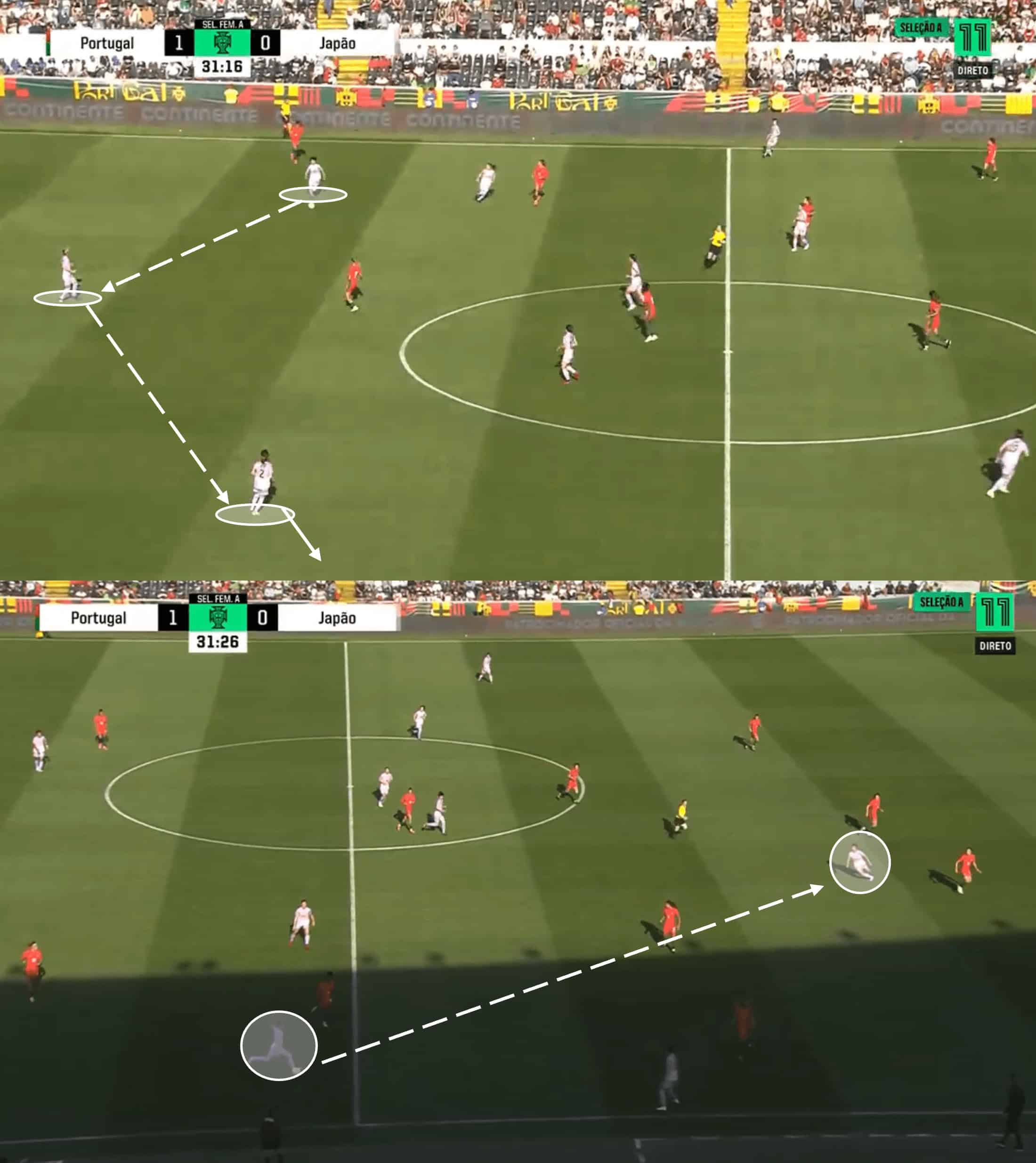 We see that movement and urgency to progress in the example above. After a turnover in the Japanese half of the pitch, they break forward quickly via good individual ability. Despite the ball being on the right flank, the situation alerts Japan players even on the right flank to ready themselves to be involved in this quick attacking transition. They will use the opponent’s momentary disorganisation to exploit space and create numerical overloads where possible, with this particular example seeing Japan seamlessly shift possession from the right flank near the halfway line to the left flank near the penalty area.