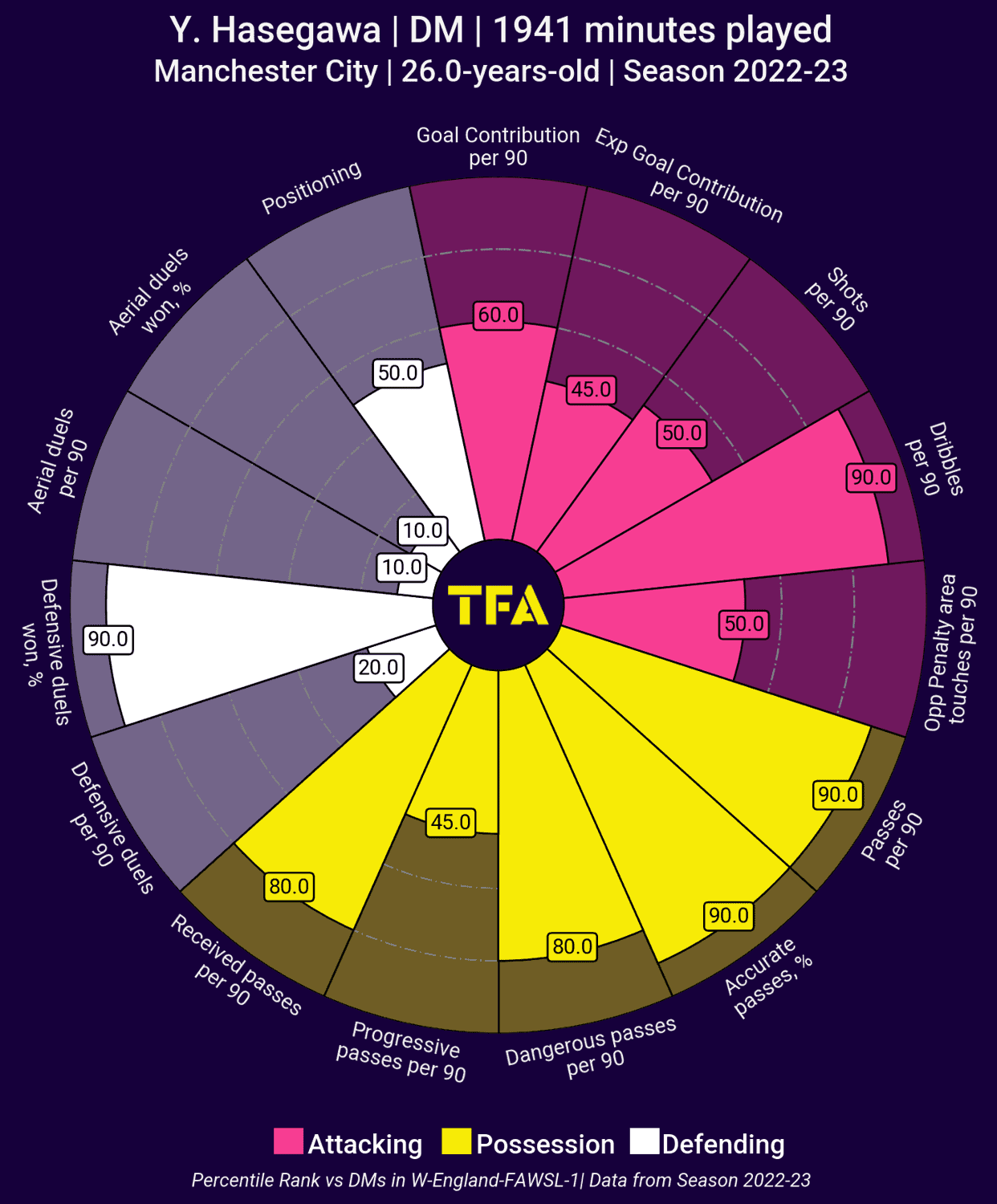 There are a few players in the Japan squad who have the potential to fire their team to glory and create problems for the opposition, but Manchester City midfielder Yui Hasegawa could be the real key to success. The data above is taken from her domestic football with City, where she has shown consistency and quality in several key areas.