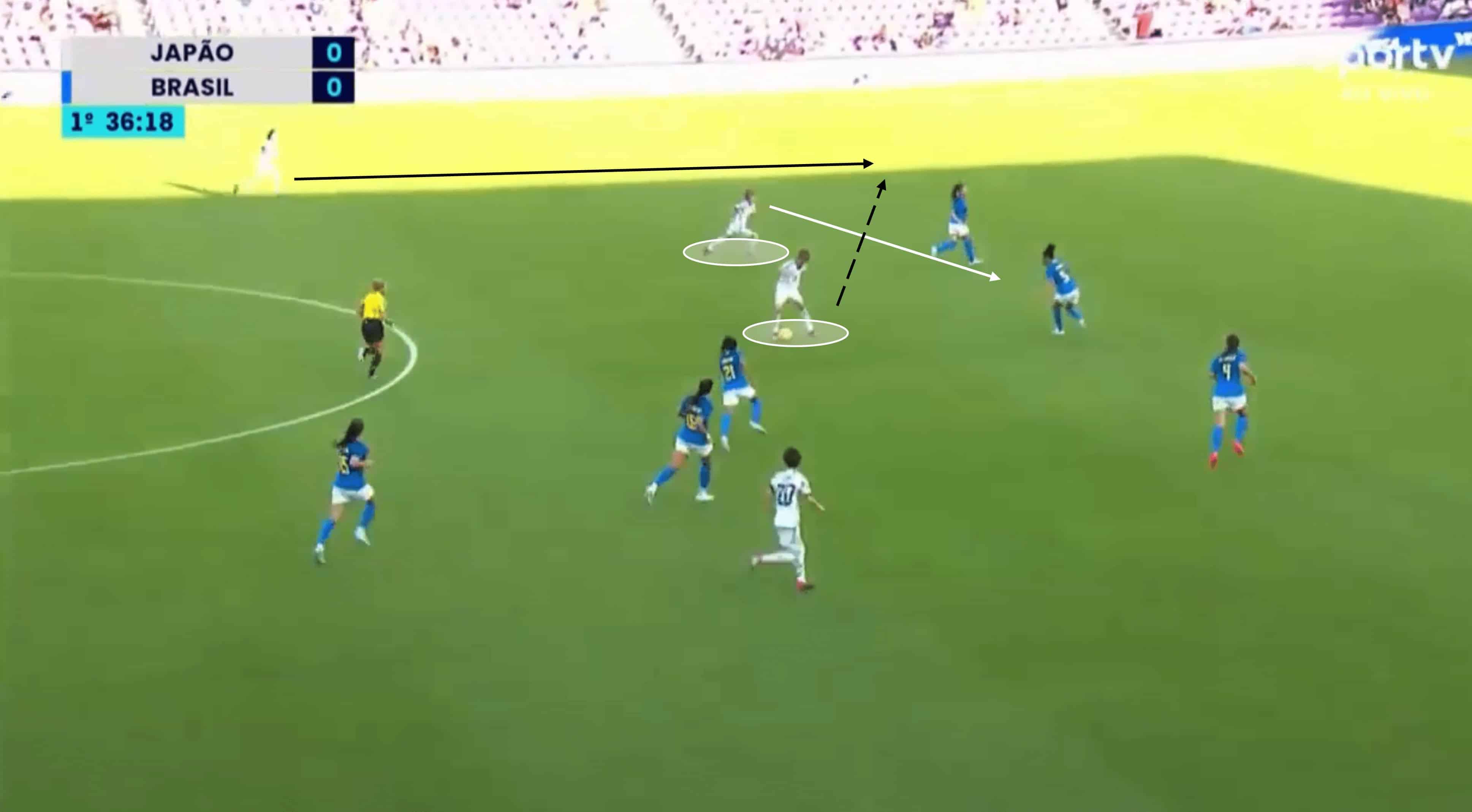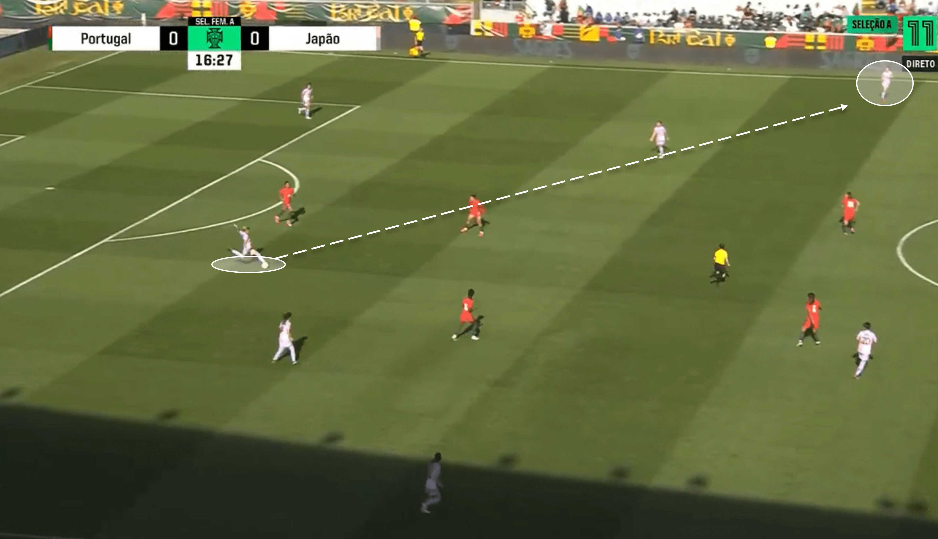 Their formation plays quite nicely in some moments of attacking transition. Bear in mind that they would have defensively set up a few seconds prior — their positioning will be a lot more effective and beneficial than that of the opposition who are rushing to regroup. Thanks to this, along with Japan’s use of wing-backs, they have the element of added width, which they introduce with the long run from the LWB, as seen in the example above.