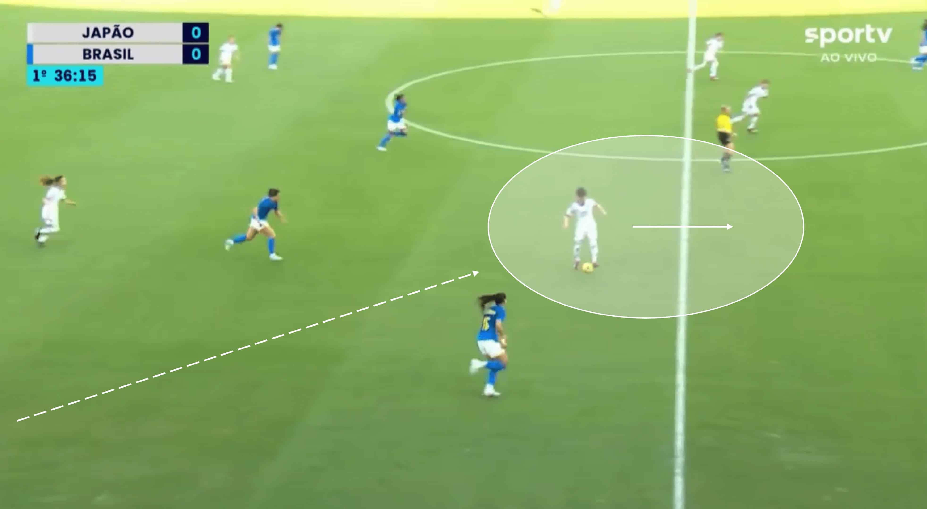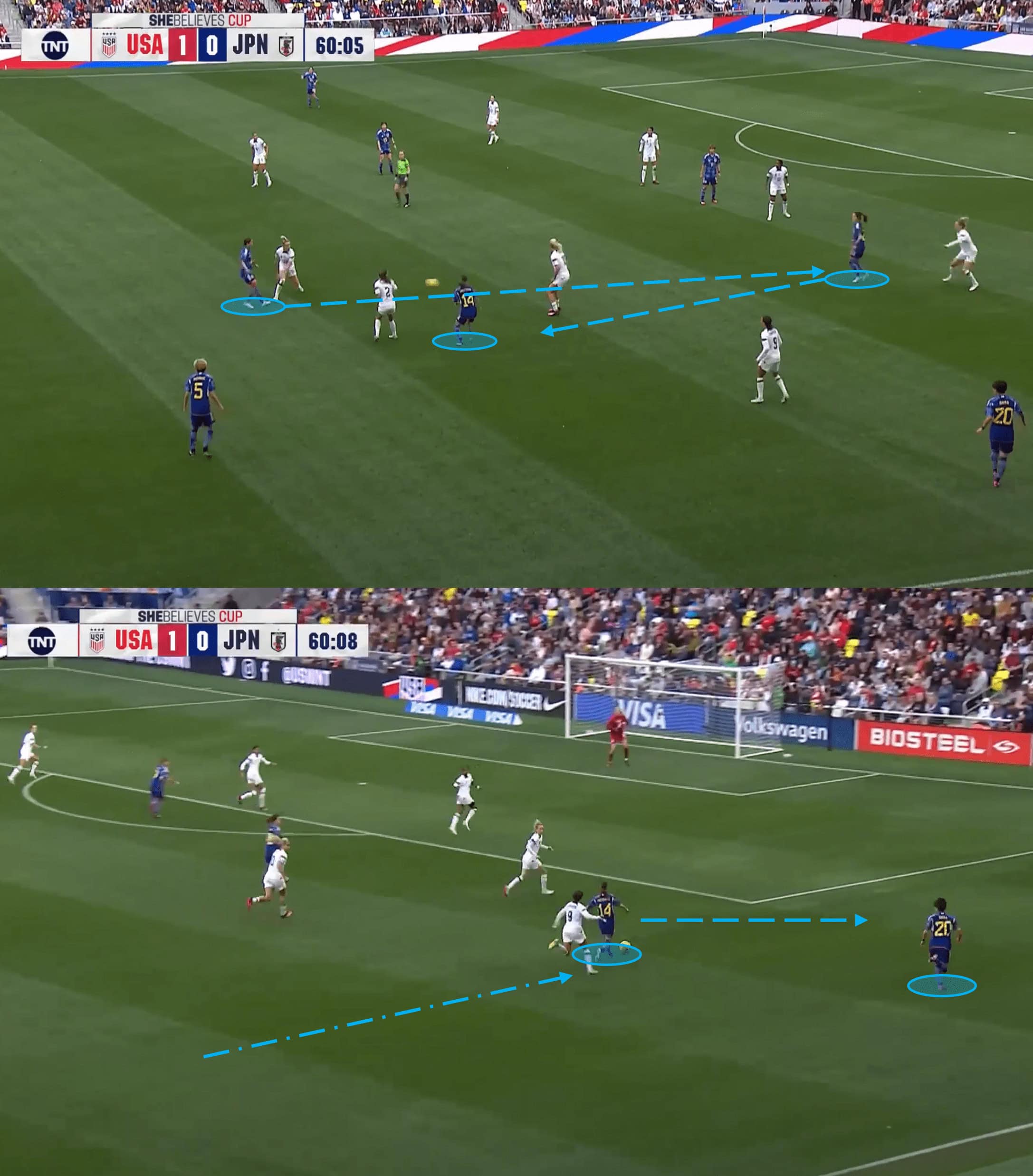 The player that would be the RCM amongst the highlighted players could have been sucked into pressing the closeby USA player when she receives the pass, but that would’ve opened up space for the opponents to attack. To combat this, the deeper midfielder (LCM), rushes in to press the player instead. This gave Japan’s midfield unit the stability and defensive structure needed to not only slow down the USA but limit their options even moreso.