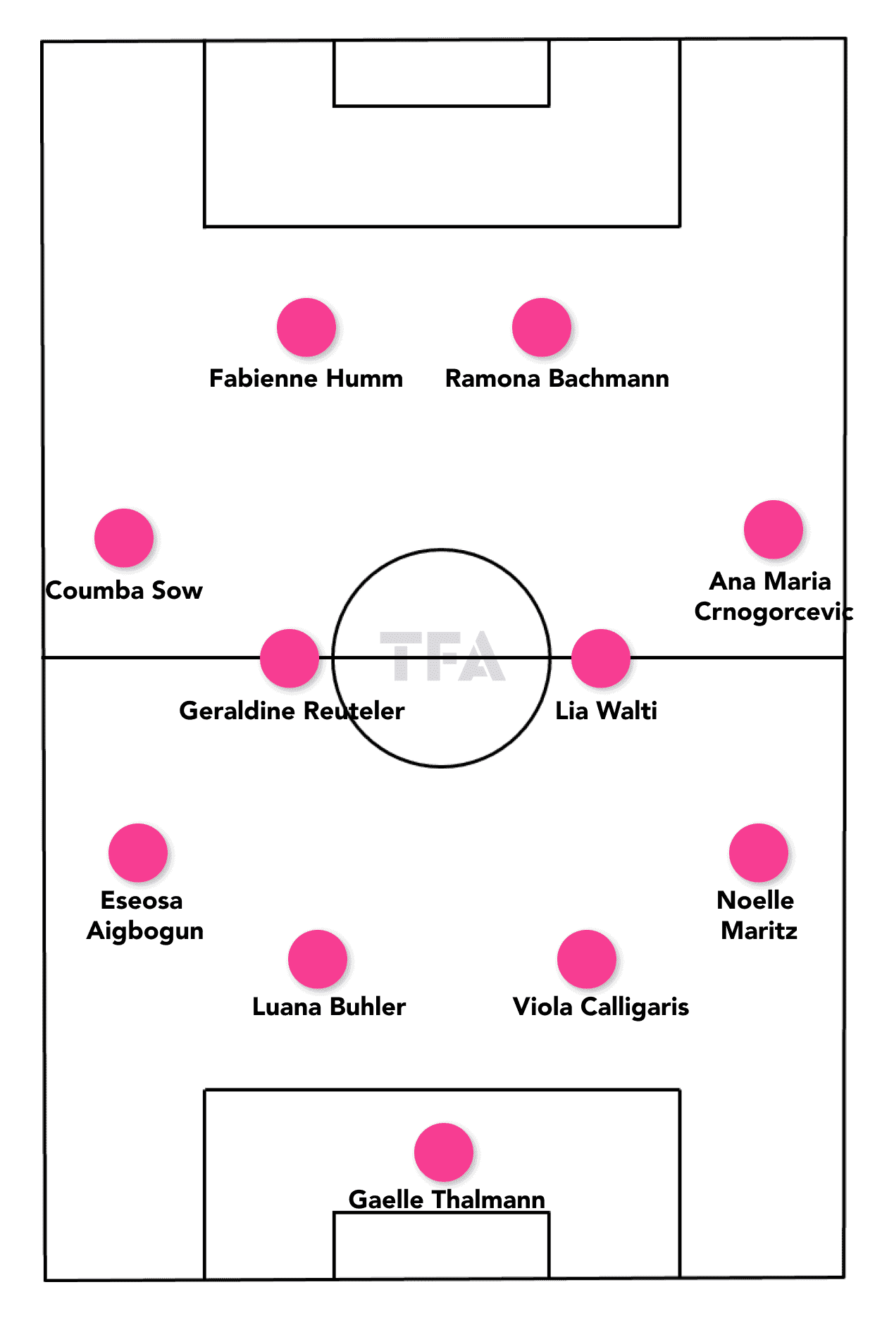 Ramona Bachmann is the star leading the frontline, probably alongside veteran Fabienne Humm. Among other options in the squad, Aston Villa’s Alisha Lehmann is likely to be an alternative to Humm. At the back, Noelle Maritz and Eseosa Aigbogun are the full-backs with Viola Calligaris and Luana Buhler as centre-backs.