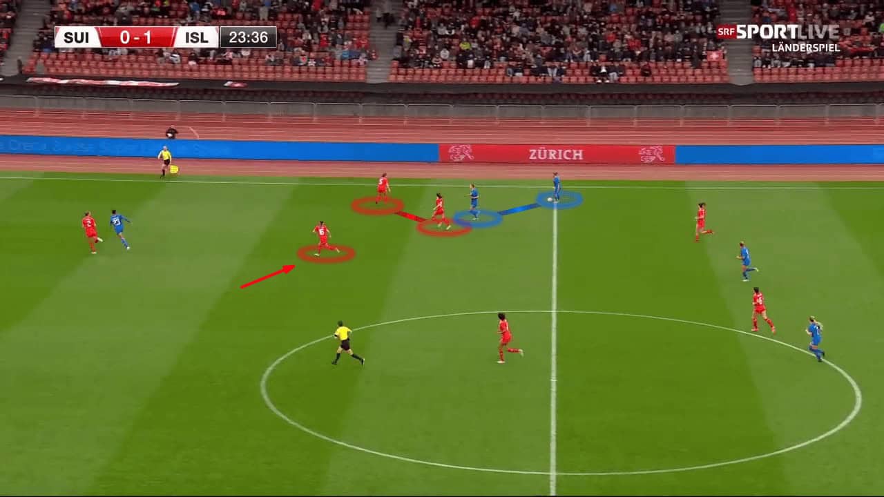 Most of the time, after recovering the ball, the Swiss look to retain possession and establish their attacking organisation. For instance, below, they look to play backwards and away from pressure, slowing the tempo and reasserting control.