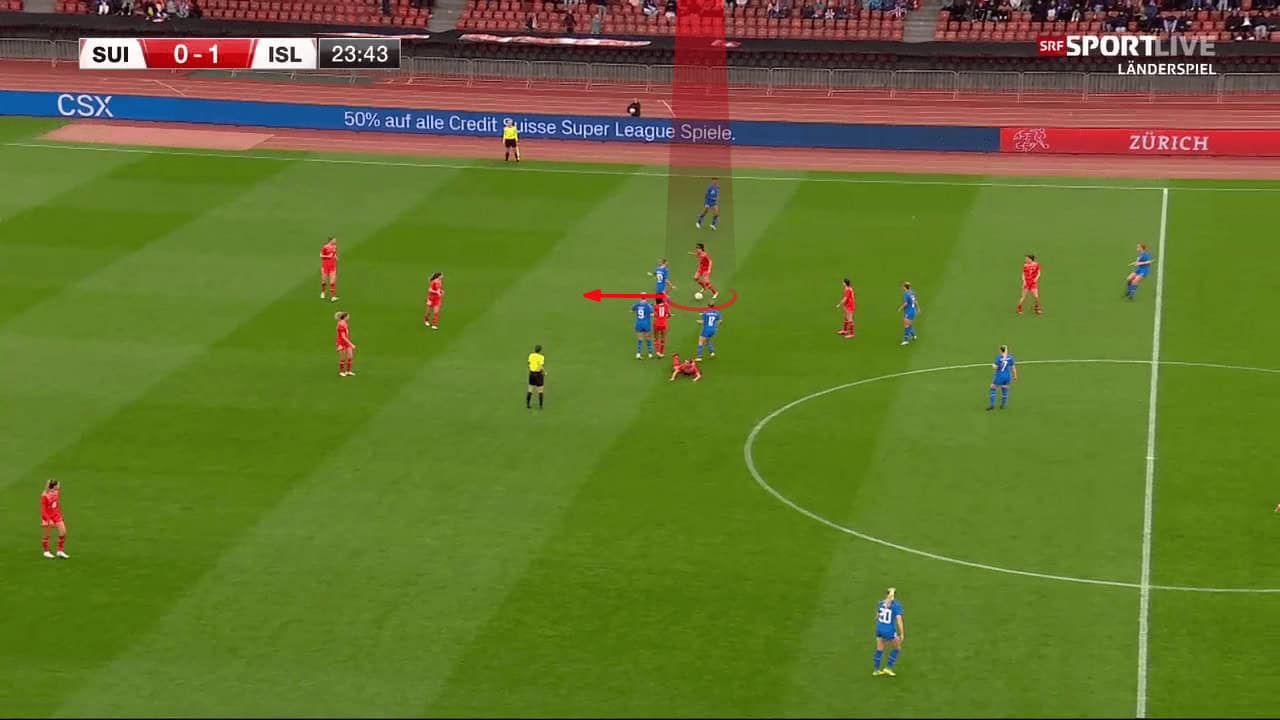 The two central midfielders, Arsenal’s Lia Walti and Geraldine Reuteler, function in opposing roles. Walti is the deep-lying midfielder while Reuteler plays more advanced, almost as a traditional 10. With the two players at opposing ends of the midfield, the wide midfielders serve to form a diamond (1-2-1) or a simple 1-3 shape. The exact formation is not as important as understanding the wide midfielders are not wingers, but midfielders.