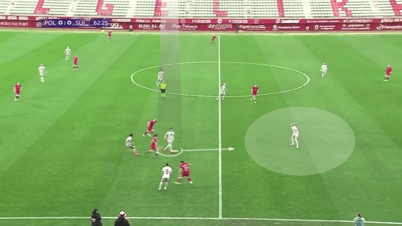While the advanced midfielder initially steps up alongside the centre-forwards, her positioning is more conservative, often marking the deepest midfielder rather than jumping to apply pressure. As a consequence, they are often able to have superiority in the midfield, with a 4v2 in the image below for instance. Depending on where the ball goes, they pass players on and maintain a zonal system. This allows them to instantly cover the wide areas while eliminating the options inside.