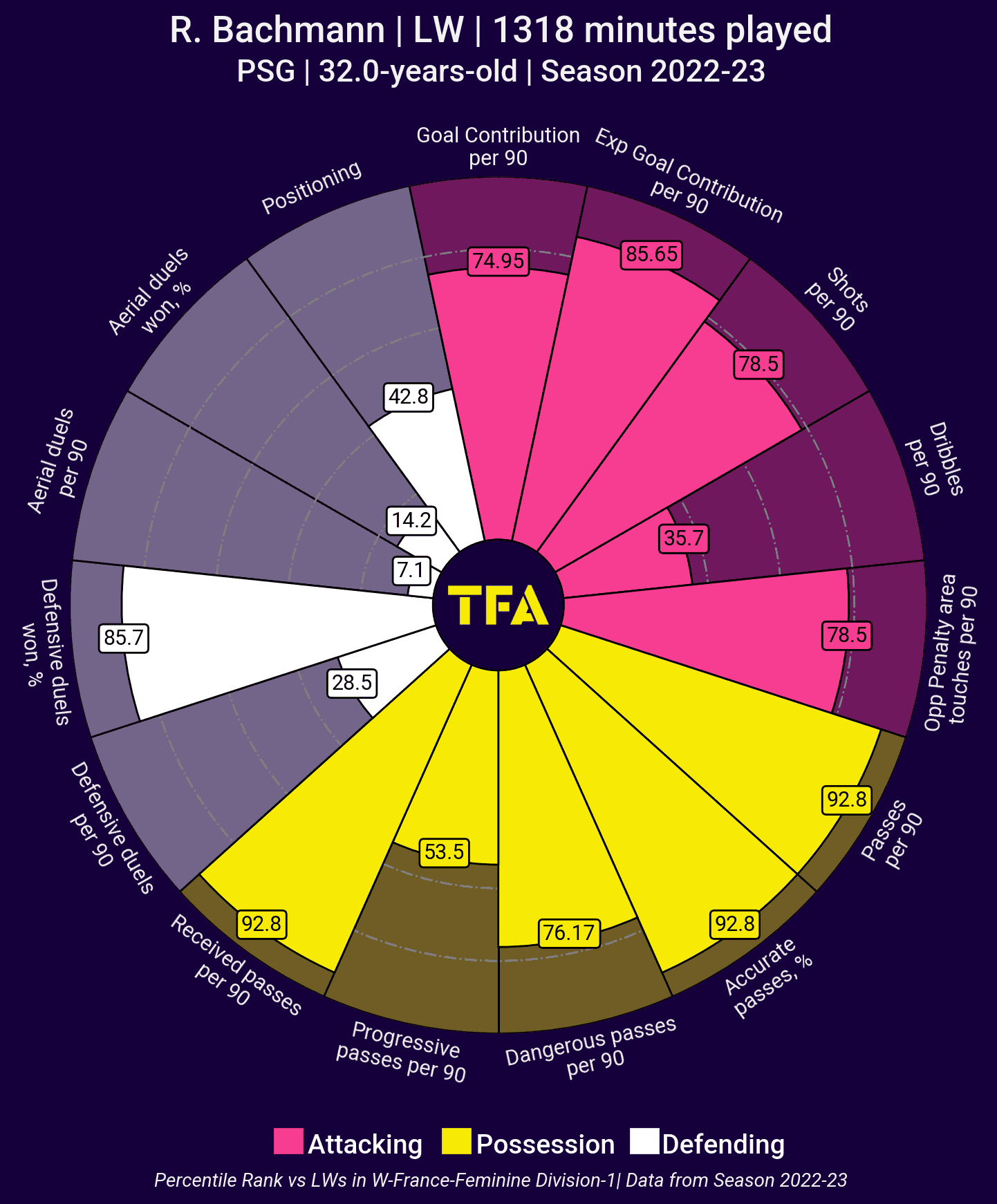 PSG’s Ramona Bachmann should be Grings’ most important player in the tournament, with the veteran star proving to be one of the most consistent players in the national team. Her contribution in the final third is undeniable, highlighted by the attacking section in the image above. In addition, the centre-forward also plays an important role in possession, getting involved and creating chances for her teammates. If the Swiss are to perform well in the tournament, Bachmann will have to play a key role.
