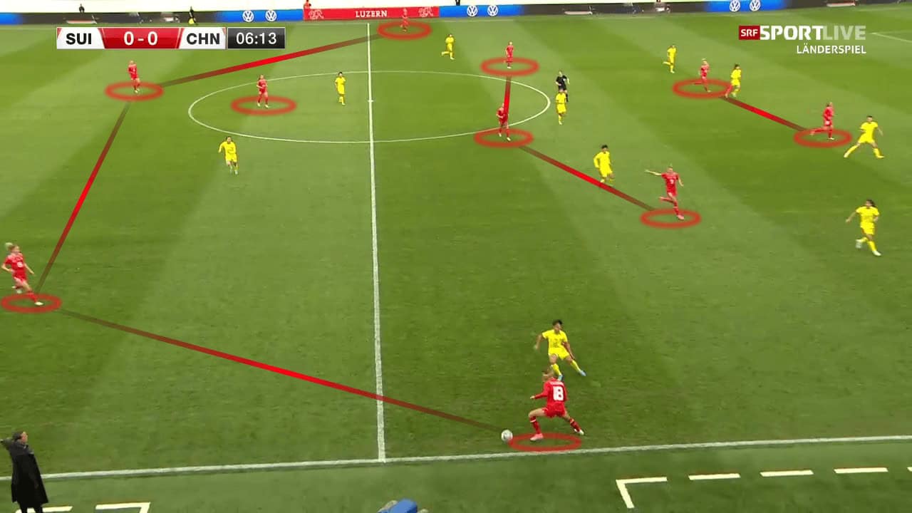 With this information, it is clear the Swiss tend to dominate possession but struggle to create high-quality opportunities. According to Wyscout, they average 58.81% possession under Grings. Dominating matches is not an issue for La Nati, but they desperately need to improve their chance creation. Nonetheless, let’s examine how this possession system works.