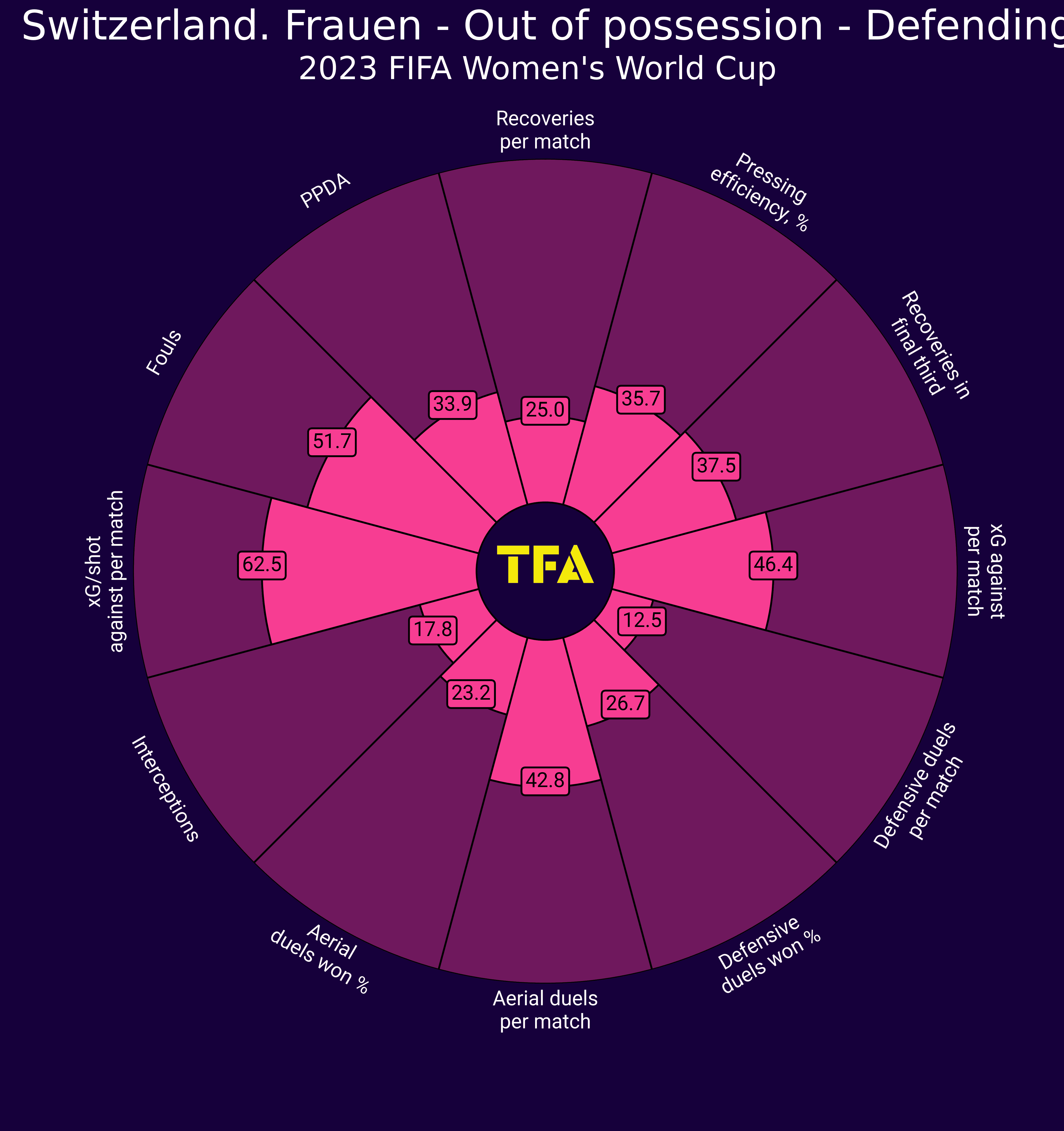 The Swiss have a more conservative defensive approach, with a very organised and dynamic block. Their PPDA under Grings is at 10.43, reinforcing this approach. Two of the three draws were 0-0 results, so their defensive system is hardly a problem. Additionally, given the exhausting nature of World Cup tournaments, their more passive approach could certainly prove beneficial.