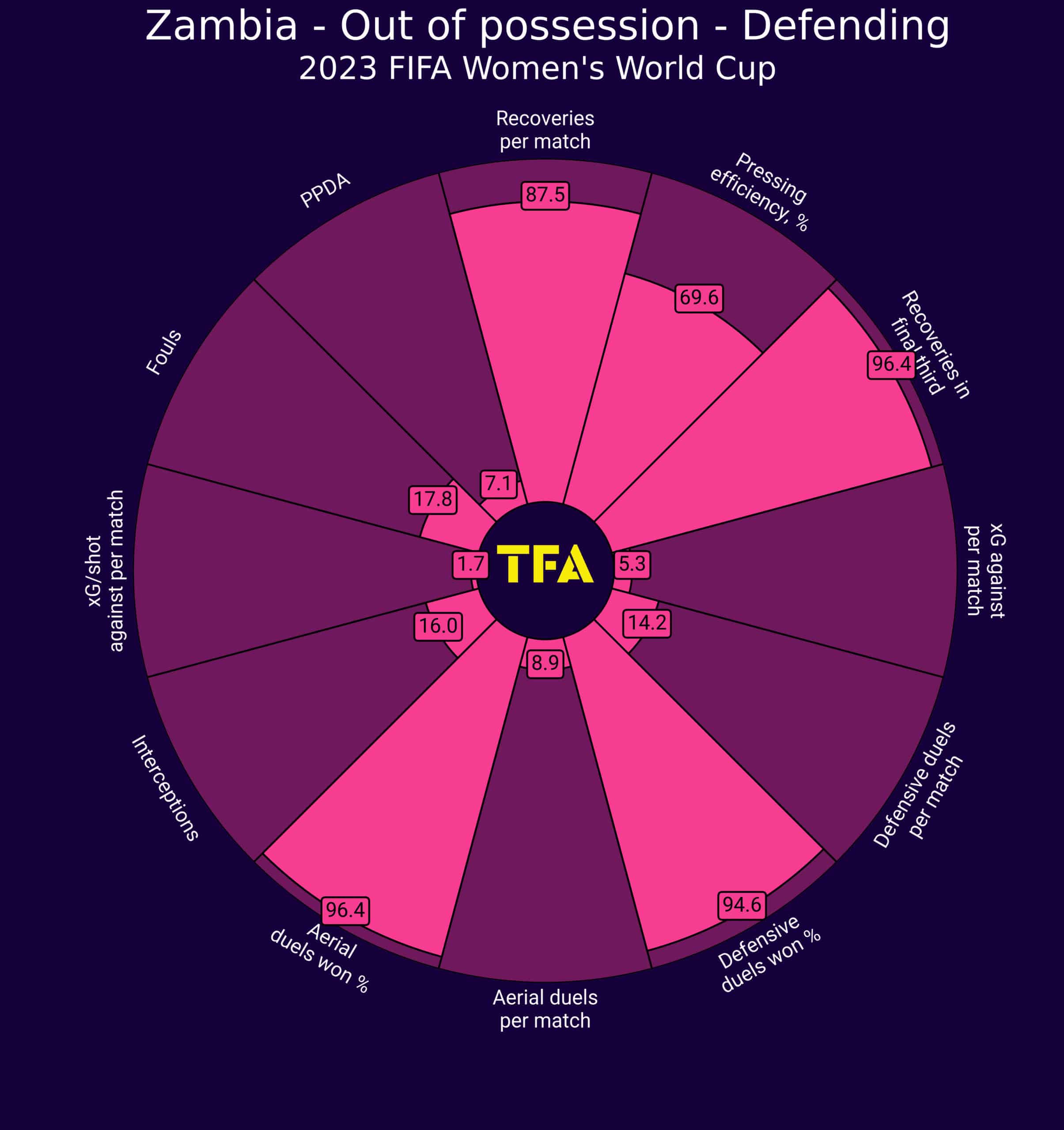 Zambia are a very aggressive side in their search of getting the ball back. The fact that they play in a low or mid-block must not distract from the fact that they’re superbly aggressive, especially freeing their FBs to steal the ball and create subsequent attacks driving it forward.
