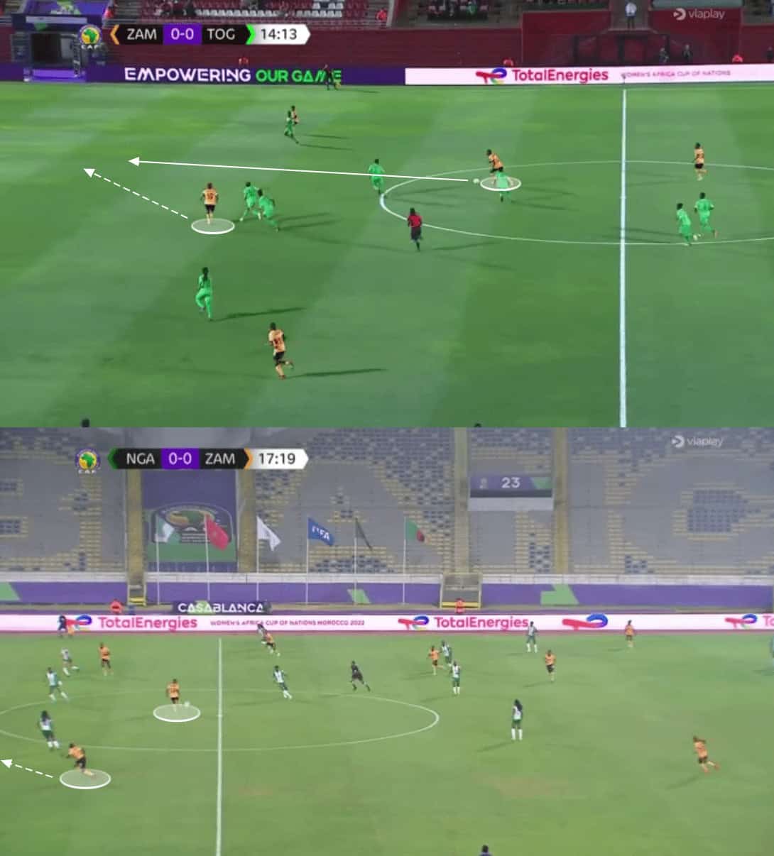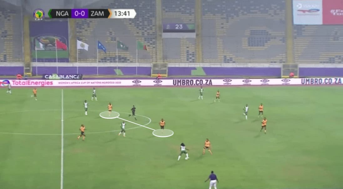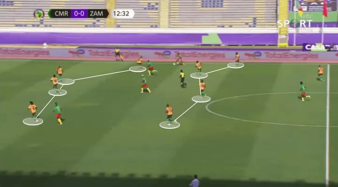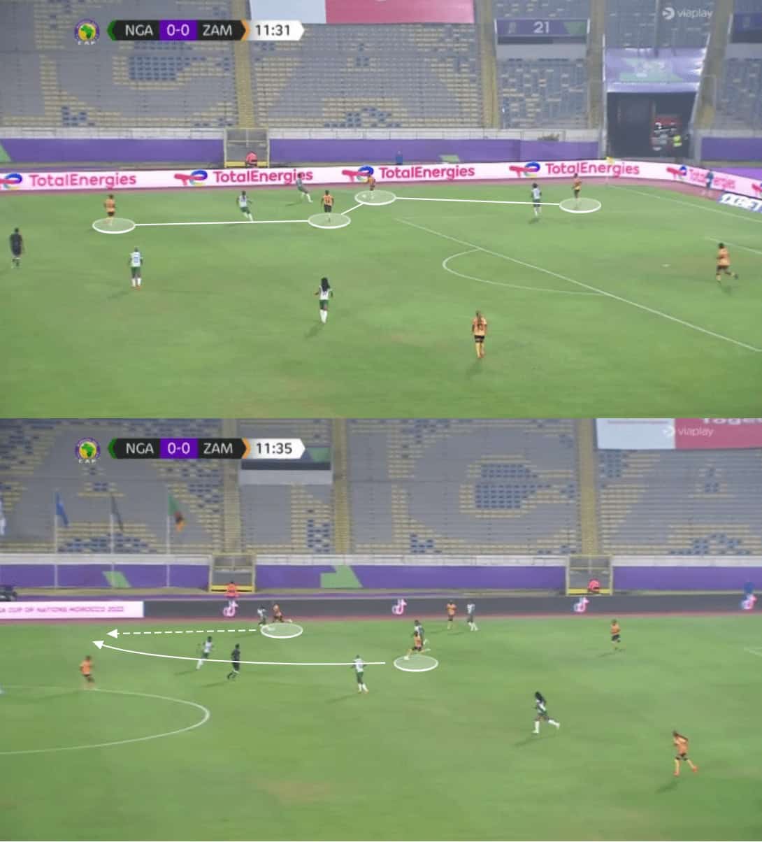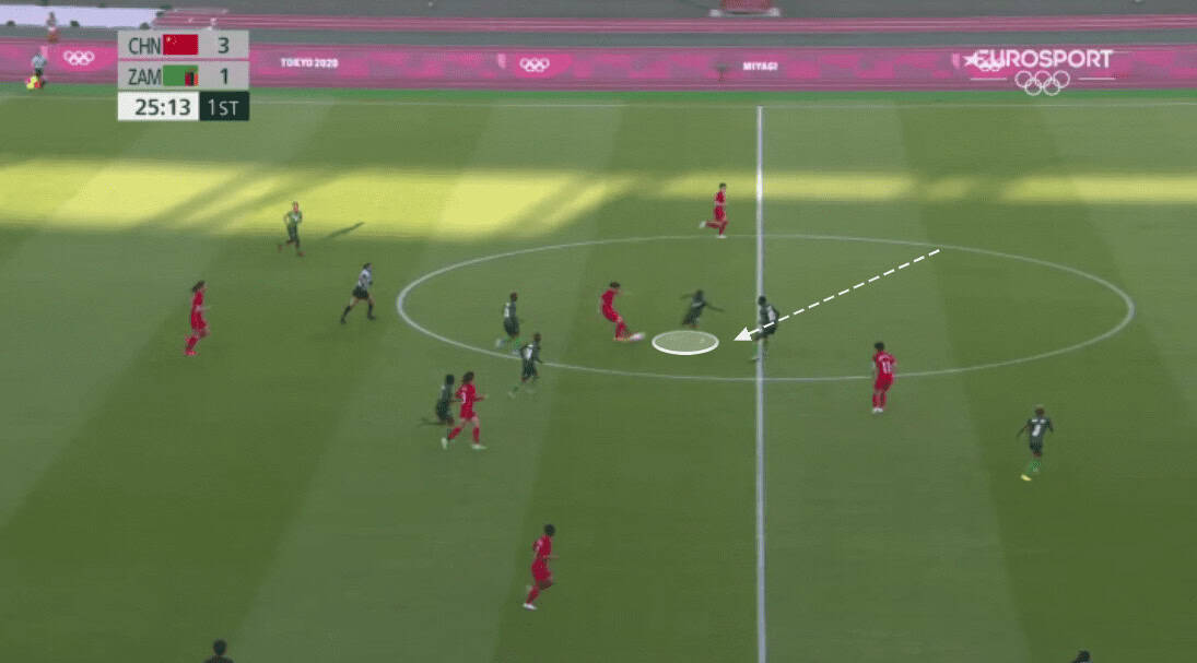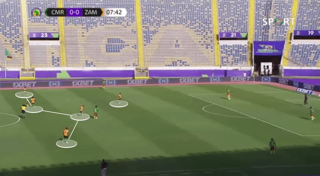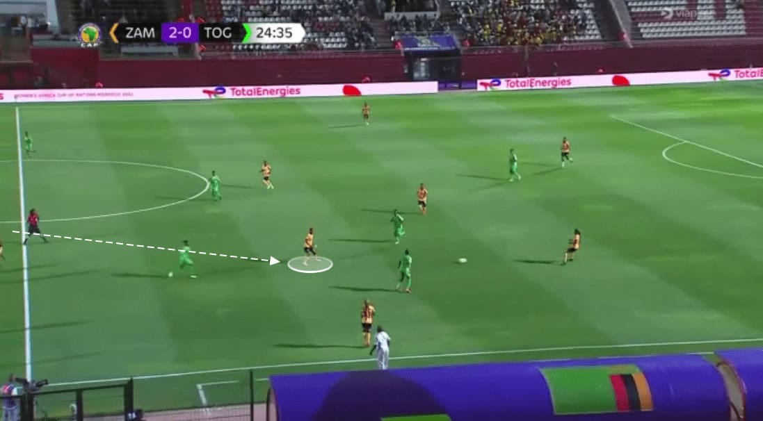 Another key for Zambia in the attacking phase is how direct they can be, skipping these first passes and varying into a pass to the CF.