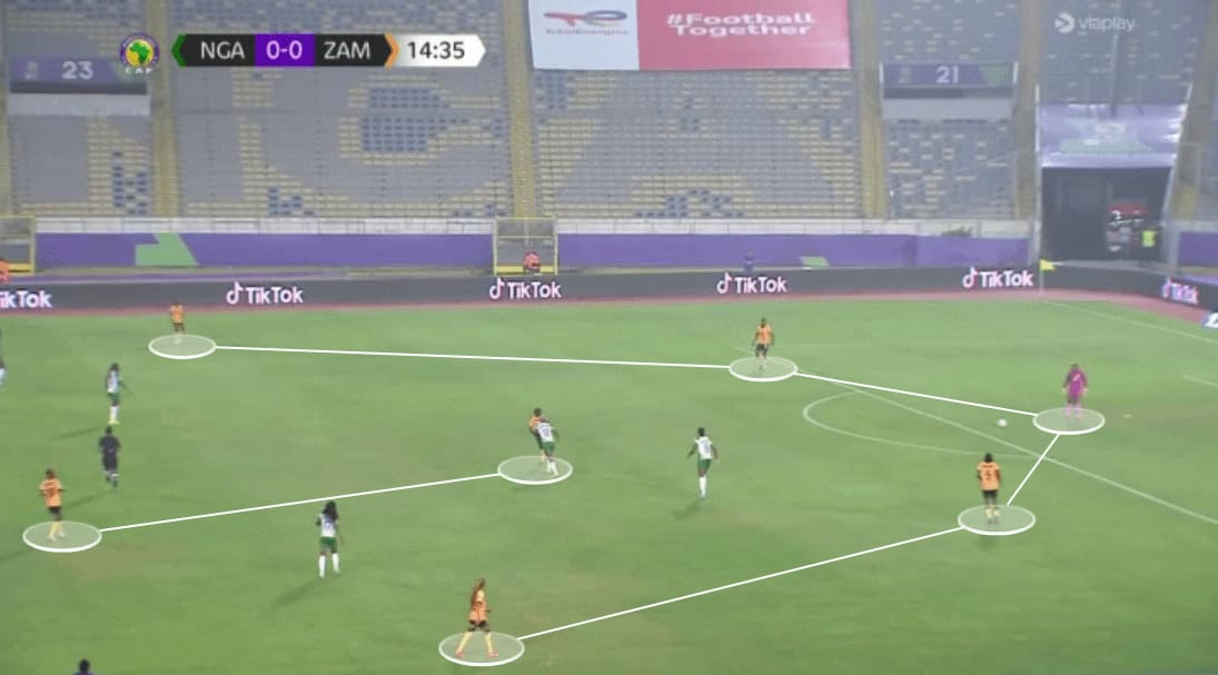 As we analyse in the last section, Zambia have suffered in the transition to defence, as their structure is not always the strongest. Their rest-defence looks to be very conservative with a 4-2, maintaining the back four always close to one another and positioned deeper, without releasing their full-backs into attack.