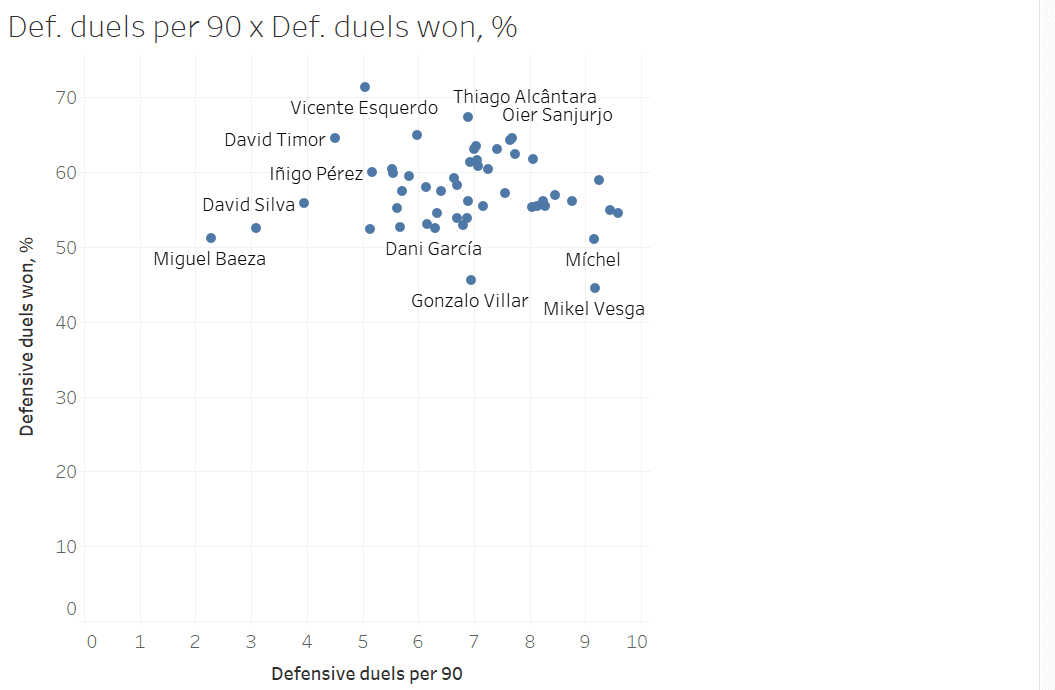 Defensive duels is not one of the main determinants to check who would play in Spain’s double pivot. Even though for a pivot it is always good to have defensive statistics, in the Spanish team it is not so important, but it is a great additional strength to have.