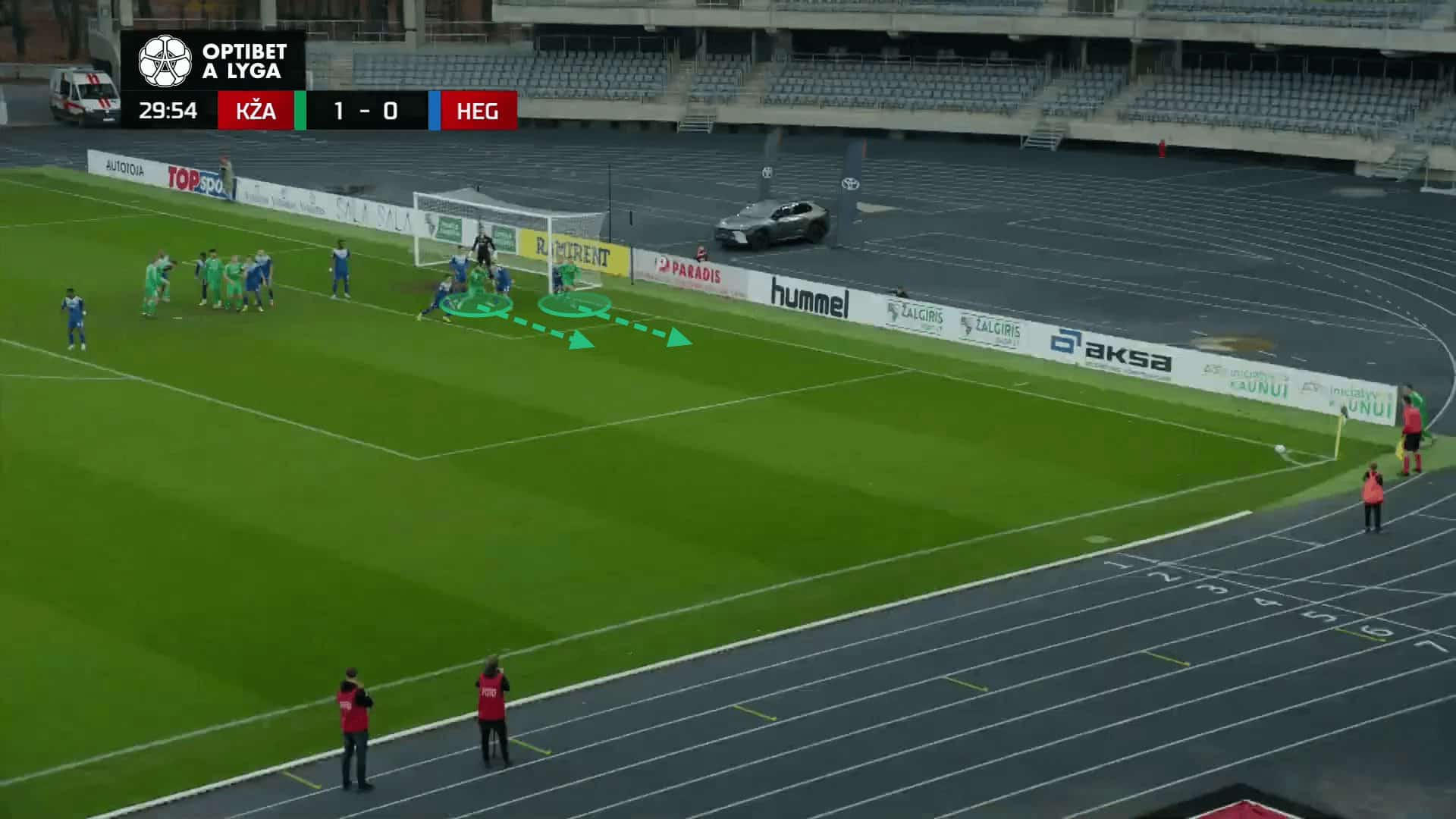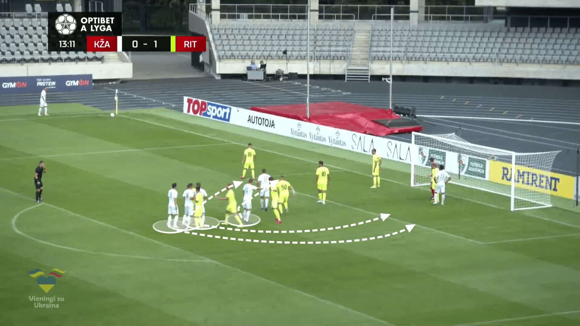 In general, the aim for one of the decoy runners is to move across the zonal defender into his view as the corner is taken, where the defender then follows the run, thinking the ball is meant for that run. One of the issues which Kauno Žalgiris have had, limiting the overall number of set-piece goals they had managed to score last season, was with the timing of the decoy runs in relation to the position of the zonal defenders.