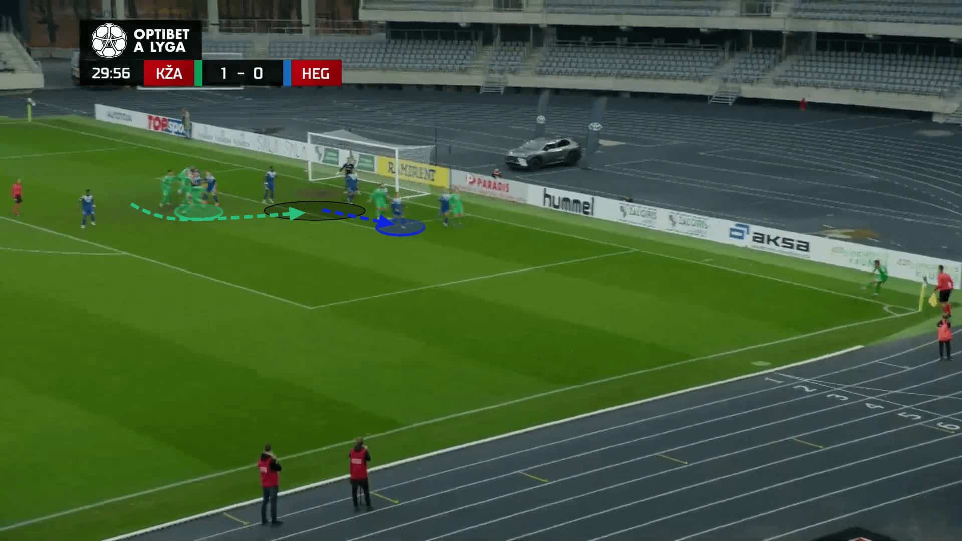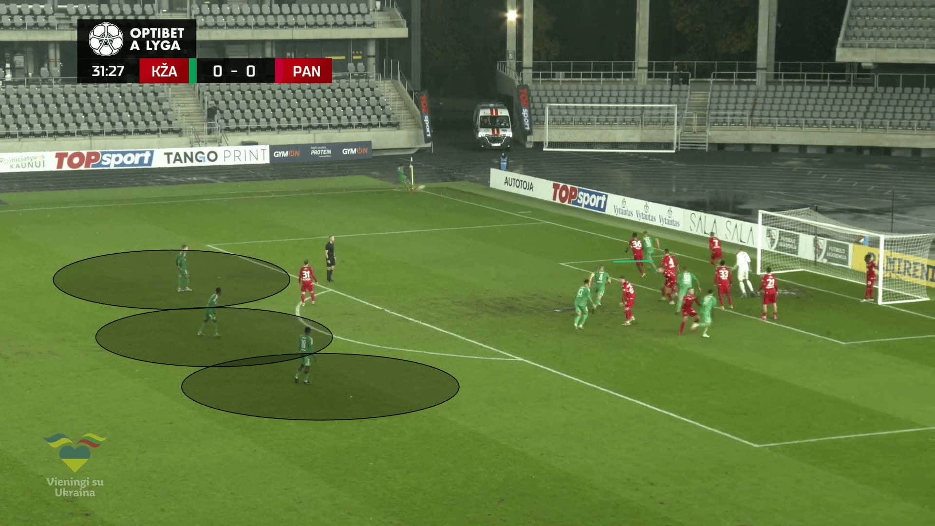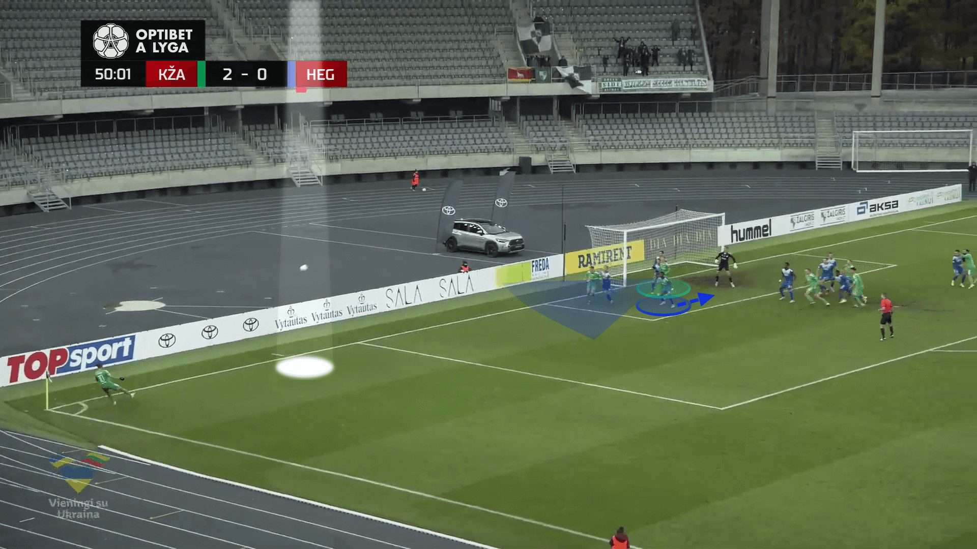 This gives Kauno Žalgiris added possibilities of making the first contact, whether that is through a flatter cross being met by an oncoming decoy player or inside the six-yard box by a player arriving in the space the zonal defender vacates, following those decoys.