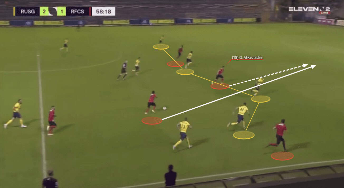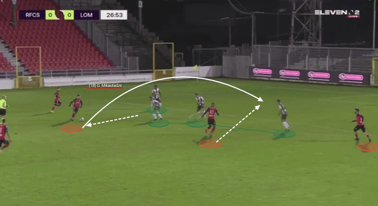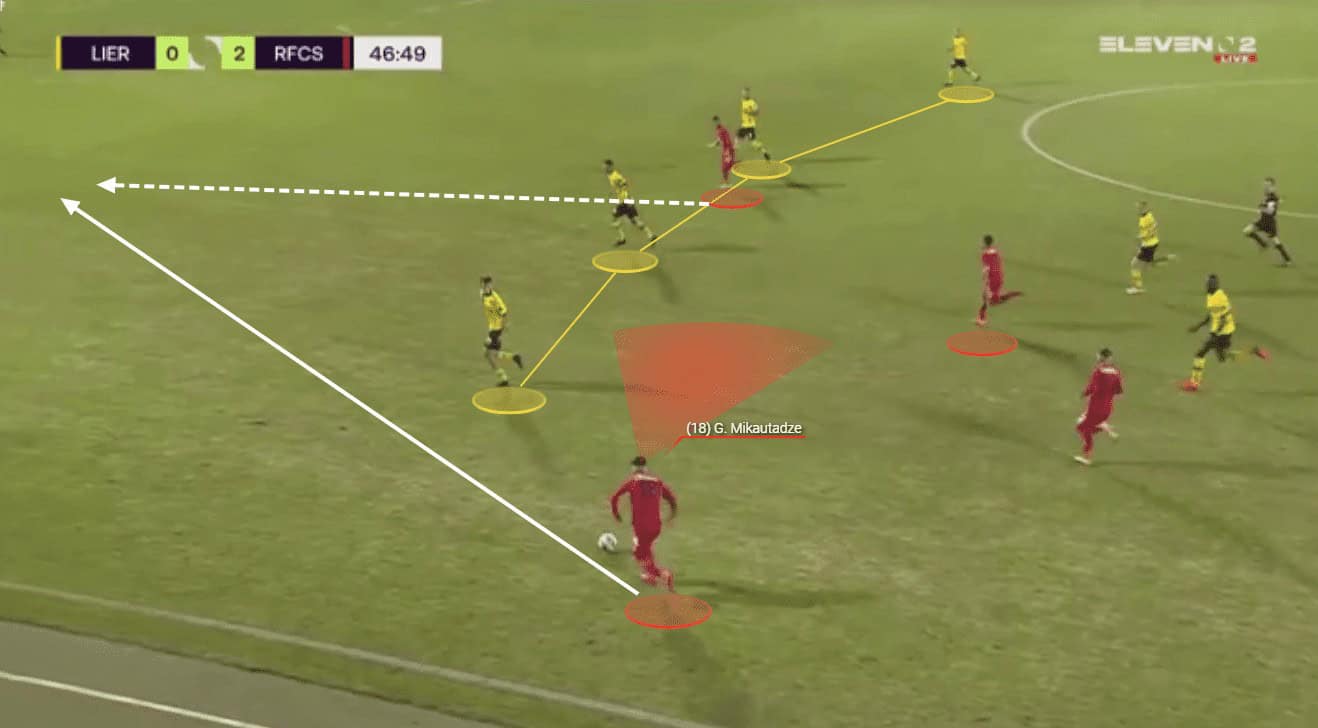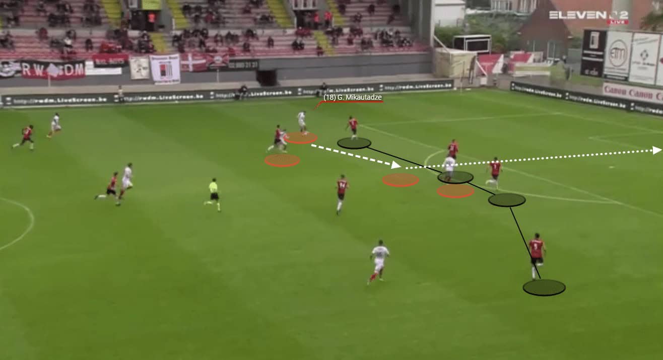 Mikautadze is also excellent when it comes to helping his side to progress the ball through the thirds with his passing range and vision. We can see an example of this here as the young forward has collected possession of the ball wide on the left-hand side.