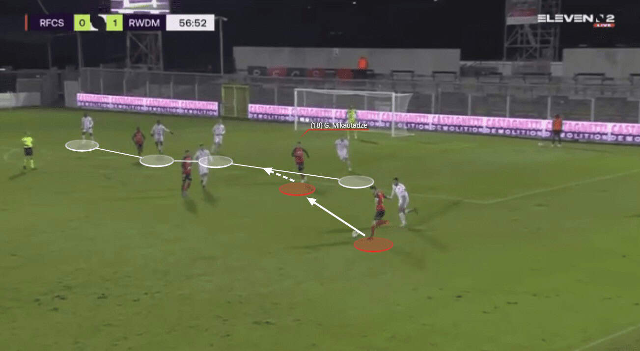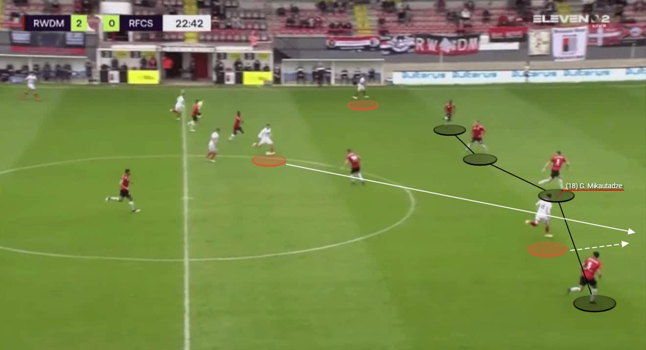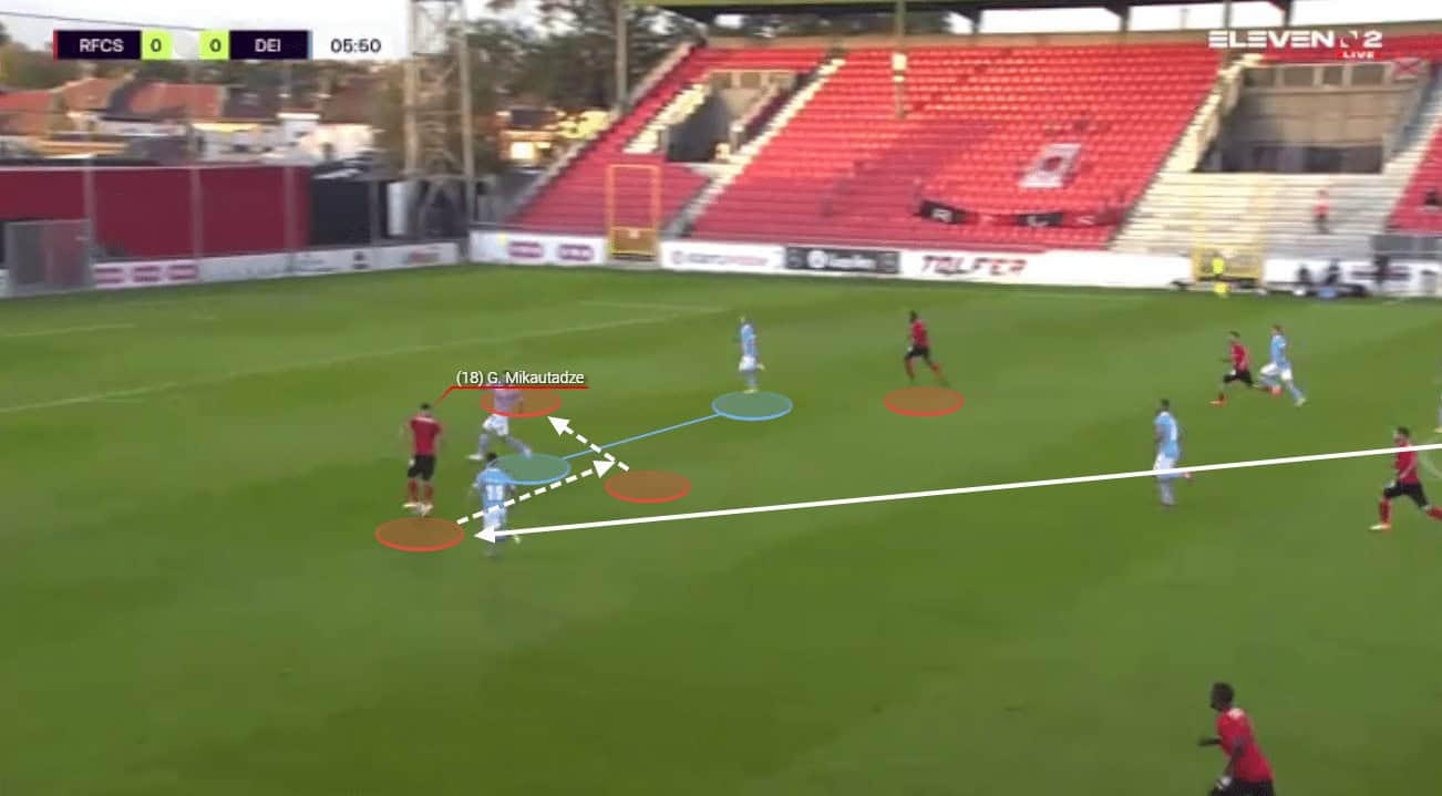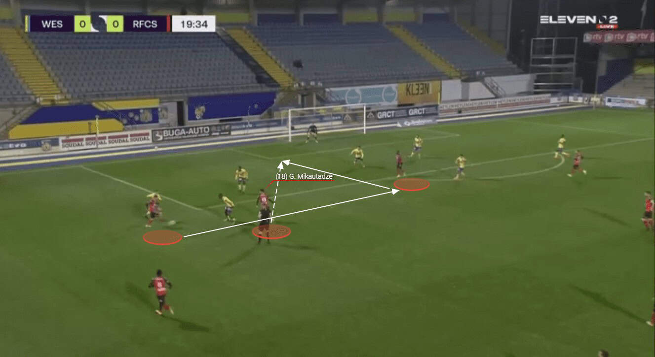 Mikautadze is also excellent when it comes to helping his side to progress the ball through the thirds with his passing range and vision. We can see an example of this here as the young forward has collected possession of the ball wide on the left-hand side.