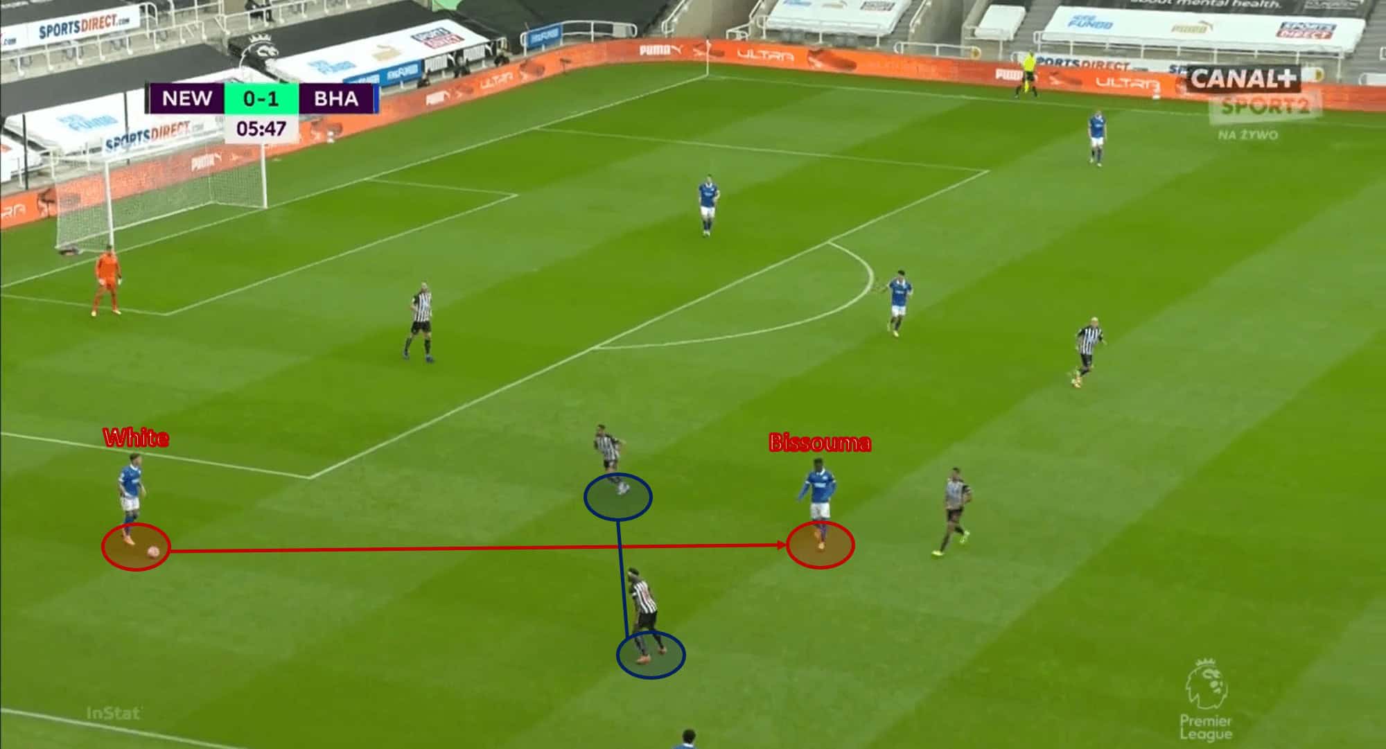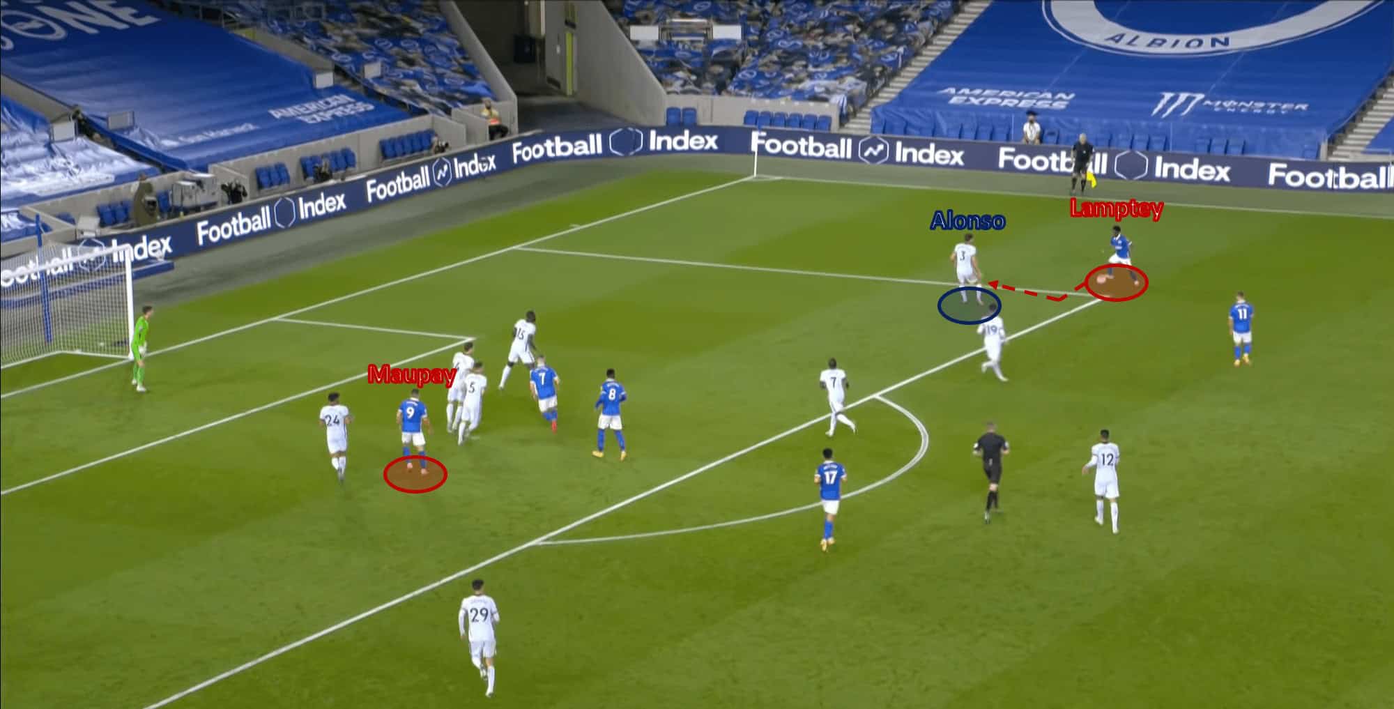 In this zone, Lamptey can breeze past Alonso with his deceptive footwork, and aim for Maupay in the box with a driven cross.