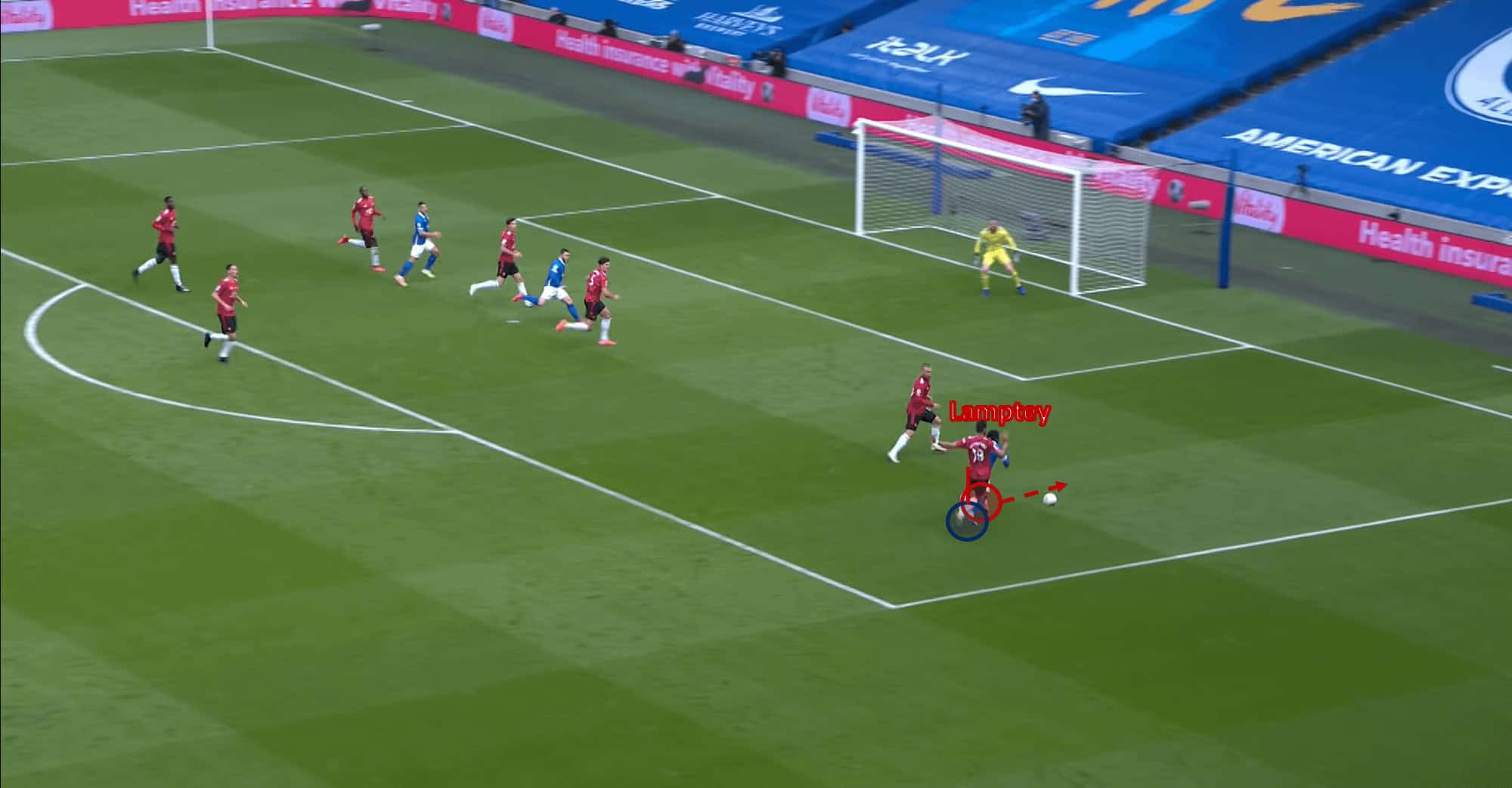 Racing into the box, Lamptey is too fast for his opponent, Bruno Fernandes, who clumsily collides into the 20-year-old to concede a penalty.