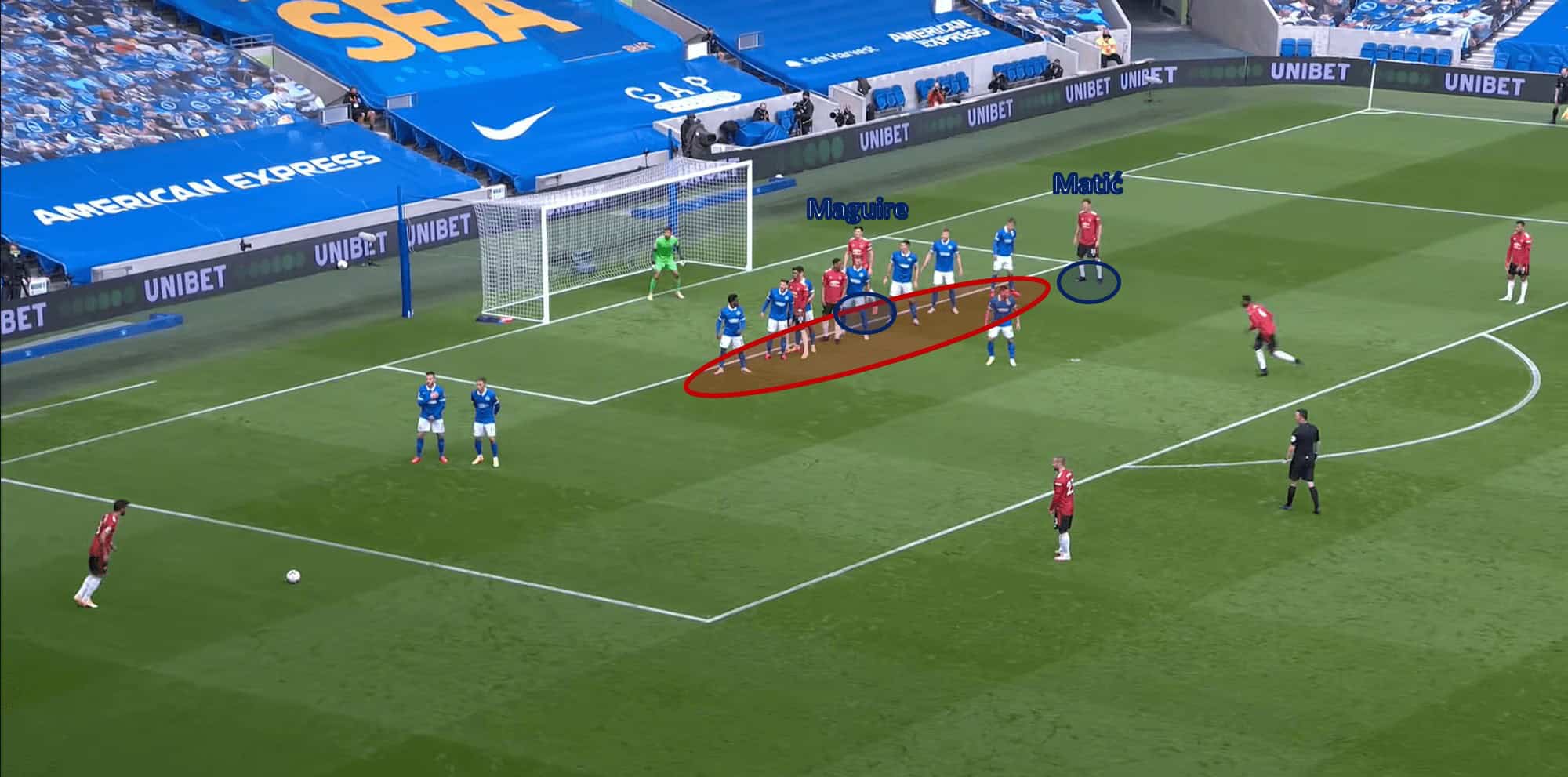 In a sort-of zonal-marking system, Brighton neglect Nemanja Matić in space, and Harry Maguire’s clever movement backwards keeps him onside for an easy tap-in for United.