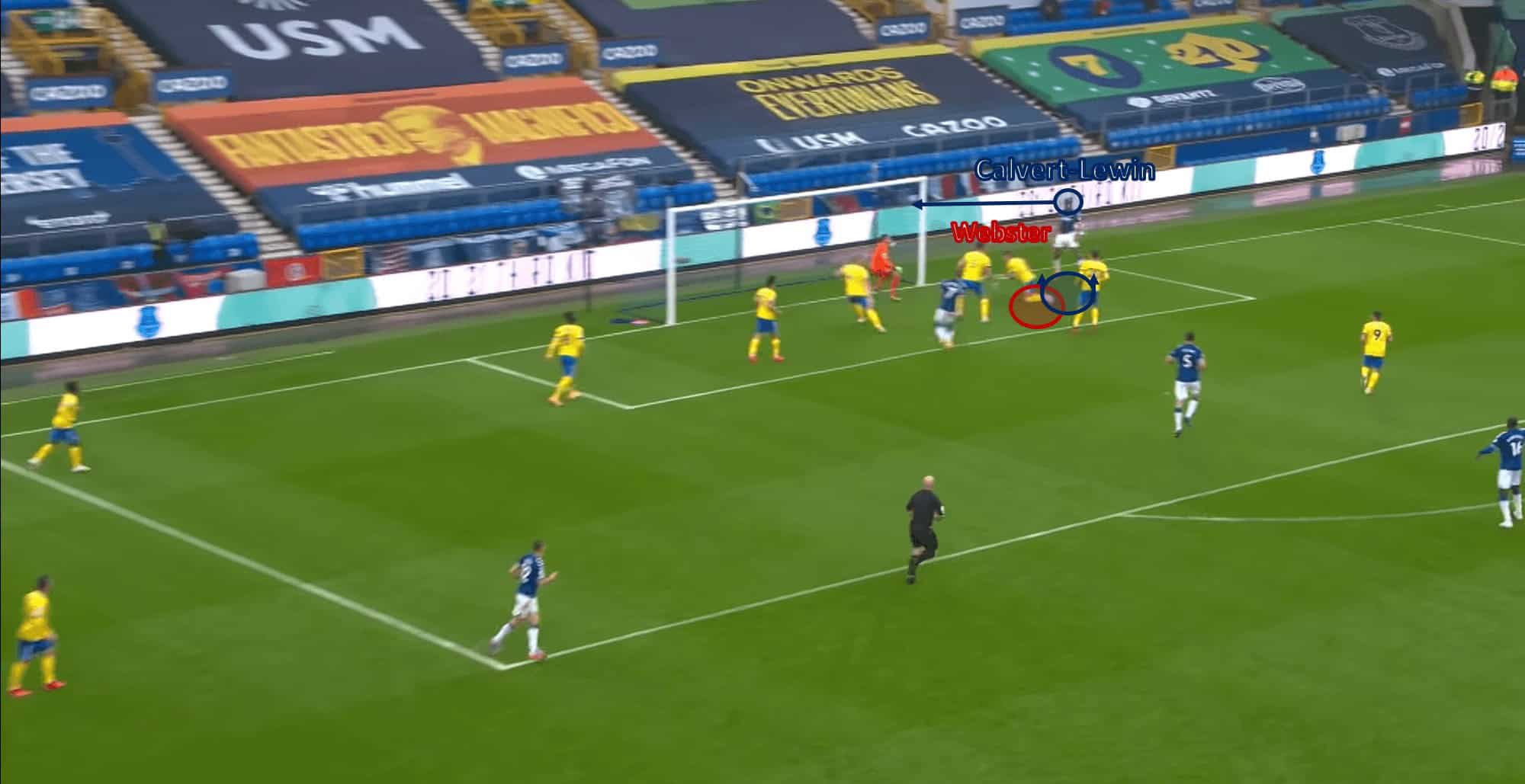 Despite Adam Webster being a very good centre-back on the ball, he fumbles here aerially, allowing Dominic Calvert-Lewin to leap and reach the lobbed cross into the box for a goal.