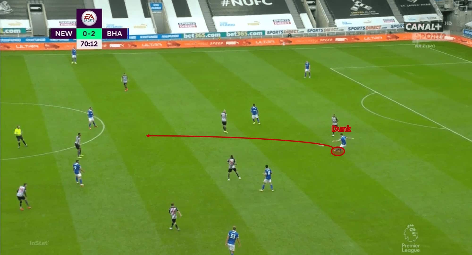 Dunk, inside Brighton’s half, spots Connolly dropping into space, which triggers another Brighton attacker to run into the channel.